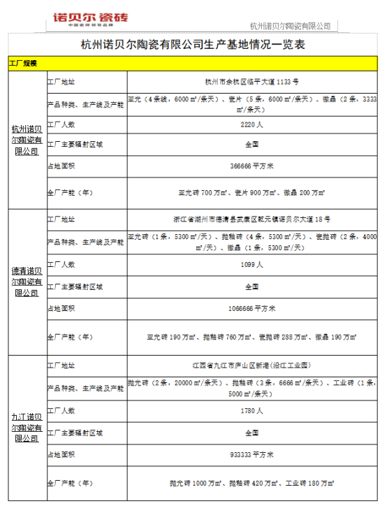 诺贝尔瓷砖成立于1992年,总部设在中国杭州。自2003年起连续十三年单品销量全国领先!诺贝尔一直专注高端瓷砖,坚持技术领先,旨在成为“全球最优秀的装饰用品供应商”。目前公司总投资超4.3亿美元,拥有三大生产基地,占地2300 余亩,厂房面积80 万平方米,年生产规模近5000 万平方米。目前,旗下拥有诺贝尔瓷抛砖、诺贝尔、塞尚•印象三大知名系列,产品分别涵盖瓷抛砖、陶瓷板材、陶质釉面墙地砖、瓷质釉面墙地砖、完全玻化抛光砖、经典与现代仿古砖等系列及各种装饰配件。全系列产品演绎出多种全新的装饰设计理念,满足了人们对高品质居住环境的需求,深受中国乃至全球消费者喜爱。诺贝尔引进意大利、西班牙等世界先进的生产装备,包括意大利system GEA2.0 4.4万吨成型系统、Greadigit BS 数字自动喷釉机、超大宽幅数码喷墨印刷机等,打造世界领先水平的生产线,如大板瓷抛砖生产线。同时采用国际领先的工艺标准,推行完善的ISO9001 质量管理体系、ISO14001 环境管理体系及ISO10012.1 计量检测体系,保证每一块瓷砖的卓越品质。诺贝尔注重自主研发的同时注重多平台、多渠道的协同创新,与浙江大学、上海大学、中国美术学院联合成立的联合研发(设计)中心等多个科技创新平台,与世界知名的设备厂商、原材料供应商、知名的设计公司、陶瓷研究院所等进行广泛合作,加强多个领域的融合、集成创新,也确保了诺贝尔的科研技术水平保持与国际同步,制造技术处于国际领先水平。诺贝尔在技术和产品道路上不断深耕,同时注重品牌建设和价值提升,先后获得了“中国建筑卫生陶瓷行业突出贡献企业奖”、“中国建筑陶瓷知名品牌”、“中国民营企业500强”等近千项荣誉。2017年诺贝尔“瓷抛砖”被评为中国建筑装饰设计领域“推荐品牌”,以及成为行业率先通过CTC “技术领先产品认证”的产品。诺贝尔瓷砖,中国瓷砖领导品牌!