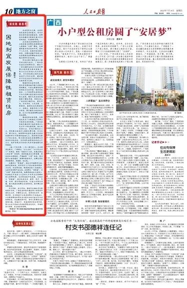 7月14日,人民日报海外版第10版刊发广西壮族自治区住房和城乡建设厅党组书记、厅长唐标文的署名文章《因地制宜发展保障性租赁住房(新实践 新思考)》。全文如下: