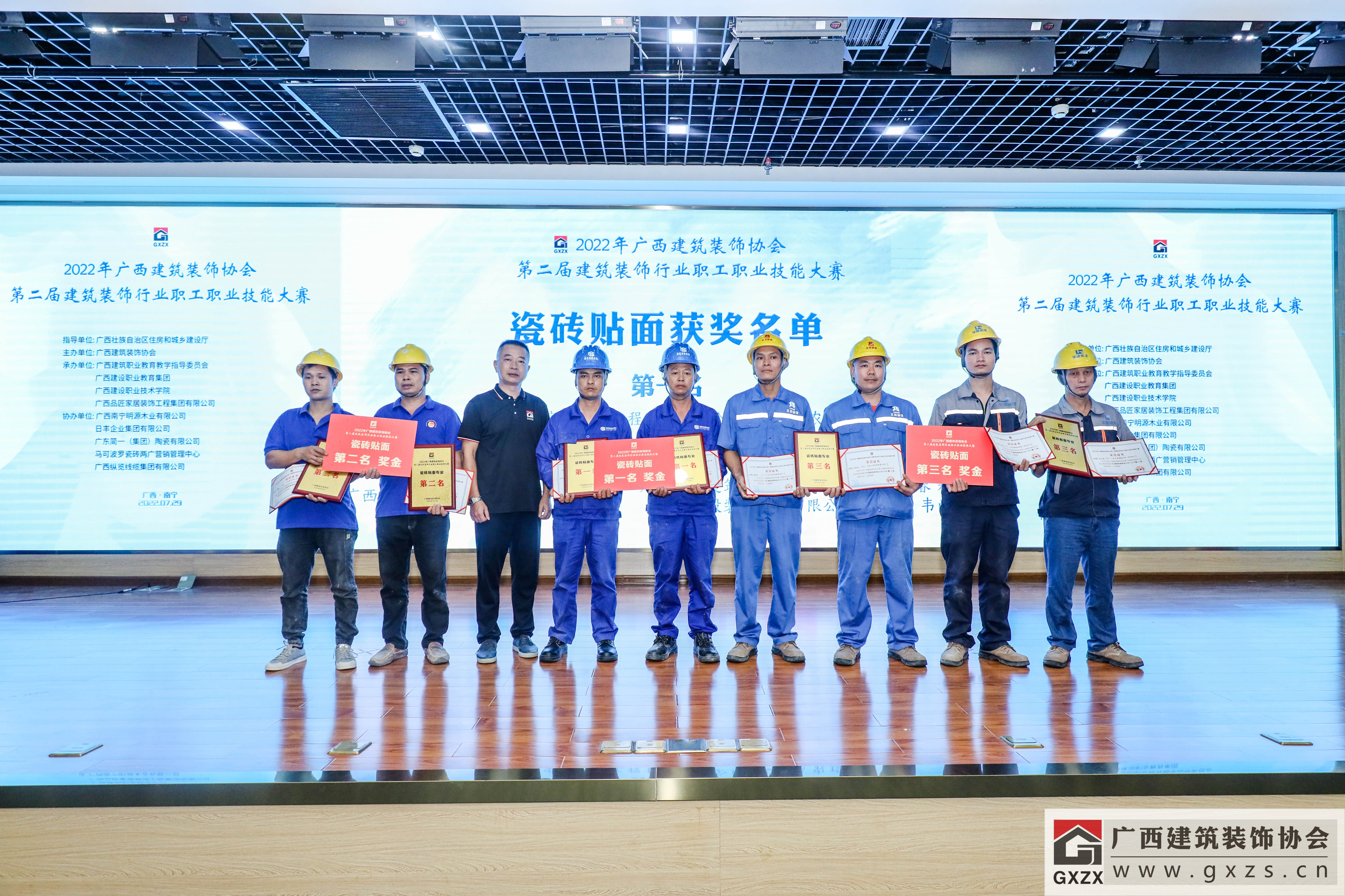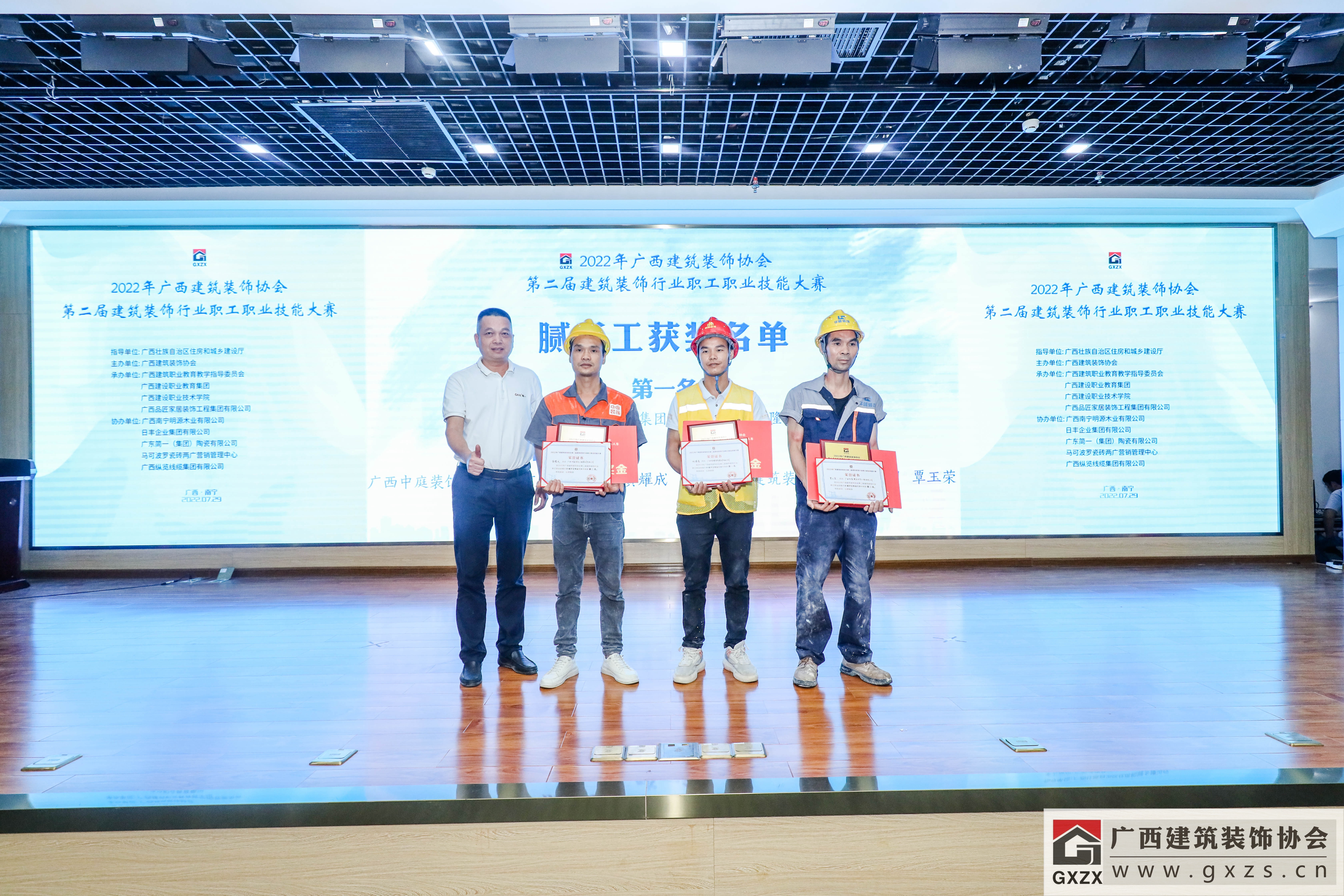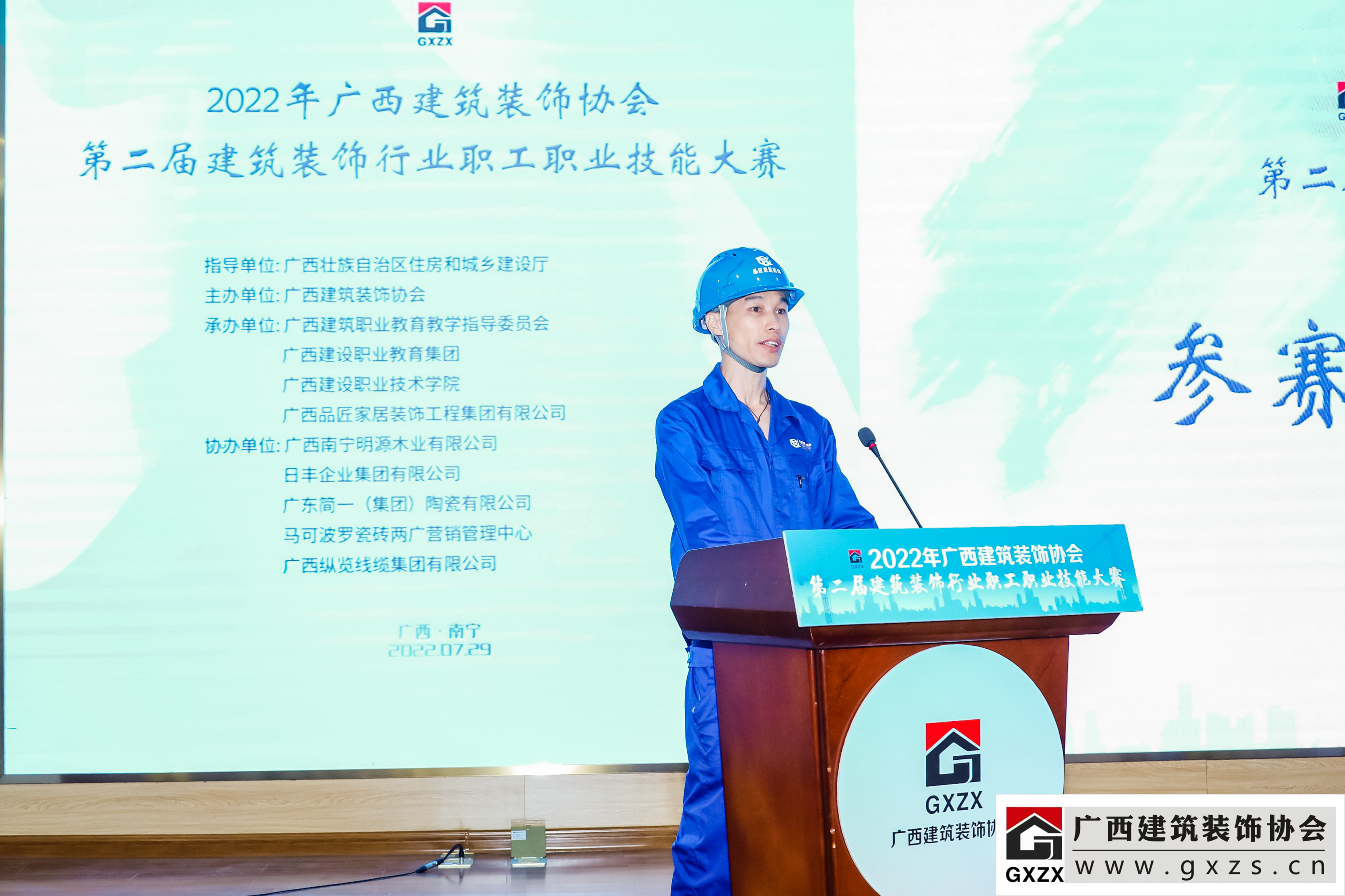 2022年7月29日,经过3个月紧张筹备,2022年广西建筑装饰协会“第二届建筑装饰行业职工职业技能大赛”如期举办。7月29日上午,大赛隆重开幕。广西住房和城乡建设厅人事教育处处长、机关党委专职副书记、一级调研员甘梅华,广西建设职业技术学院副校长梁伟,绿地大基建集团、广西建工集团有限责任公司 总工程师肖玉明,广西建筑装饰协会会长庞耀国等领导以及广西装协负责人、参赛人员、各支持单位代表约180人参加开幕式。