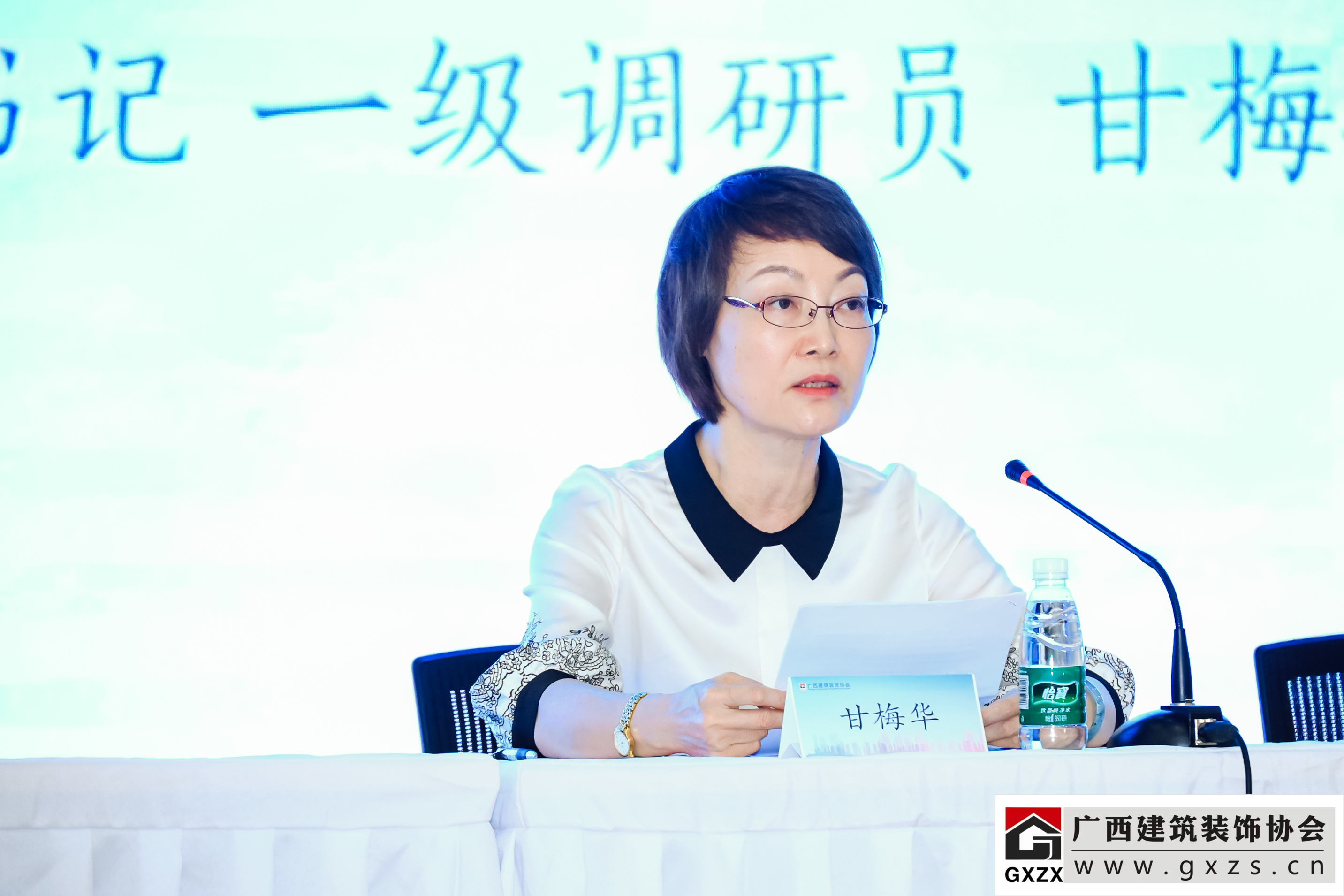 甘梅华处长首先致辞,她代表广西住房和城乡建设厅建设教育主管部门对大赛的顺利举办表示祝贺。她谈到,去年以来,全区住房城乡建设系统深入贯彻落实党的十九大和十九届历次全会精神,贯彻执行自治区第十二次党代会制定的建设新时代中国特色社会主义壮美广西的工作思路、总体要求、奋斗目标、战略任务和重大举措,积极应对新冠肺炎疫情反复的不利影响和经济下行压力加大的严峻形势,敢打硬仗、善打硬仗,在实现“十四五”良好开局的基础上,积极统筹疫情防控和住房城乡建设事业发展,统筹发展和安全,保障和改善民生,持续推进制定的各项任务目标,为全区经济稳步运行做出努力。甘处长表示,全区建筑业发展取得的成就,其中也包括了建筑装饰行业众多从业者的锐意进取、拼搏奉献。装饰行业作为建筑产业链的一个重要环节,其增量市场和存量市场空间都很广阔,发展依然可期。希望我区各建筑装饰行业的企业家们,风物长宜放眼量,苦练内功,根据市场形势变化,不断适应新形势、新变化,适应建筑业向新模式的转型升级,努力推进装配式装修、科技创新智能建造、绿色节能建筑等新技术、新工艺,积极研发专业专有技术,坚持走出一条“专、特、精”的发展道路;鼓励有实力有特点的民营装饰专包企业,参与国企混合所有制改革,强化优势资源整合互补,应对市场风险;重视人才的培养,通过强化建筑产业工人技能培训,提高从业人员技能水平,培养一支技术能力过硬的建筑产业工人队伍。她对广西装协近年来不断加强作风建设,切实做好服务工作等方面取得的成效给予肯定,希望协会再接再厉,不忘初心,继续为广西建筑装饰行业健康、高质量发展努力做出应有的贡献,进一步发挥桥梁和纽带作用,更好为会员单位服务。