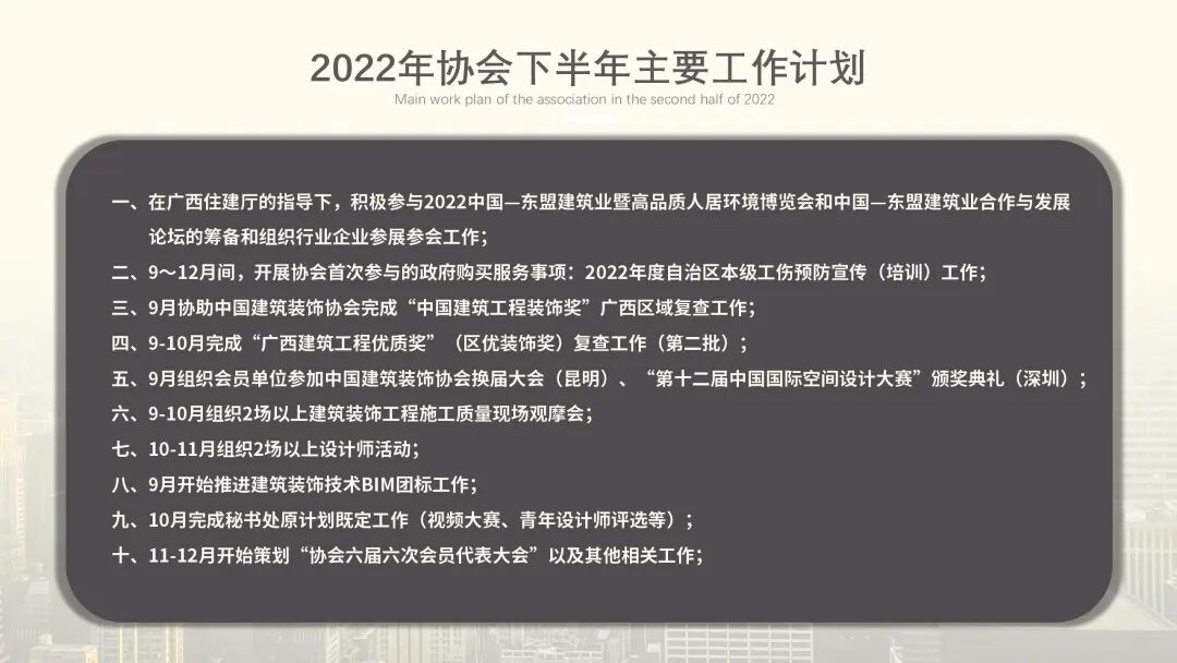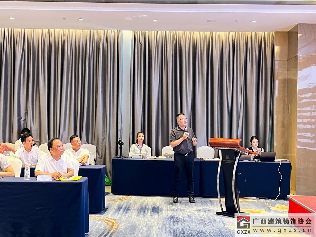 庞会长首先对协会负责人及特邀嘉宾出席会议以及会议承办单位柳州市建筑装饰协会周到的组织安排表示衷心感谢。他总结了协会上半年完成的主要工作。今年上半年以来,在会员单位的支持和帮助下,协会秘书处努力克服疫情频发带来的不利影响,根据协会年度工作计划扎实推进协会工作,上半年的阶段性重要工作基本按计划完成。上半年的阶段性重要工