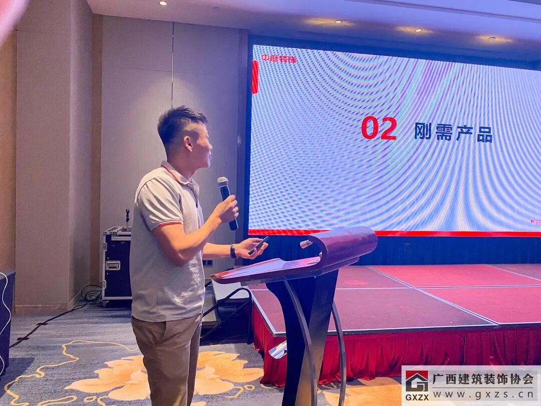 住宅装修分会副会长、广西中庭装饰董事长兼总裁丁胡做“广西家装行业面临的发展及变革”的主题分享。