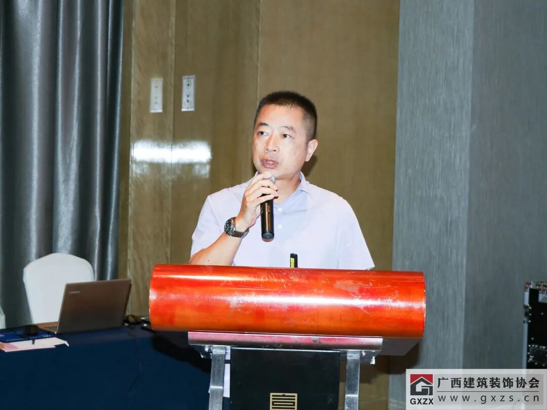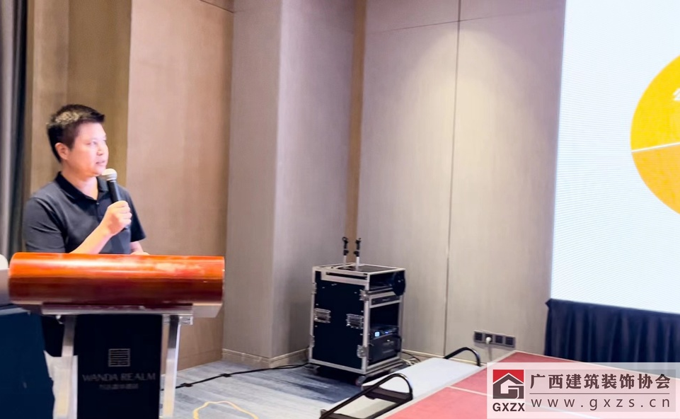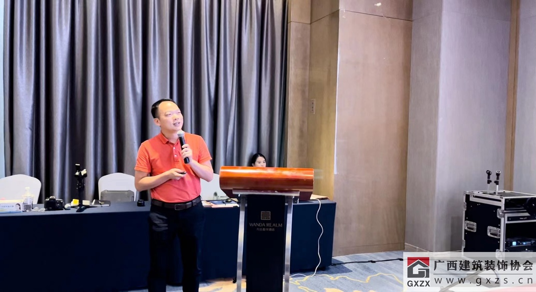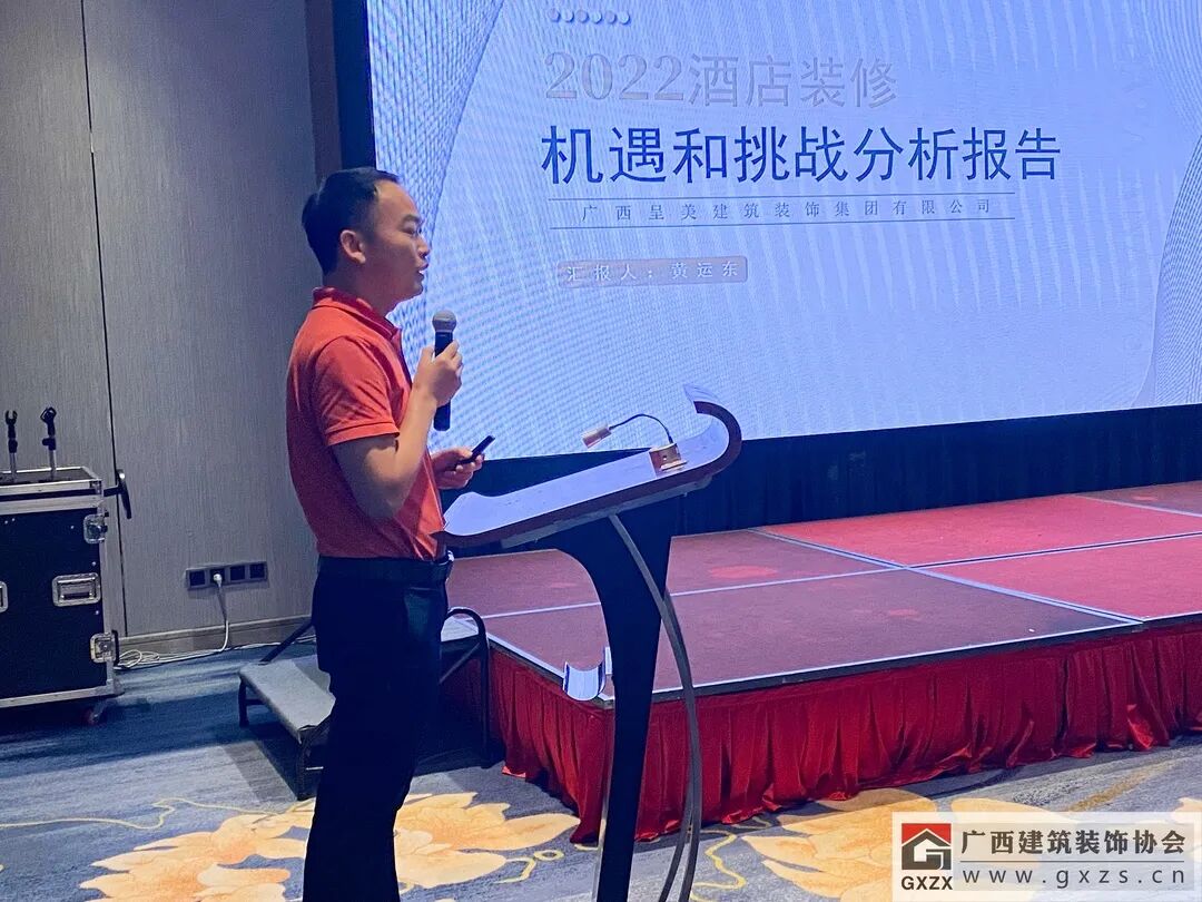 副会长、广西呈美装饰董事长黄运东做“2022酒店装修机遇和挑战分析报告”的主题分享。