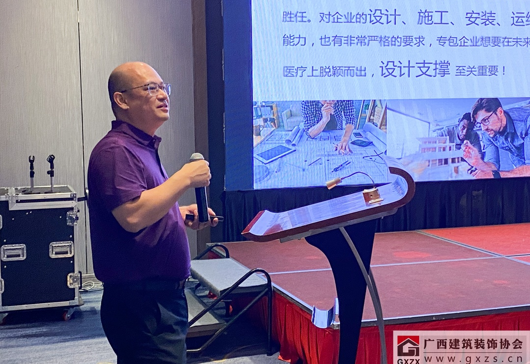 副会长、广西三源装饰副总经理陈远立做“专业承包企业如何做精康养医疗板块业务”的主题分享。