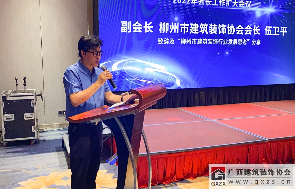 本次会长工作扩大会议的顺利召开,得到了承办单位柳州市建筑装饰协会的鼎力支持和协助。协会副会长、柳州装协会长伍卫平在致辞中对广西装协把此次重要会议定在柳州召开表示感谢,对广西装协负责人及其他参会人员的到来表示欢迎。他介绍了柳州装协工作开展情况以及柳州市建筑装饰行业发展的状况。他说柳州装协自2005年成立以来,不断发展壮大,目前拥有204家会员,一直致力于推动柳州市建筑装饰事业的发展,切实发挥柳州装协的桥梁纽带作用,开展多项活动促进柳州建筑装饰行业发展、协助政府主管部门进行行业管理,为柳州市装饰行业高质量发展做出了较大贡献。