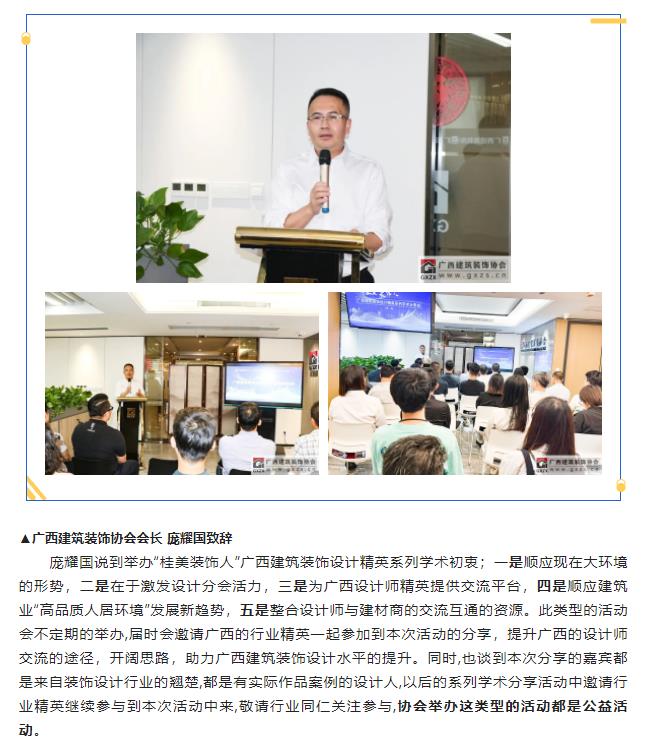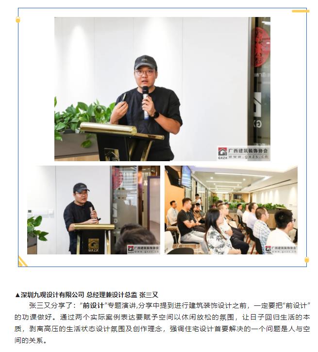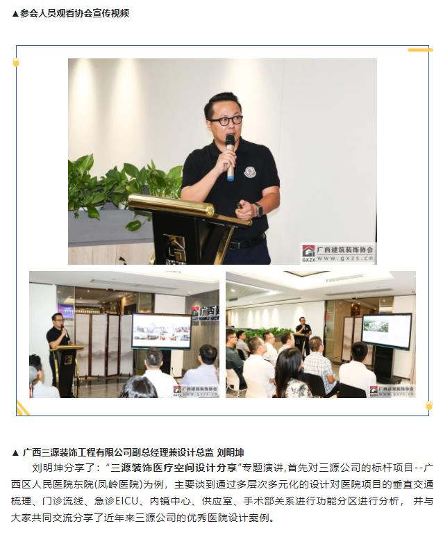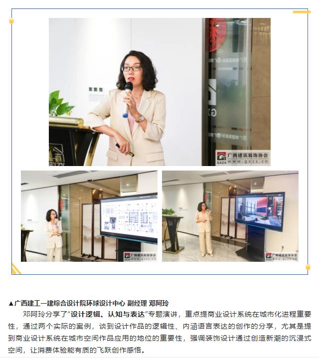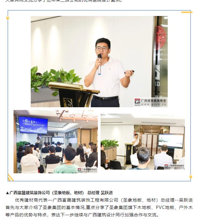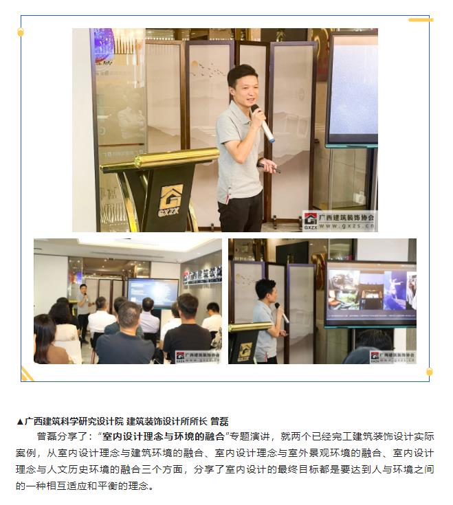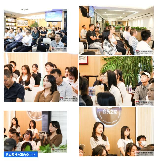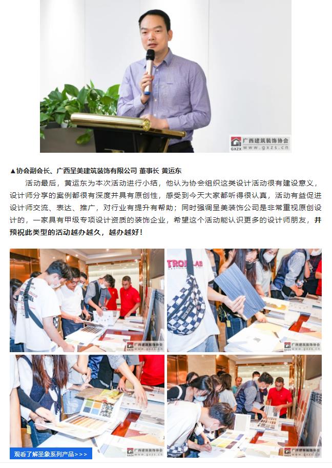 2022年10月18日,“桂美装饰人”广西建筑装饰设计精英系列学术(第一期)分享会顺利举办,活动主要由协会设计分会策划筹办。13家企业设计师代表和部分广西艺术学院研究生代表(室内设计研究方向)共有约40人参加本次活动。本次活动邀请四位行业精英进行学术分享:三源装饰工程有限公司 副总经理兼设计总监刘明坤、广西建科院装饰设计所所长曾磊、深圳九观设计公司总经理兼设计总监张三又、广西一建设计院环球设计中心副经理邓阿玲;本次活动得到广西富晟建筑装饰有限公司(圣象地板、地材代理商)全程大力支持。