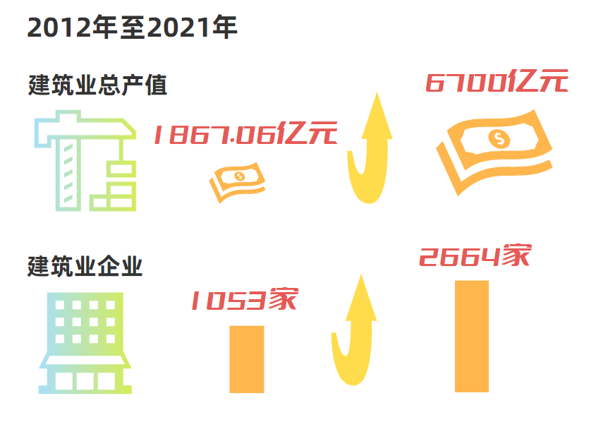 建筑业转型升级是篇大文章,为实现广西建筑业高质量发展提质增效。广西鼓励建筑业企业“走出去”“引进来”,实现做大做强。近年来,广西积极引进了一批综合实力强、品牌知名度高的建筑业企业总部、区域总部或分支机构落户广西。2012年至2021年,我区建筑业总产值从1867.06亿元增加到6700亿元,年均增长15.74%,增速排在全国前列,对全区经济稳增长起到了重要支撑作用;建筑业企业个数由1053家增加到2664家,特级资质企业从2012年的2家增加至16家。