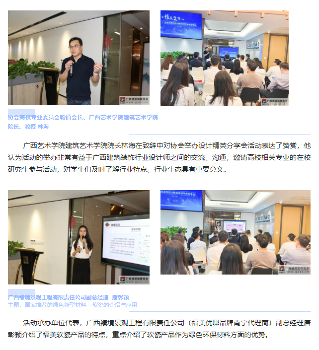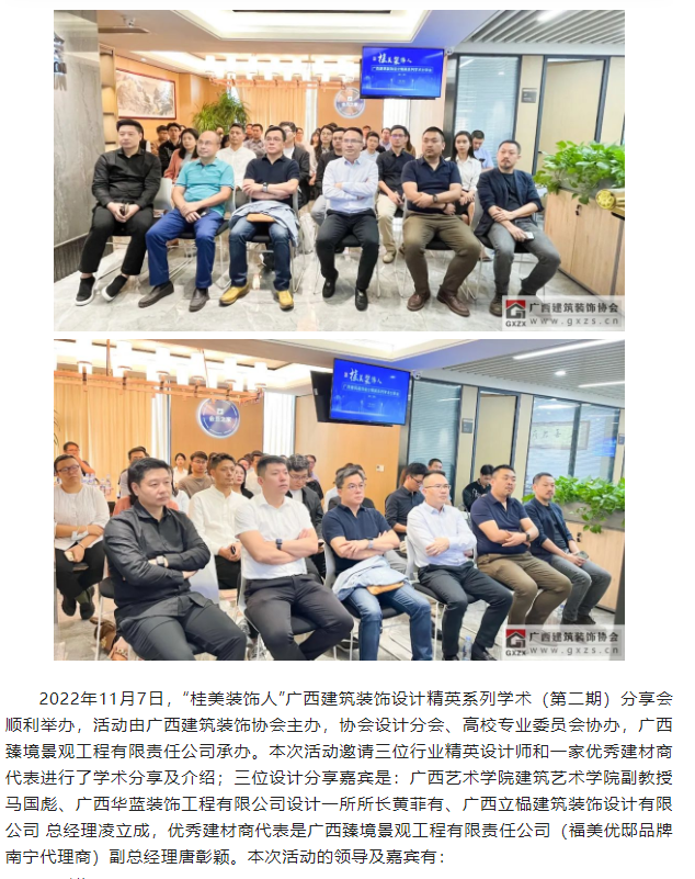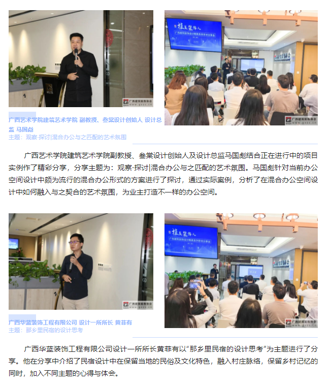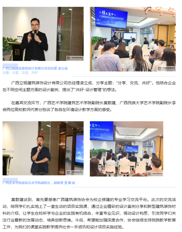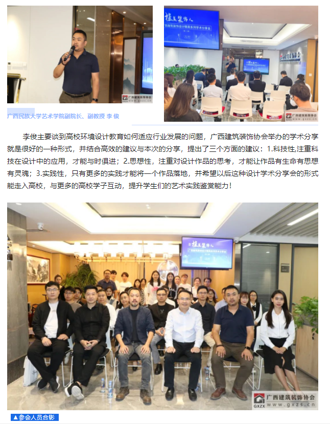 南宁市青松照明电器有限责任公司 总经理 王坚参会的还有来自北投装饰、交通设计院、五建设计院、华业建筑设计院、裕华建筑设计院、广安居建设、美力时装饰的各位设计师,以及广西艺术学院、广西民族大学的研究生代表们,共约40人参与今天本次的活动。