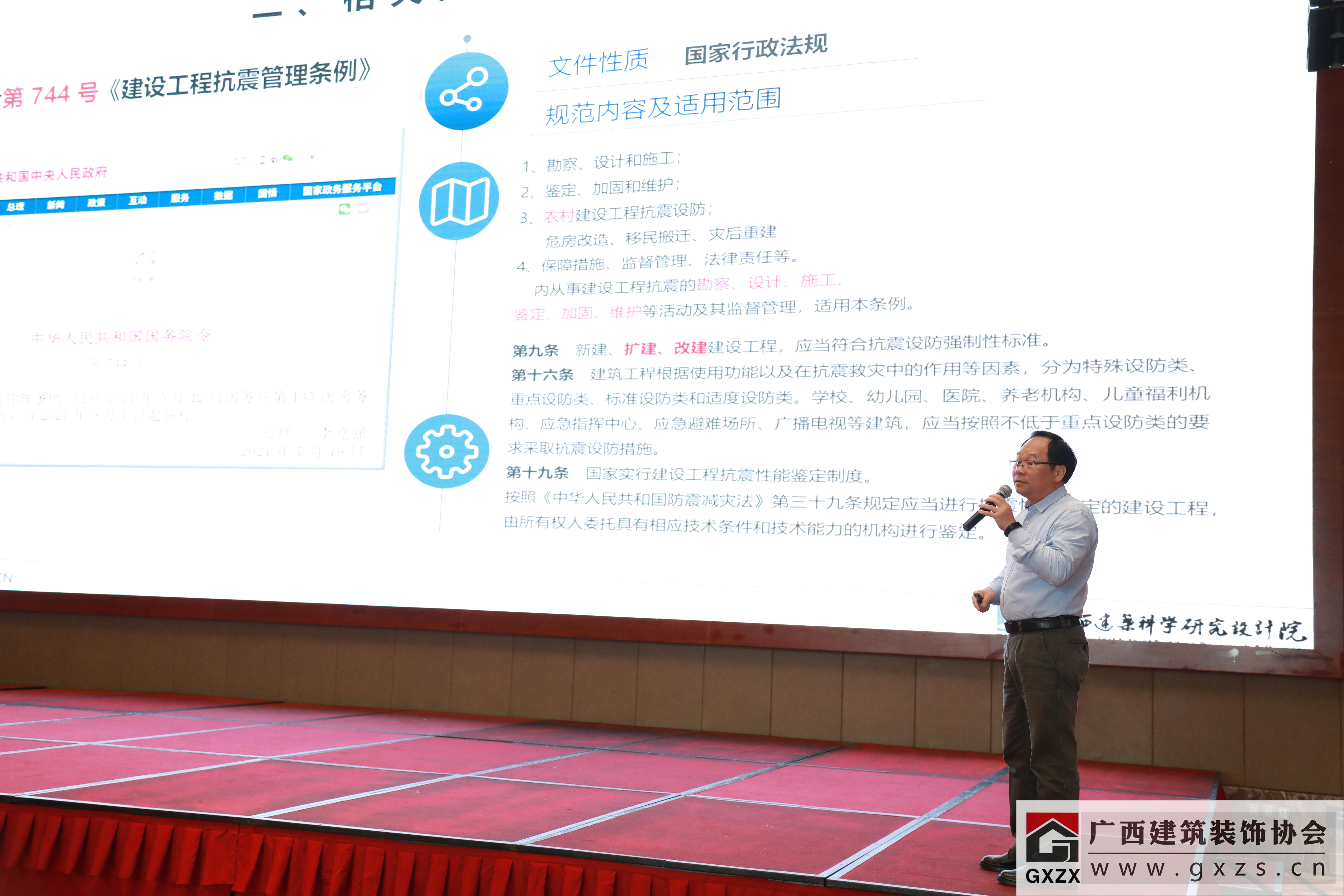 特邀嘉宾首届广西工程勘察设计大师、广西建筑科学研究设计院副院长、教授级高工李杰成做《建筑工程的改扩建与房屋安全》专题授课,通过系列装饰装修工程案例,系统性讲解装饰装修过程相关法律与规范,以及提升建筑物改扩建、房屋结构安全和特种改造加固经验方法。