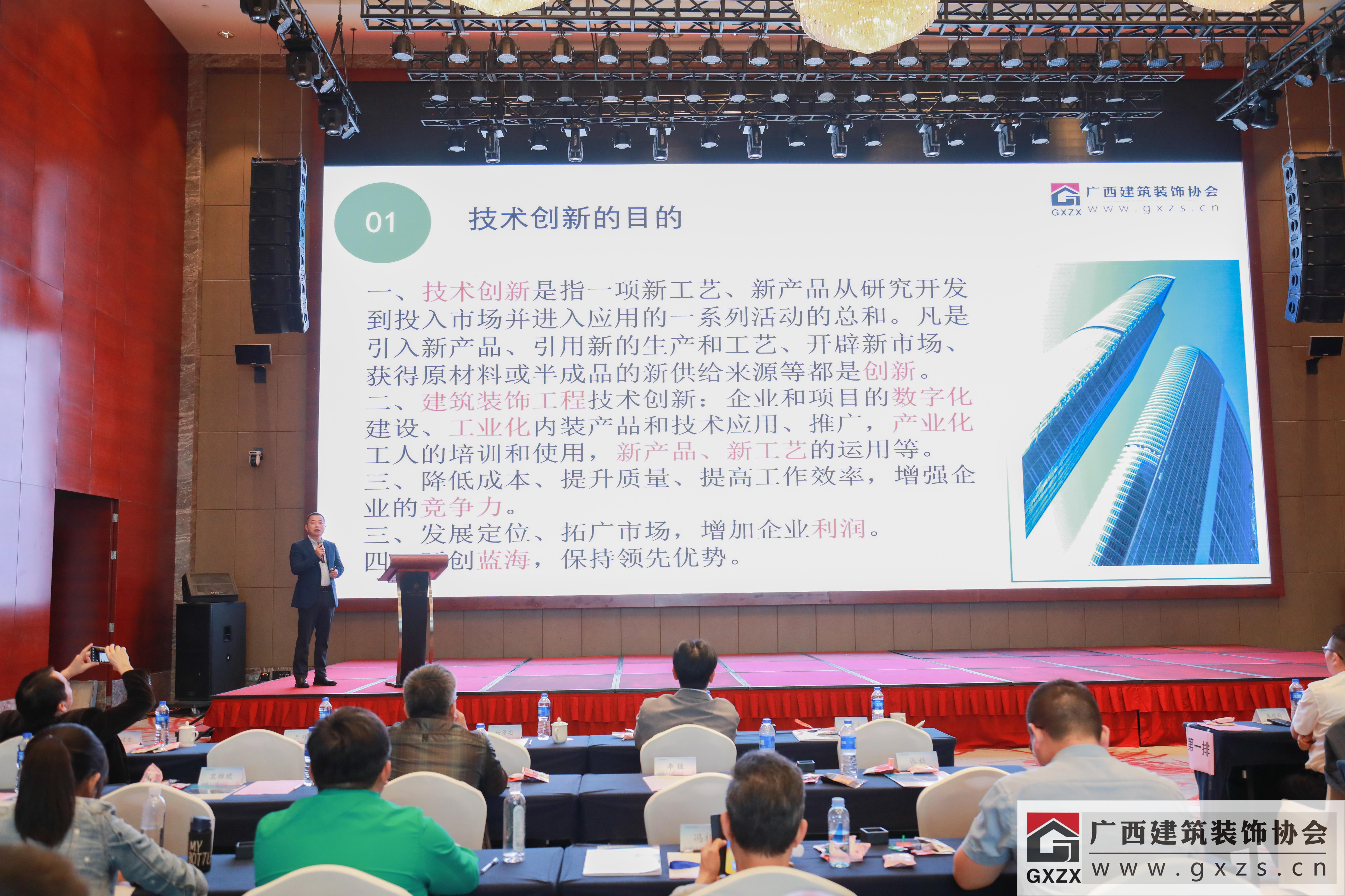 创新是现代企业获得竞争优势的基本条件之一,企业要发展必须首先立足于自身技术创新能力的提高和强化,契合本次大会创新发展这一主题,广西建筑装饰协会秘书长、教授级高工谭谦在会议现场开展《装饰工程技术创新交流、国家级和自治区级建筑装饰类评优政策阐述》。