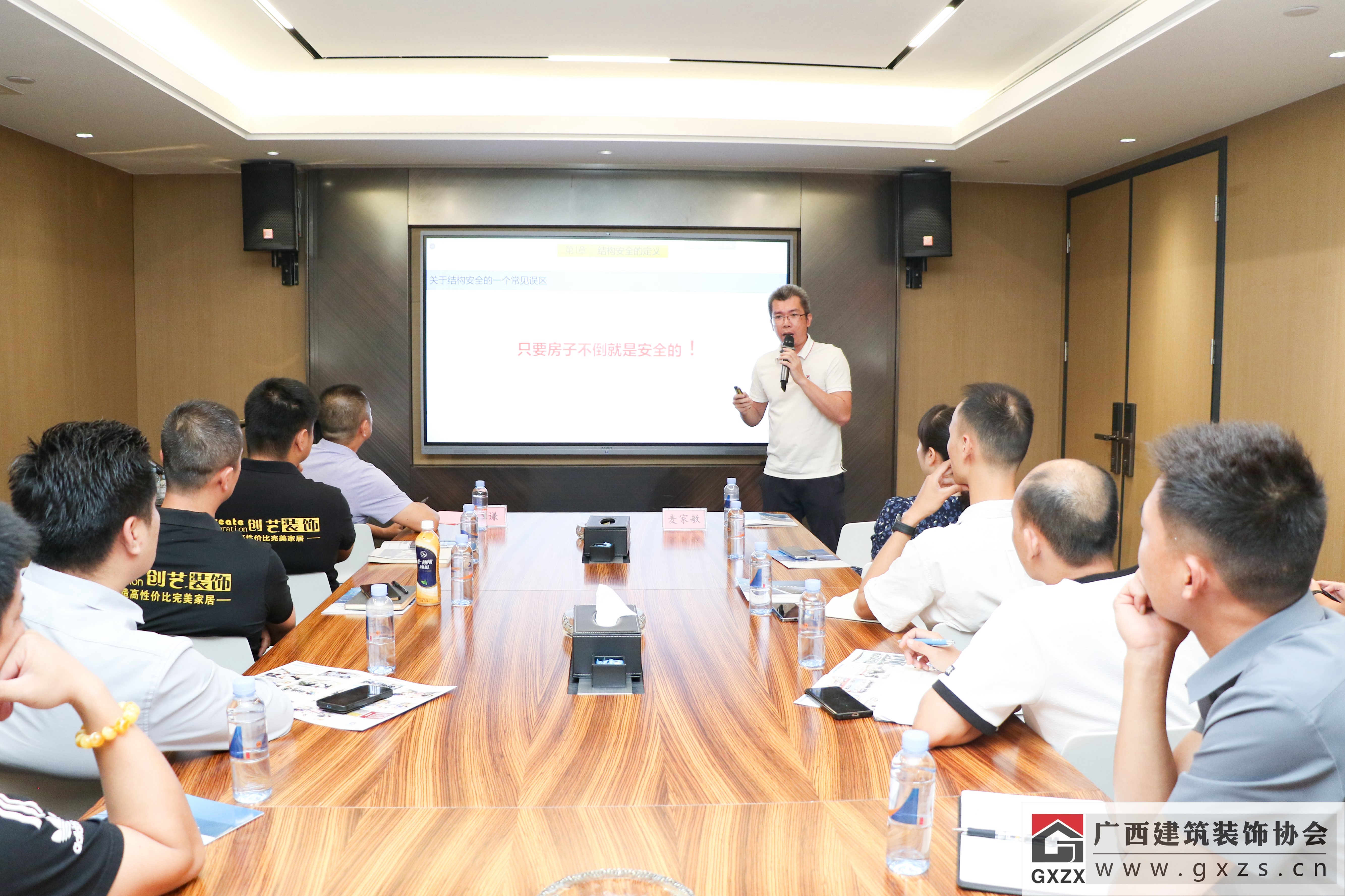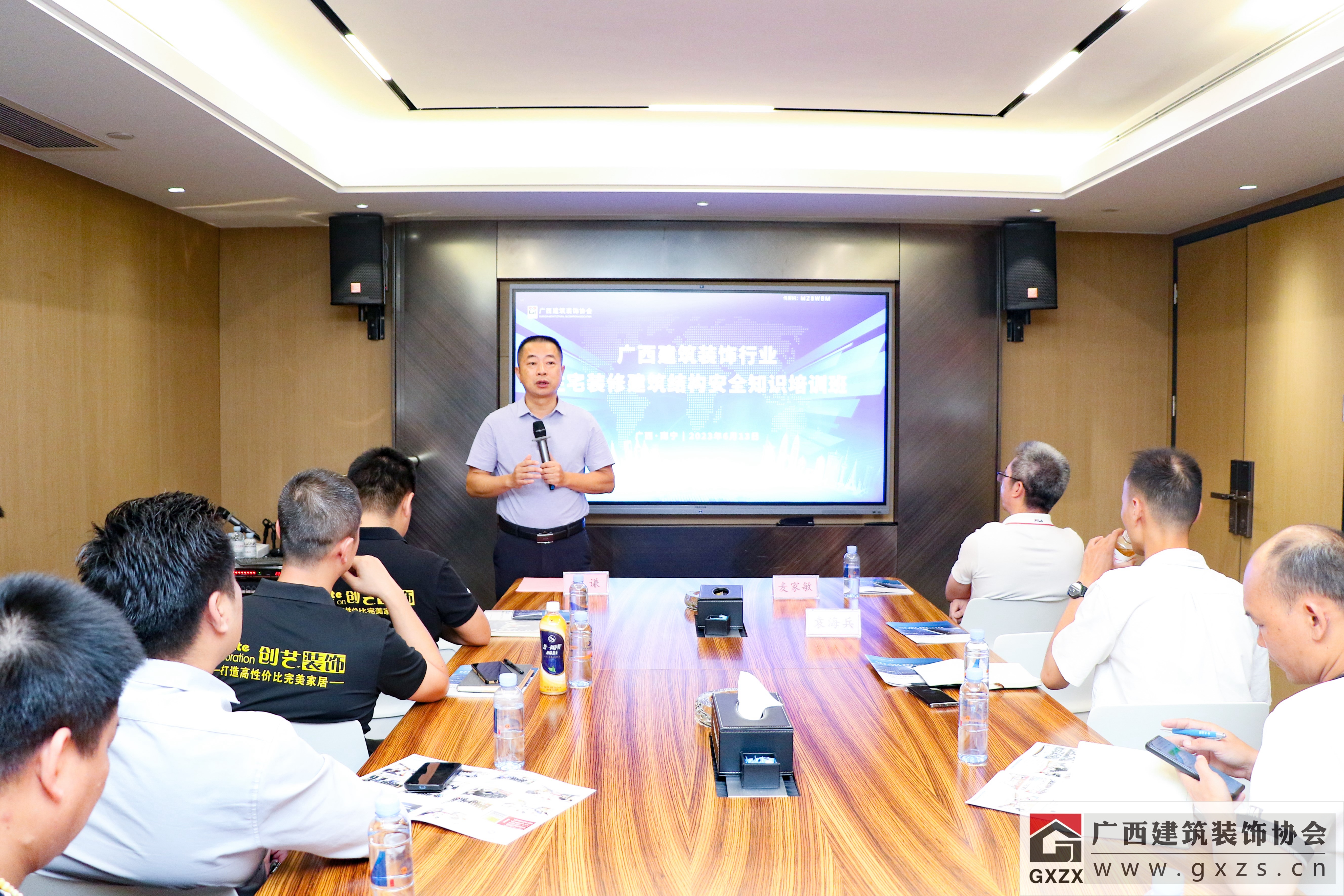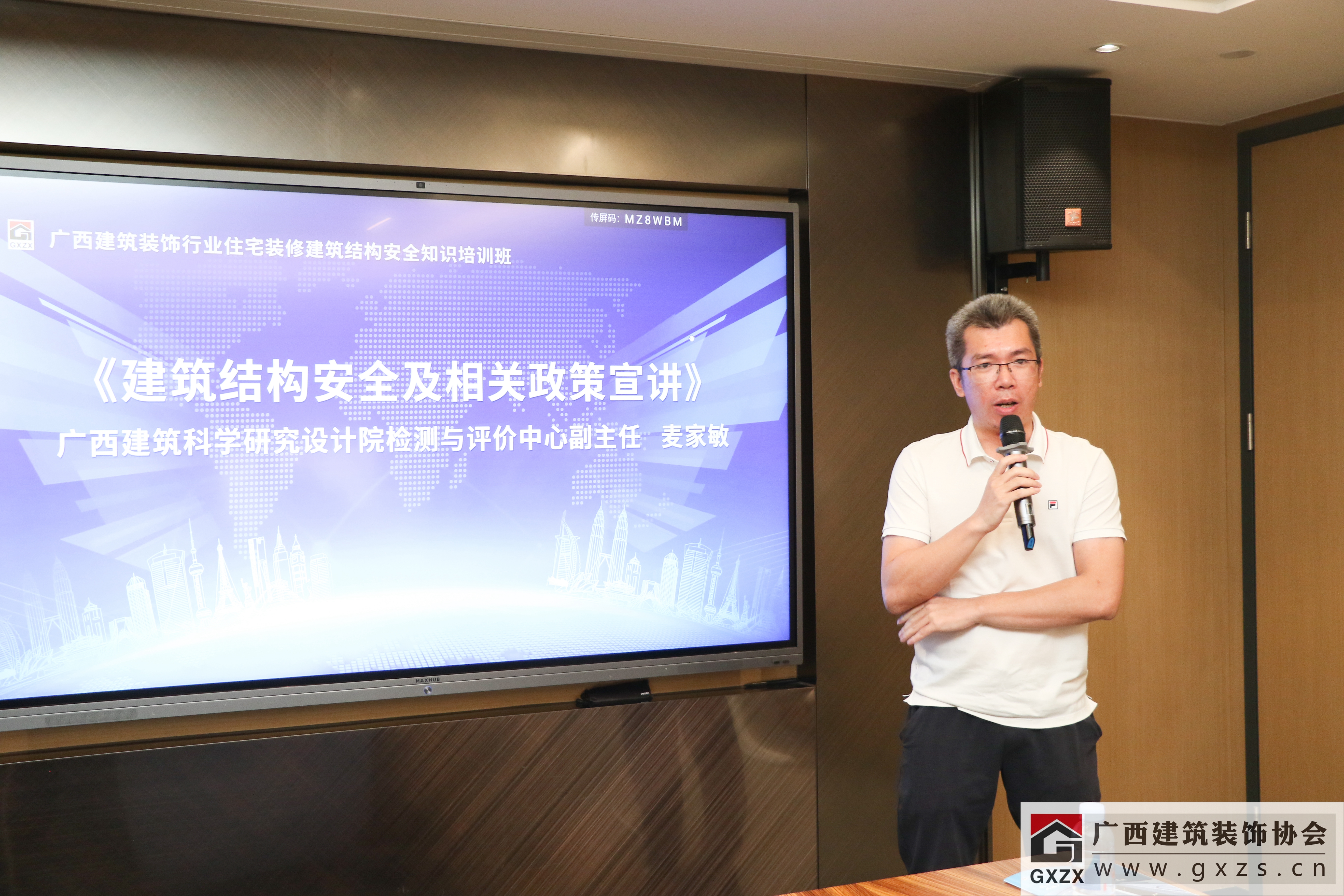 2023年6月13日,由广西建筑装饰协会主办的广西建筑装饰行业住宅装修建筑结构安全知识培训班在南宁顺利举办,协会特邀广西建筑科学研究设计院检测与评价中心副主任麦家敏、上海市建纬(南宁)律师事务所主任袁海兵作为授课专家,结合实际情况,针对建筑装修(住宅)结构安全知识、建筑装修施工过程中的法律风险进行专业授课,具有很强的现实针对性和理论指导性。本次培训会共有19家家装企业约30名代表参加,由协会秘书长谭谦主持。