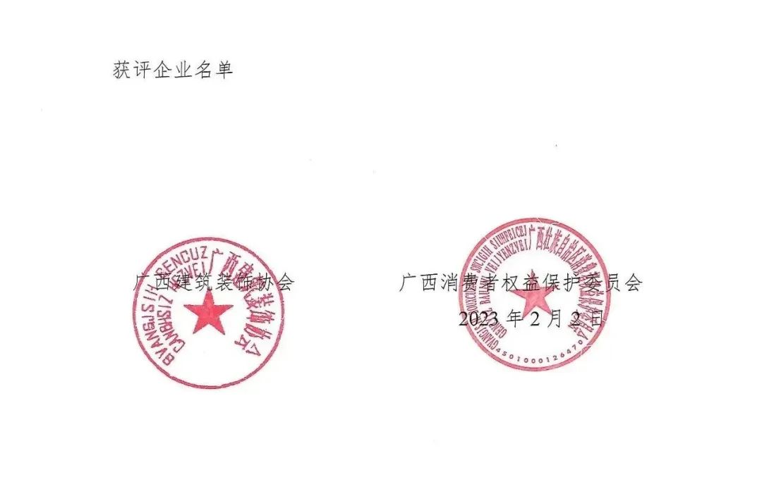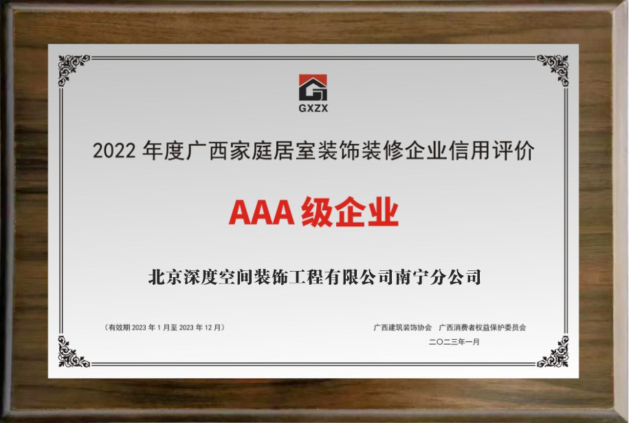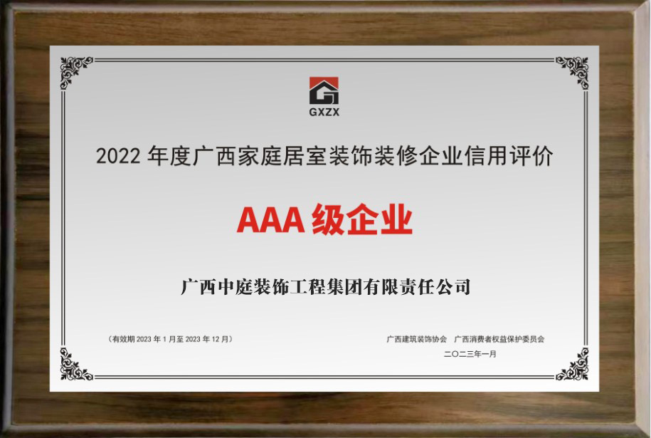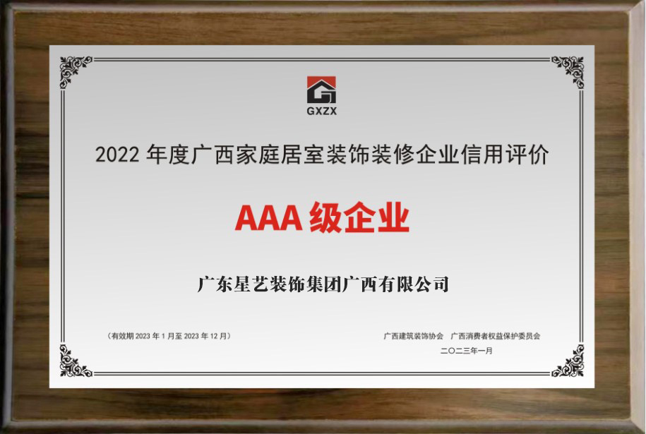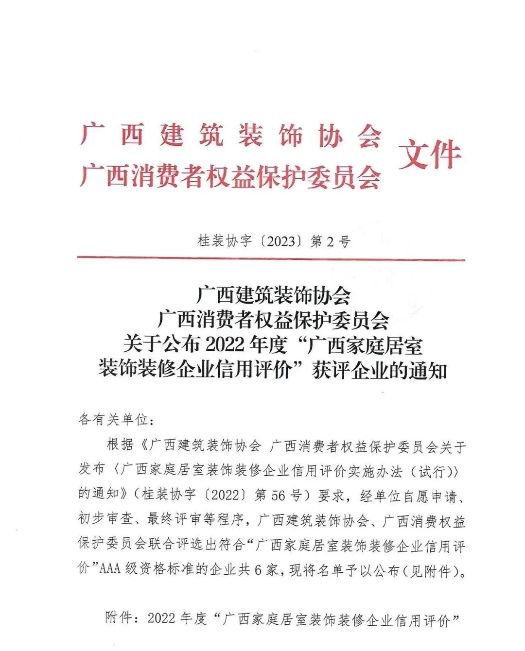 为增强企业诚信经营意识,促进行业市场秩序的规范和健康发展,加强对从事广西家庭居室装饰装修企业的自律管理,维护家庭居室装饰装修市场秩序,保证装修质量和安全,结合家庭居室装饰装修企业的特点以及我区家装行业市场实际情况,广西建筑装饰协会于2022年10月8日开展2022年度广西家庭居室装饰装修企业信用评价工作,经单位自愿申请、初步审查、最终评审等程序,广西建筑装饰协会、广西消费权益保护委员会联合评选出符合“广西家庭居室装饰装修企业信用评价”AAA级资格标准的企业共6家。