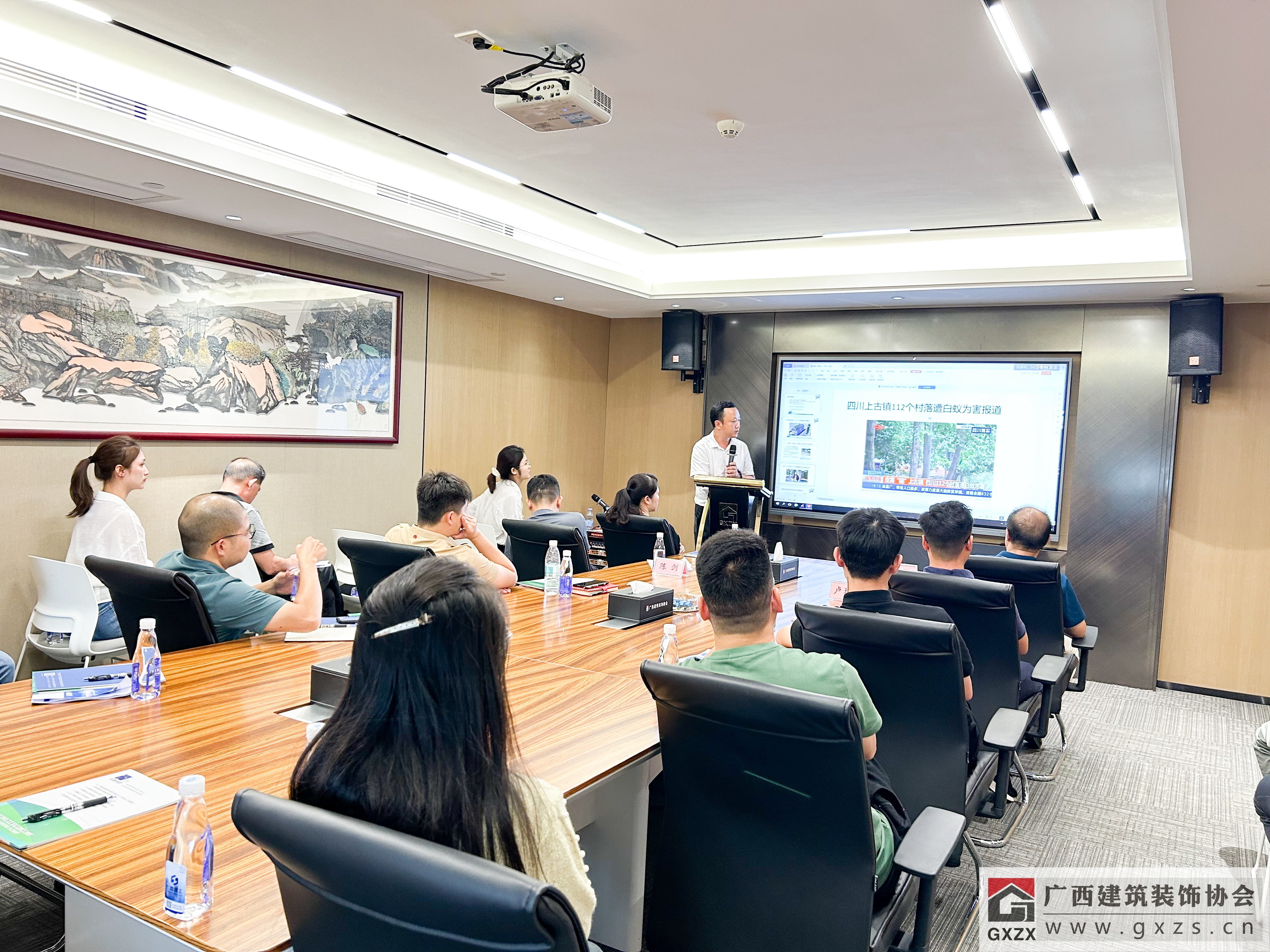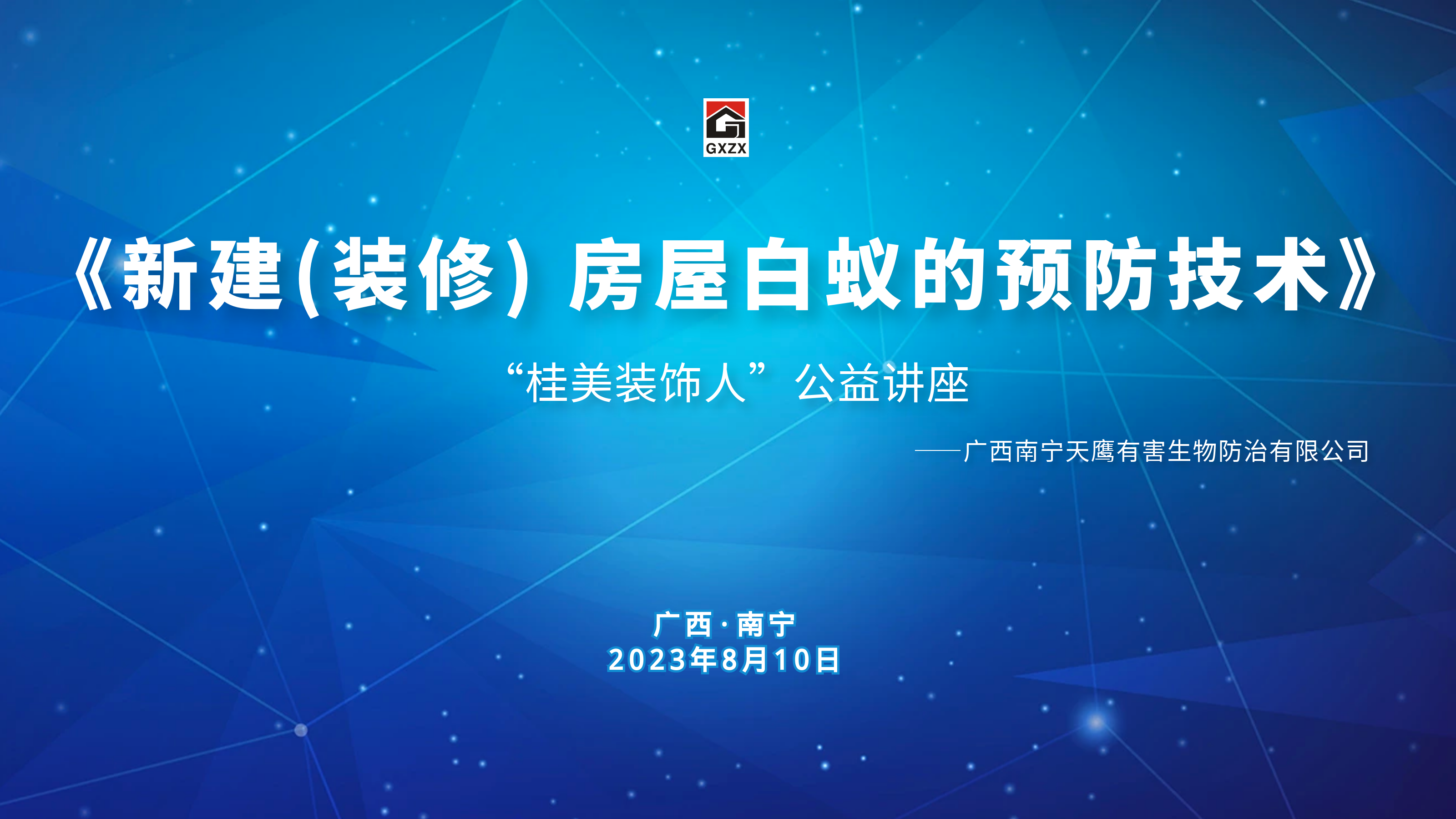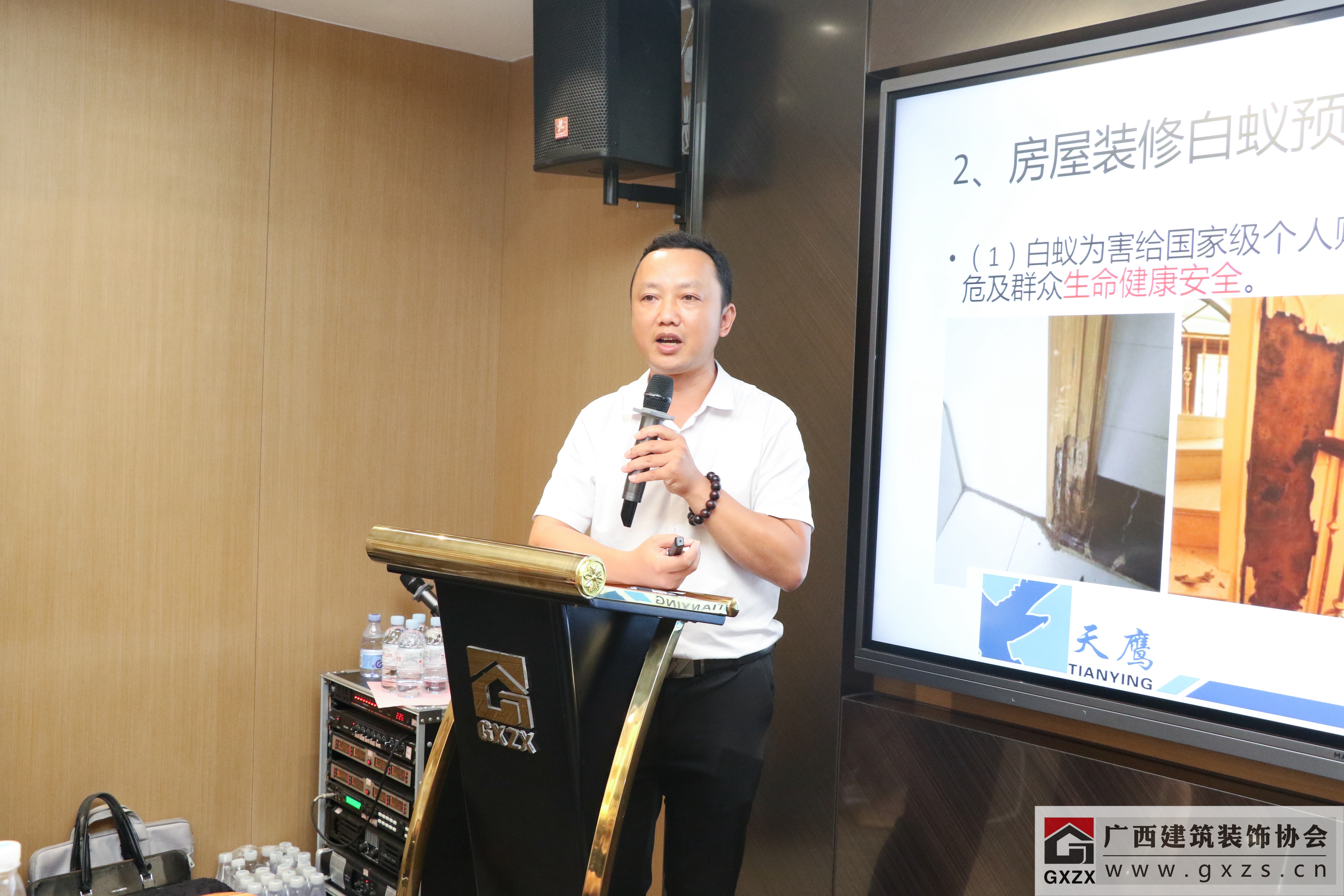 2023年8月10日,协会举办了本年度第三场“桂美装饰人”系列公益讲座,本次公益分享主题为《新建(装修)房屋白蚁的预防技术》,南宁天鹰有害生物防治有限公司作为本次活动的承办单位,协会黄榆副秘书长、陈雪玲副秘书长以及17家会员企业约25人参加本次分享活动。