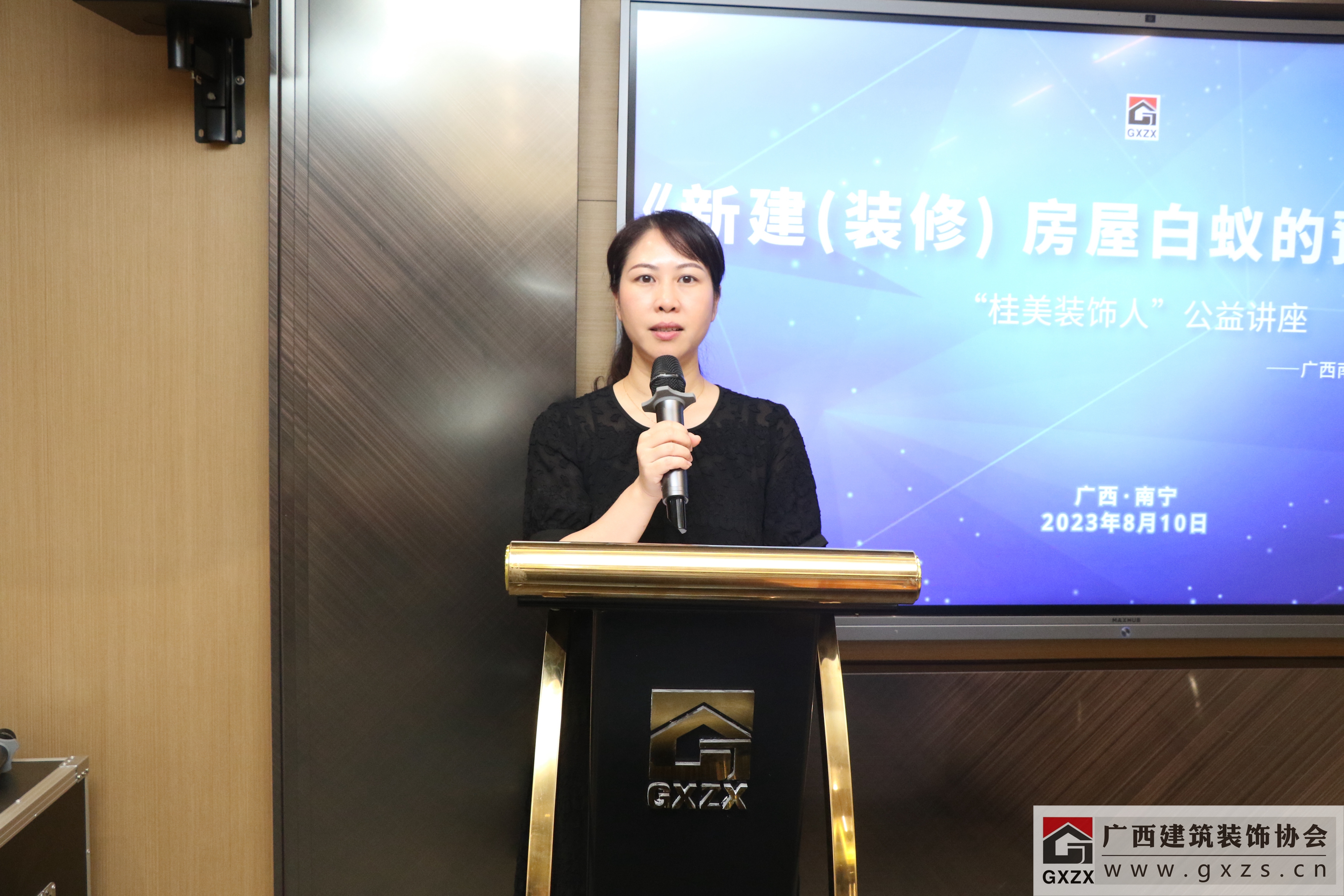 陈雪玲副秘书长在开场致辞中表示,根据今年1月17号住房和城乡建设部的工作会议要求,牢牢抓住让人民群众安居这个基点,协会今天举办了白蚁防治公益讲座。广西地区是白蚁危害高发地区,每年4-8月雨水过后白蚁大量出没,给新建(装修)房屋、堤坝、园林景观的使用和维护造成巨大危害,属于必须实施白蚁防治的地区。“努力让人民群众住上更好的房子为目标,从好房子到好小区,从好小区到好社区,从好社区到好城区,进而把城市规划好,建设好,治理好。”贯彻落实这些政策的指导要求,都离不开白蚁防治的工作落地。