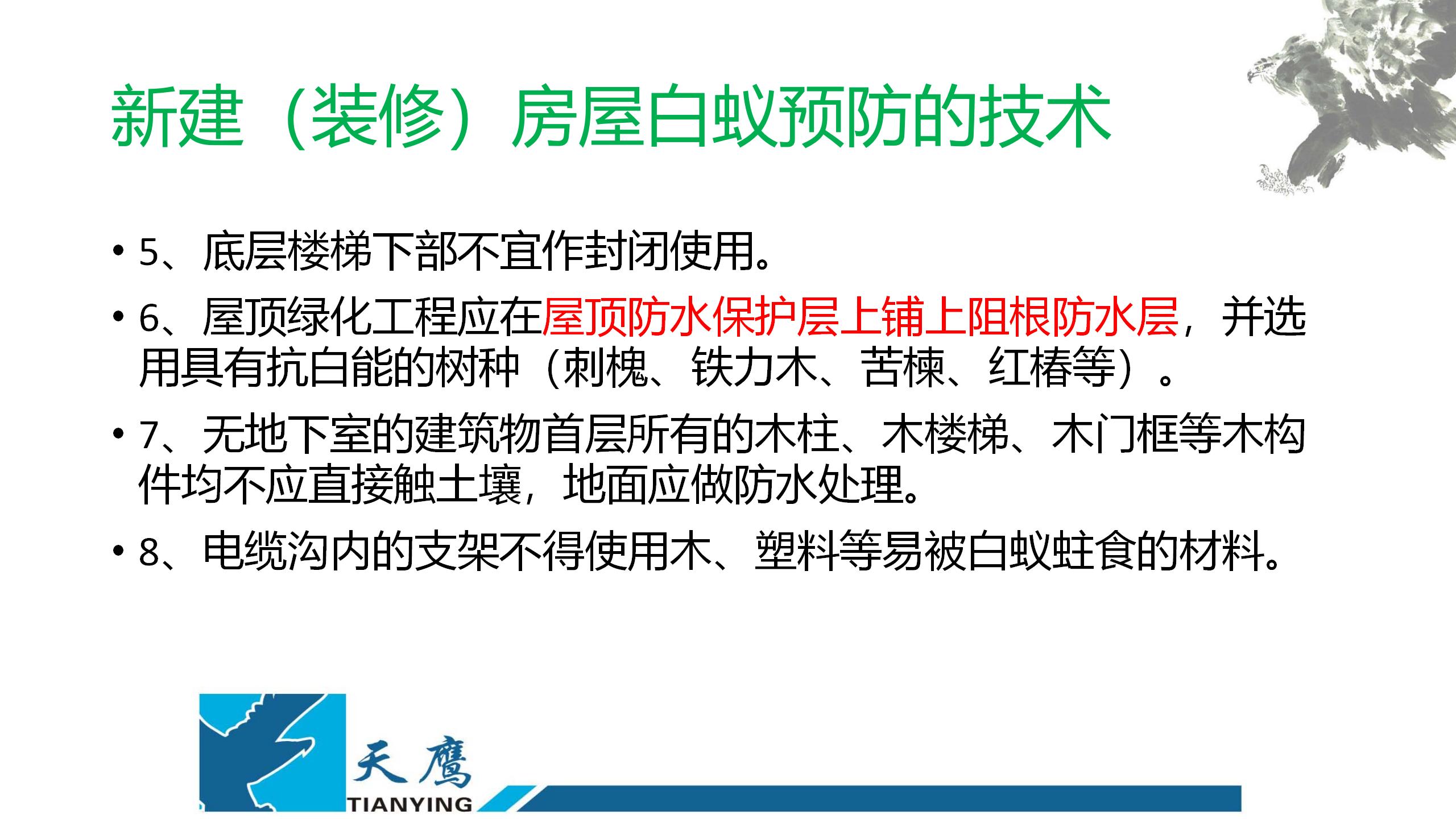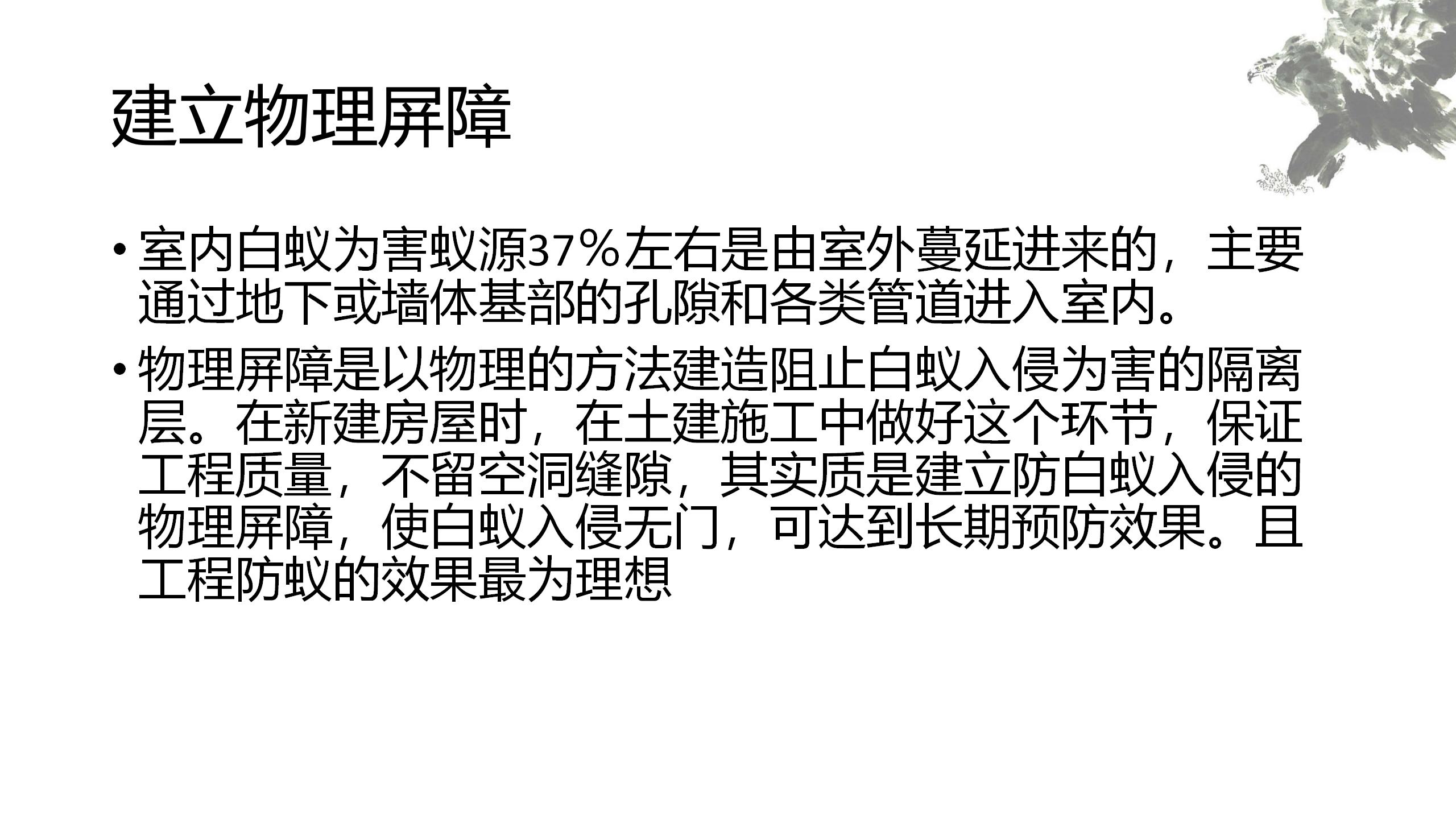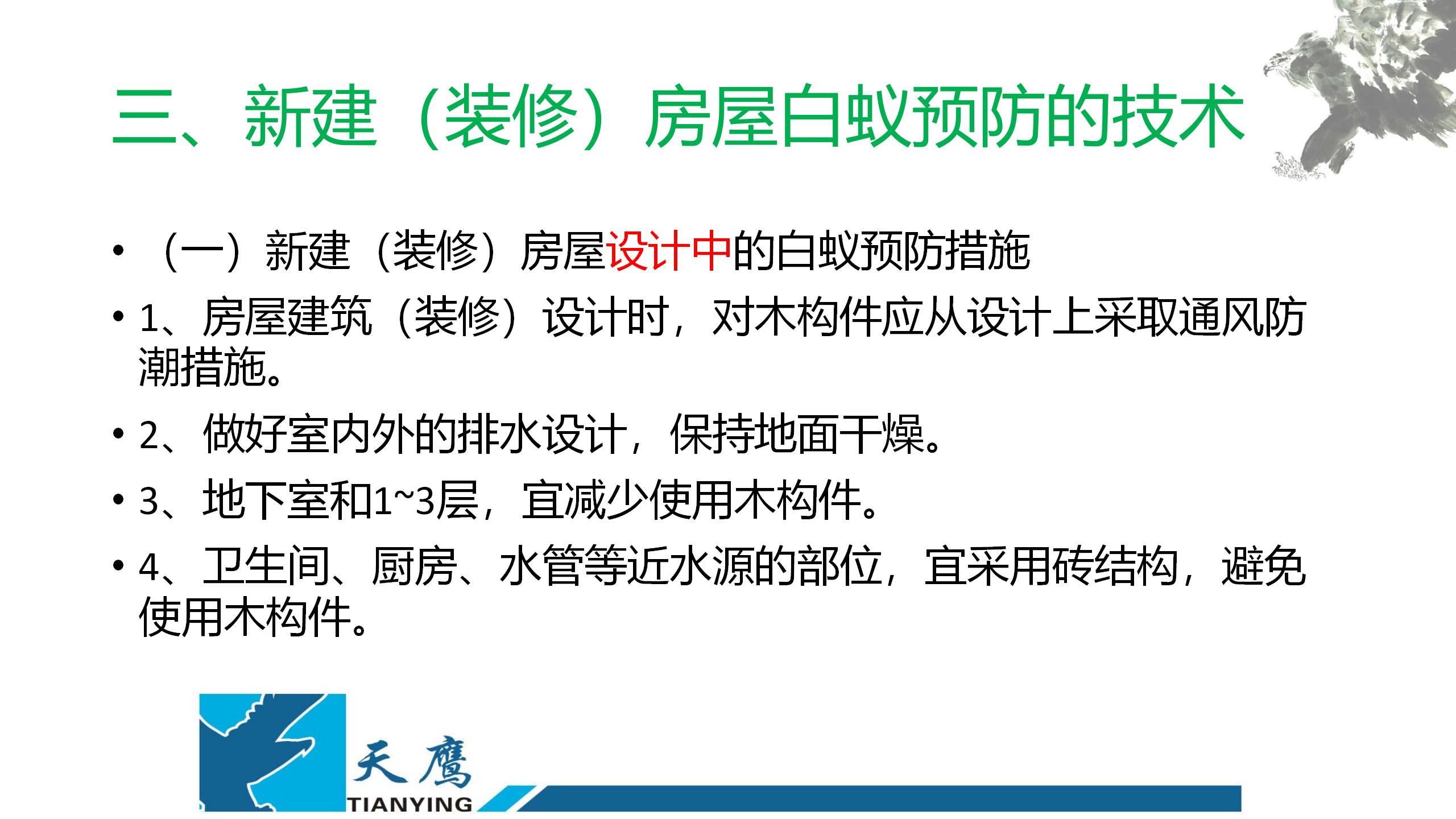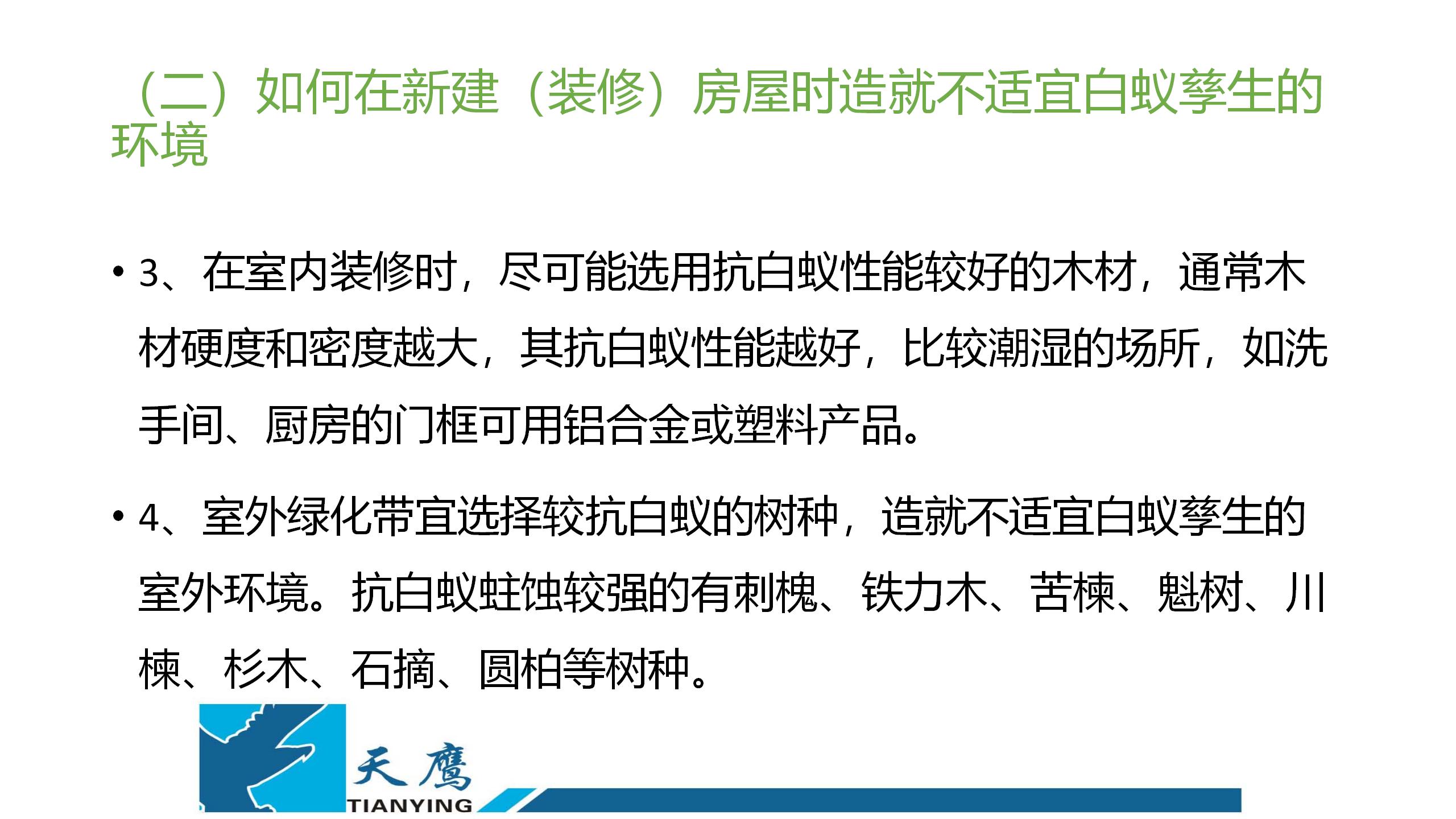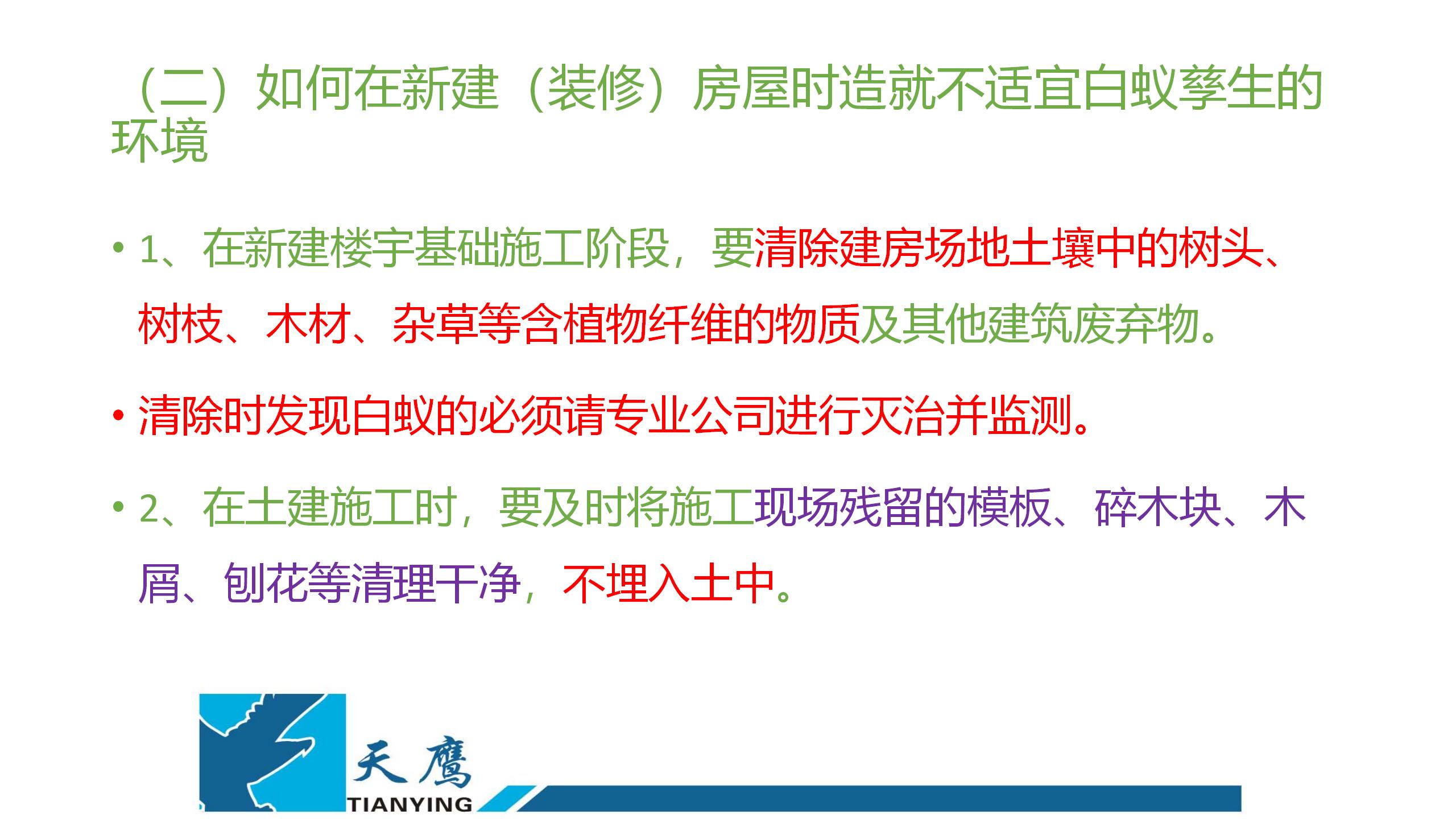 在今天的分享会上,天鹰公司系统性的介绍了新建(装修)房屋白蚁预防的重要性,带领大家了解认识白蚁入侵房屋的途径及其生活习性,重点普及了房屋白蚁预防、房屋装修过程中病媒生物(蟑螂、老鼠)预防的相关技术,最大程度减轻白蚁、病媒生物对装饰装修房屋以及人体的危害,很大程度上提高了大家对白蚁入侵房屋的危害的正确认识以及预防意识。