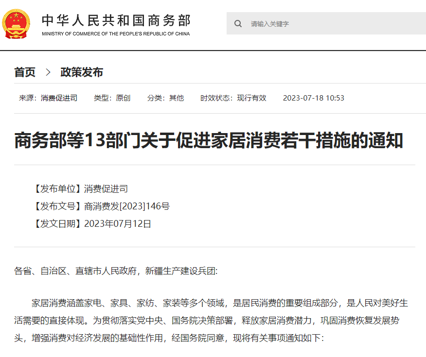 转:商务部等13部门关于促进家居消费若干措施的通知