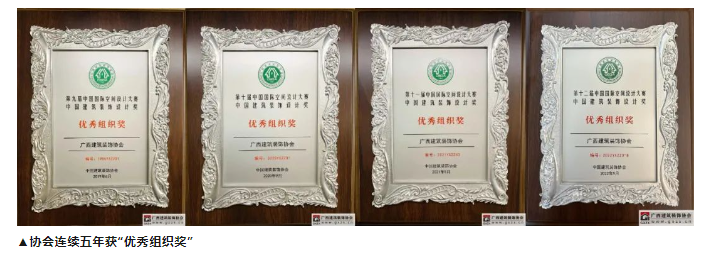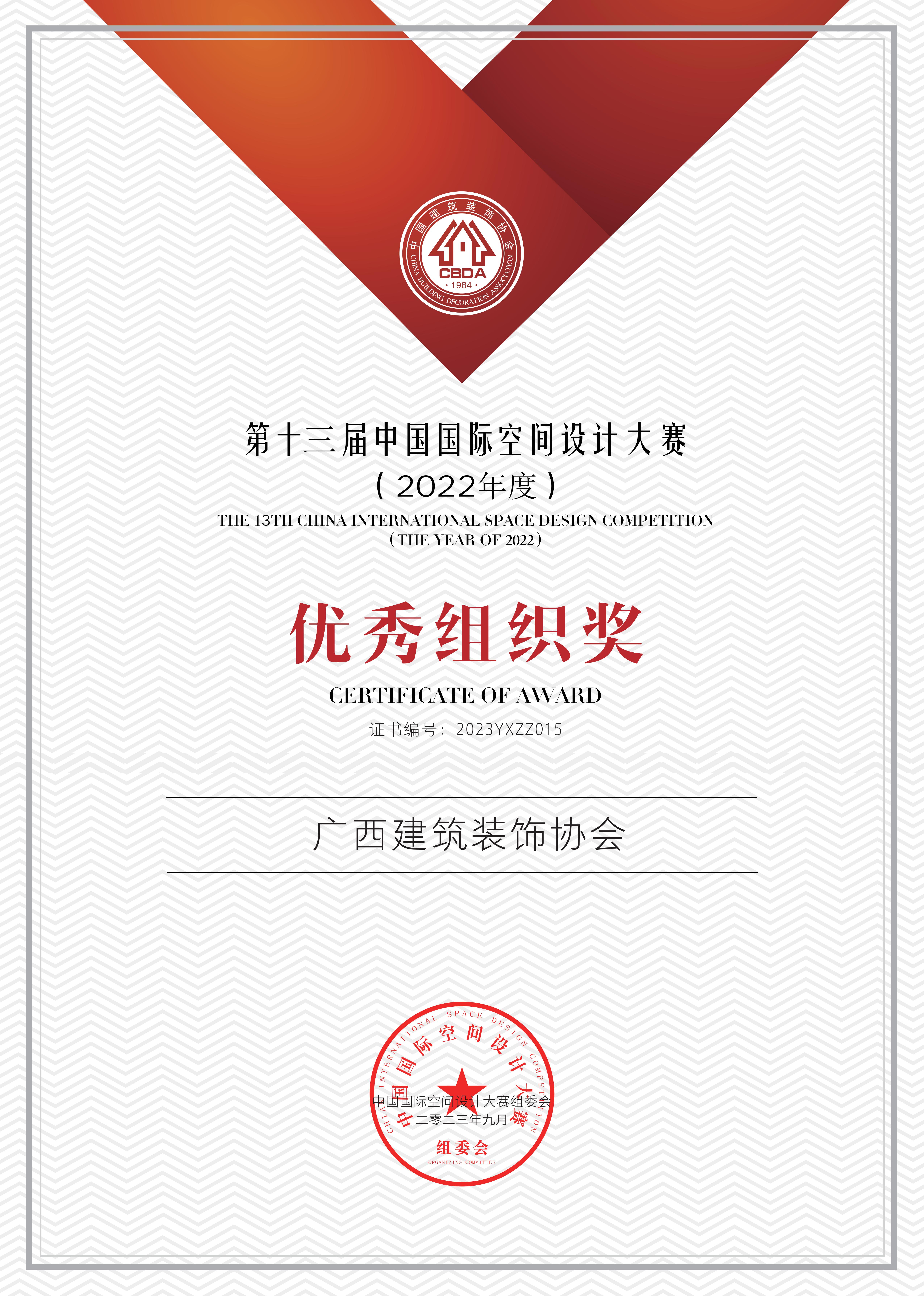 随着第十三届中国空间设计大赛顺利结束,中国国际空间设计大赛(广西赛区)已成功举办过五届,广西建筑装饰协会作为中国国际空间设计大赛(广西赛区)唯一合作方,独家承担组织广西赛区会员企业(设计师)参赛,负责推荐设计大赛(省级)获奖作品直接进入中国国际空间设计大赛(国家级)复评环节,截至目前,已连续五年获得大赛组委会颁发的“优秀组织奖”。