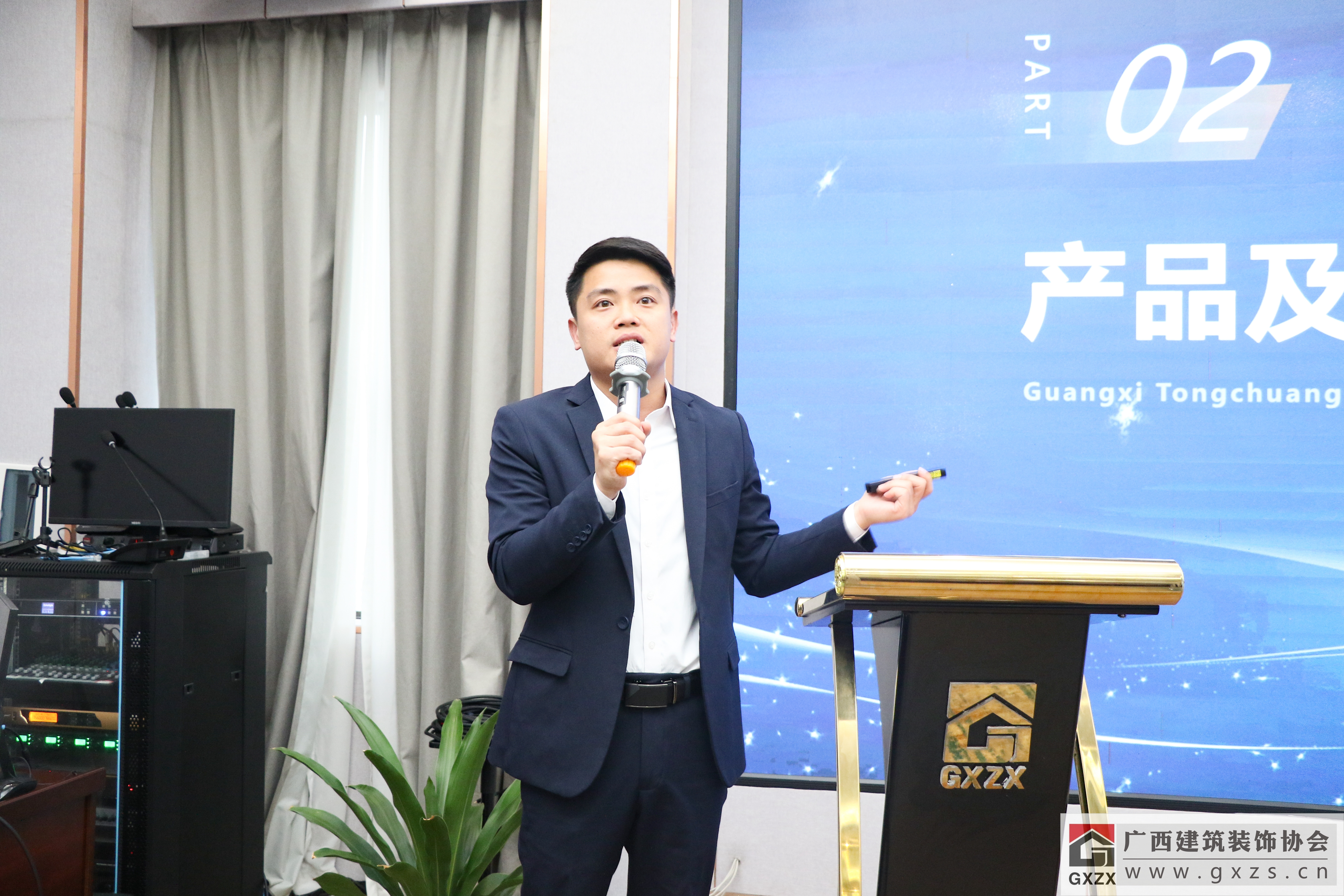 广西同创实业集团有限公司业务总经理谢林志带来了“新产品 新技术 新机遇”主题分享。通过介绍同创顶墙的无缝技术和顶墙材料,分享了在公装、家装领域运用广泛、用户反馈良好的优质产品。
