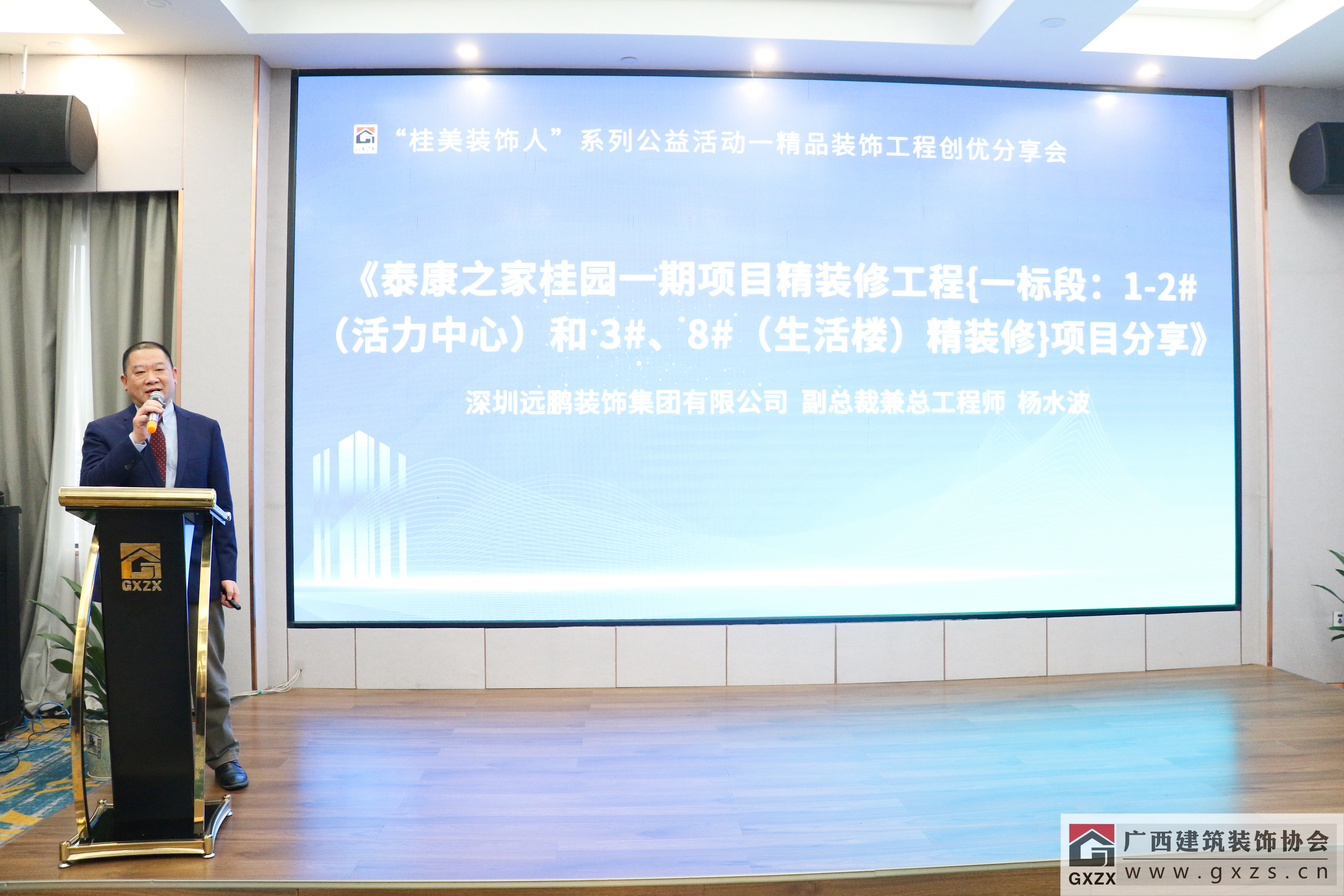 深圳远鹏装饰集团有限公司副总裁兼总工程师杨水波带来了主题为“泰康之家桂园一期项目精装修工程{一标段:1-2#(活力中心)和 3#、8#(生活楼)精装修}项目”的分享。分享了高端养老社区装饰项目中各个重难点施工部分的注意事项和应对方案,以及项目在施工策划、可视化管理、专项商务管理以及BIM技术的应用经验推广。