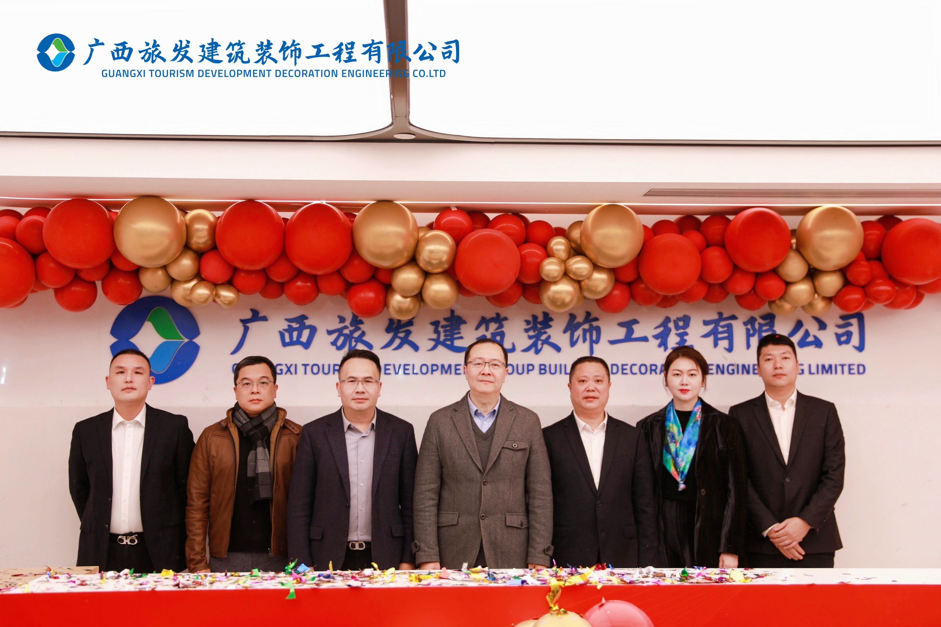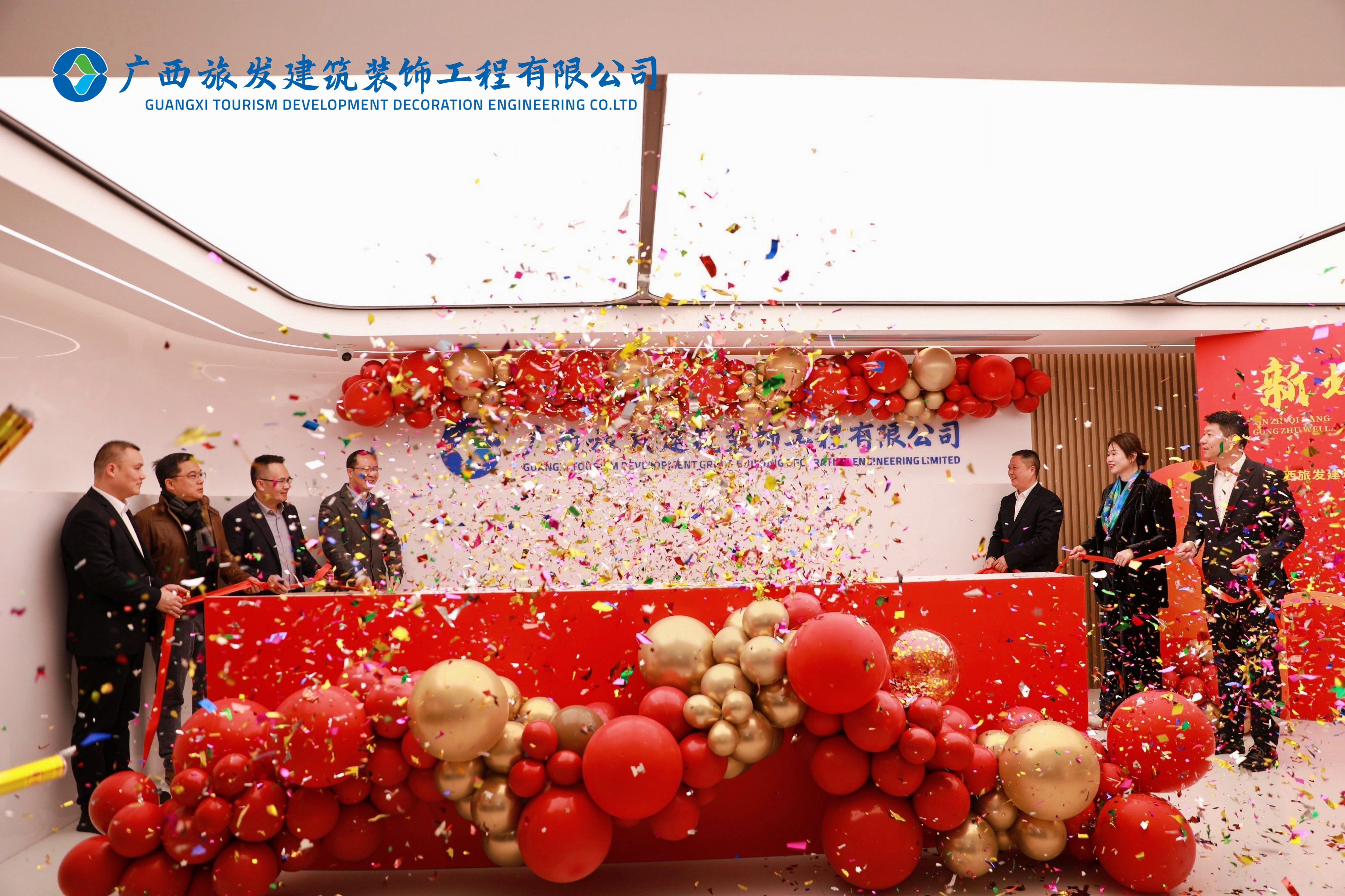 庞耀国会长,广旅集团总工程师姚照华,广旅置业集团党委副书记、总经理、董事周毅明,广旅置业集团副总经理、总工程师李春婵,广西艺术学院建筑艺术学院院长林海,广旅装饰公司董事长林毅、总经理徐俊共同为广旅装饰乔迁新址揭牌。