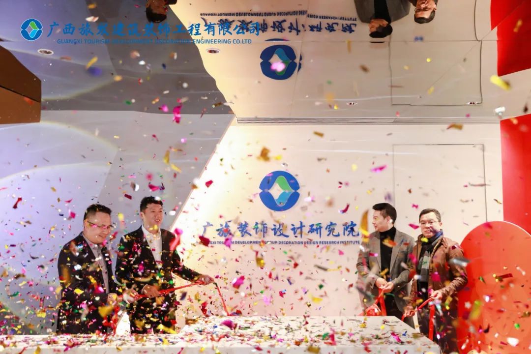 庞耀国会长,广西艺术学院建筑艺术学院院长林海,广旅装饰总经理徐俊,广旅装饰设计研究院院长马国彪为广旅装饰设计研究院揭牌。