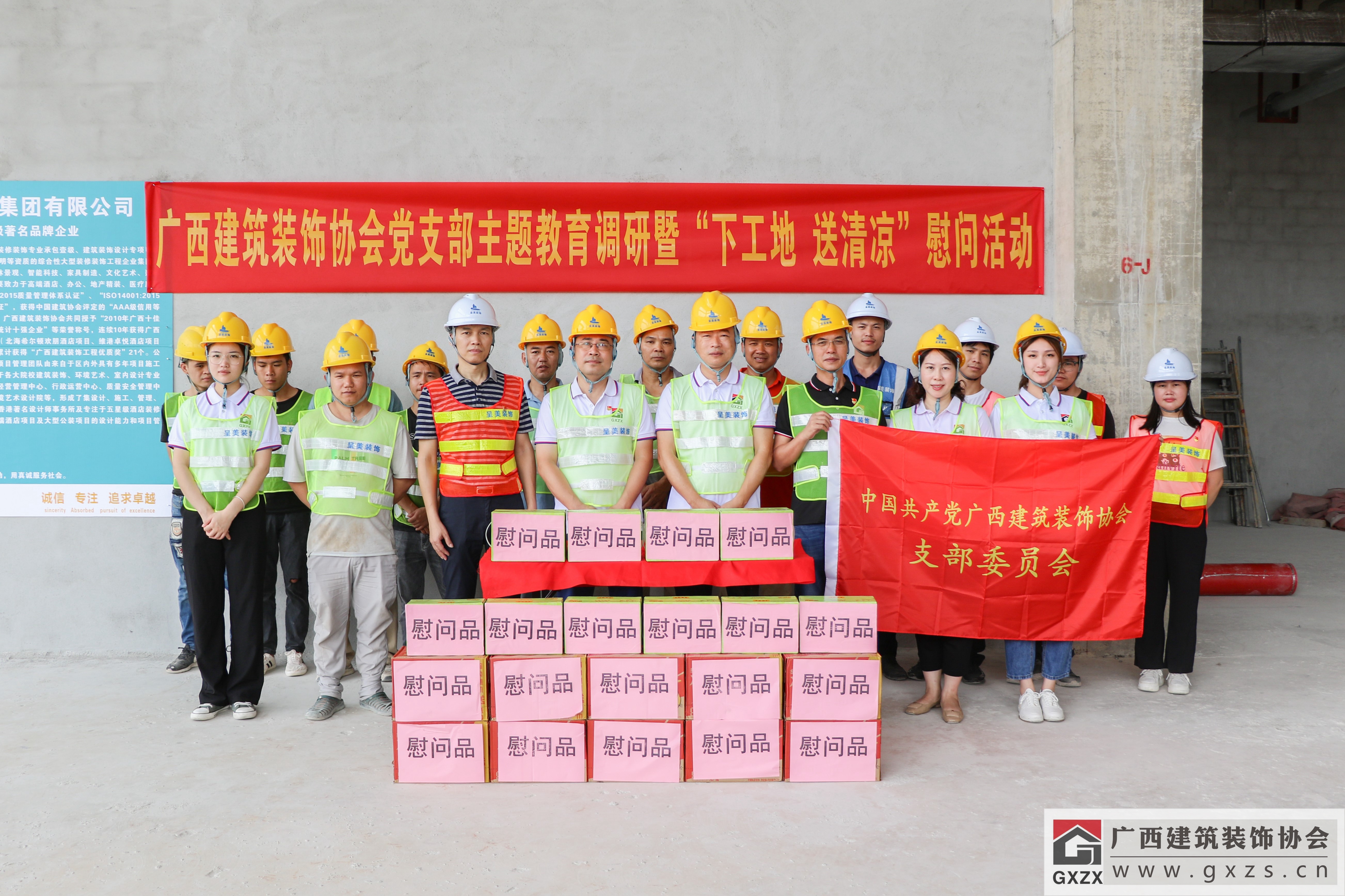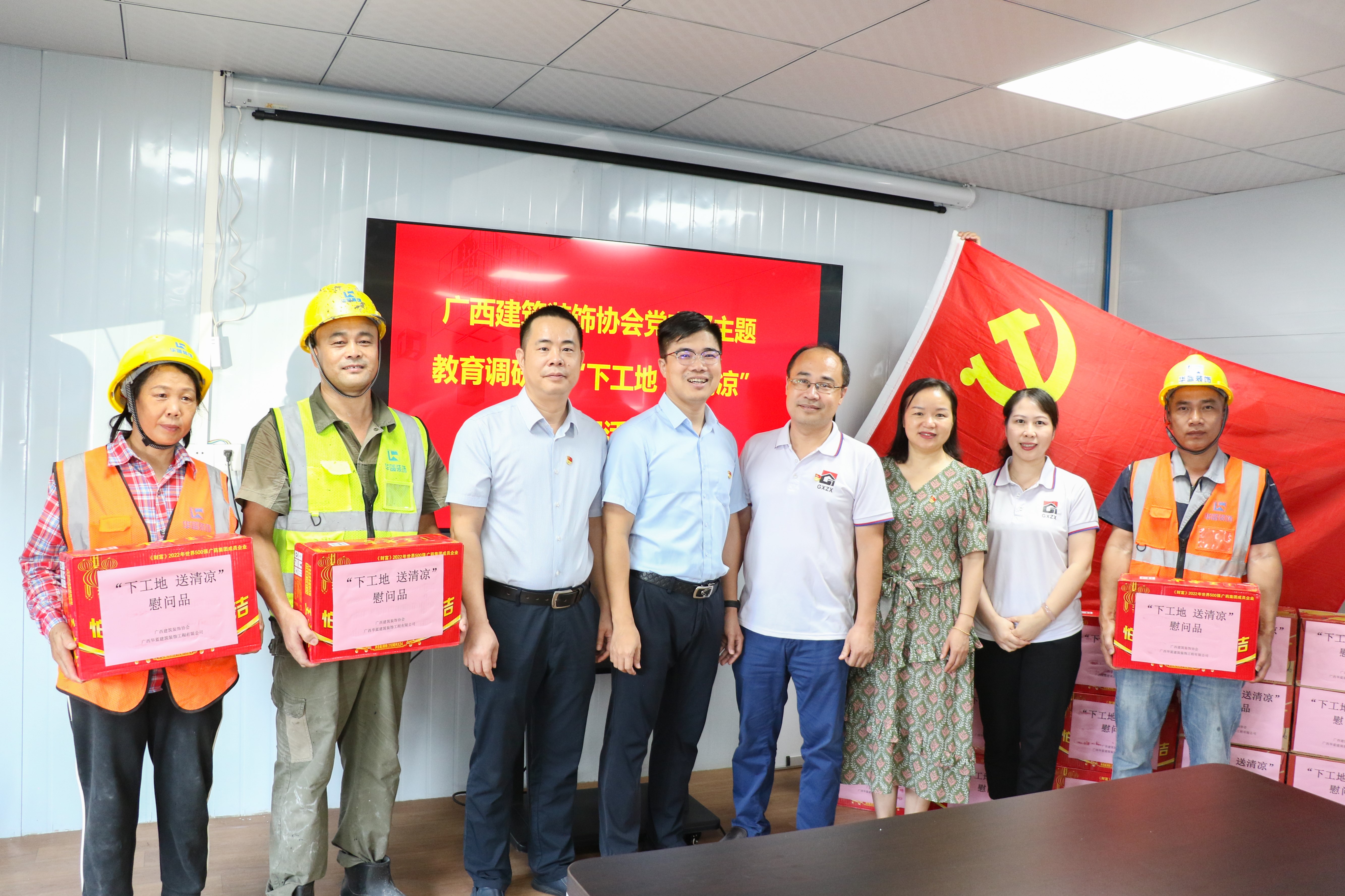 2023年6月,结合开展2023年全国第22个“安全生产月”活动主题要求,协会党支部组织开展安全知识进工地暨“送清凉”慰问活动,协会党支部书记黄榆带领协会秘书处及党支部部分成员,前往协会会员单位广西呈美装饰、广西富林建设、广西华蓝装饰在建工程项目工地,与企业党组织开展共建交流活动并开展调查研究工作,了解企业生产经营、项目施工进度、安全生产等情况,将安全生产、工伤预防宣传册以及防暑清凉慰问品发放到工人手中。