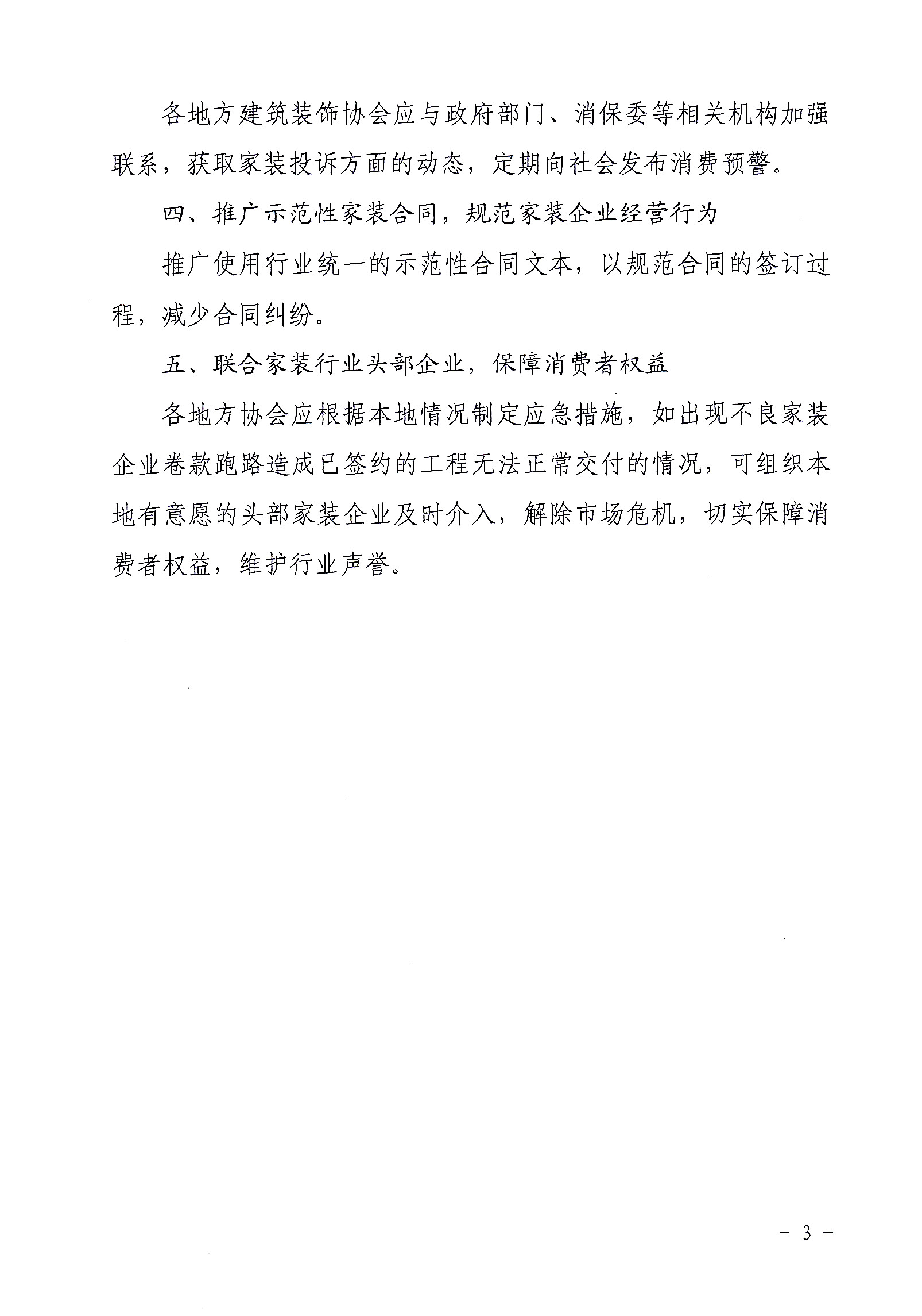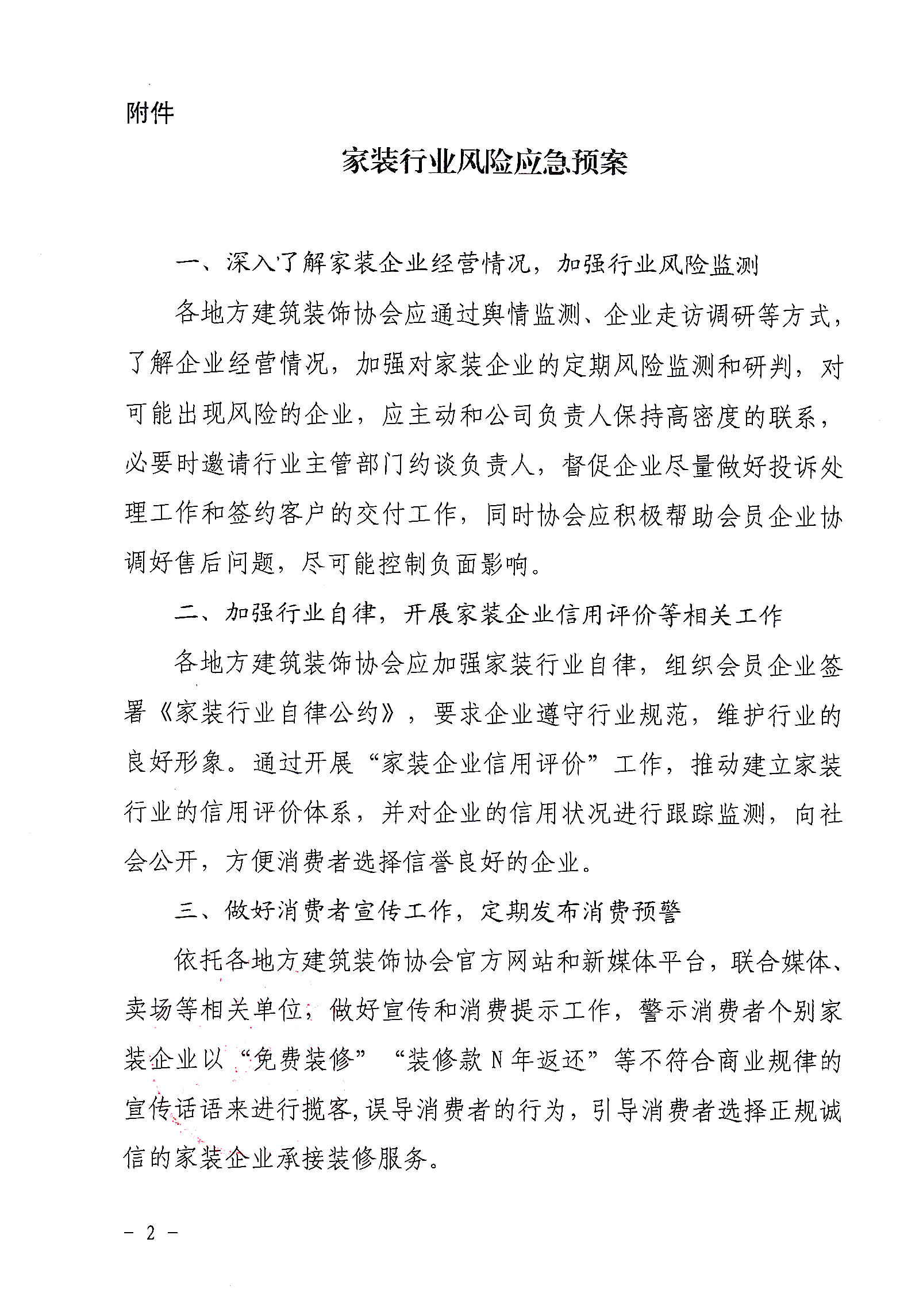 各省、自治区、直辖市建筑装饰协会(分会),新疆建设兵团建筑业协会,各会员企业、有关单位:为防范家装行业可能出现的系统性风险,维护消费者合法权益,促进家装行业持续健康发展,中国建筑装饰协会制定了家装行业风险应急预案(见附件)。请各地方建筑装饰协会重视此项工作,积极配合中装协做好家装企业风险监控,防患于未然。如有问题请联系中国建筑装饰协会住宅装饰装修和部品产业分会。