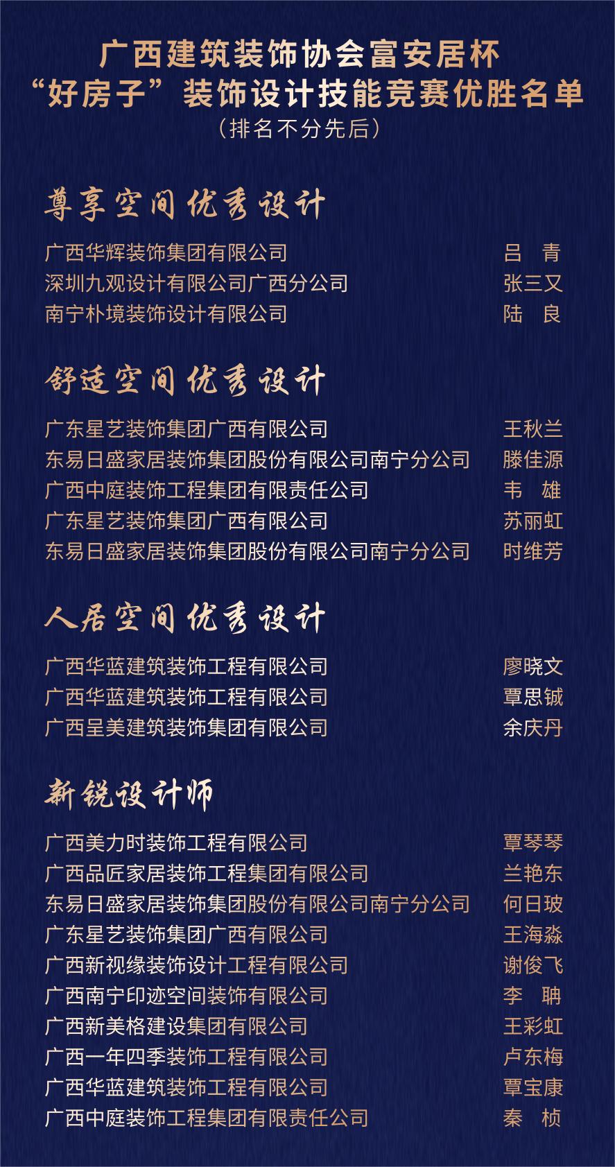 为践行“好房子”的宜居空间设计理念,让“好设计”引领“好房子”,以“新设计 新住宅 新生活”为主题,广西建筑装饰协会与富安居[国际]家居建材广场联合举办了富安居杯“好房子”装饰设计技能竞赛,按照赛制要求,经过严格的专家初评、复评和终评环节及评审结果公示,最终评选出尊享空间优秀设计3名,舒适空间优秀设计5名,人居空间优秀设计3名以及新锐设计师10名。
