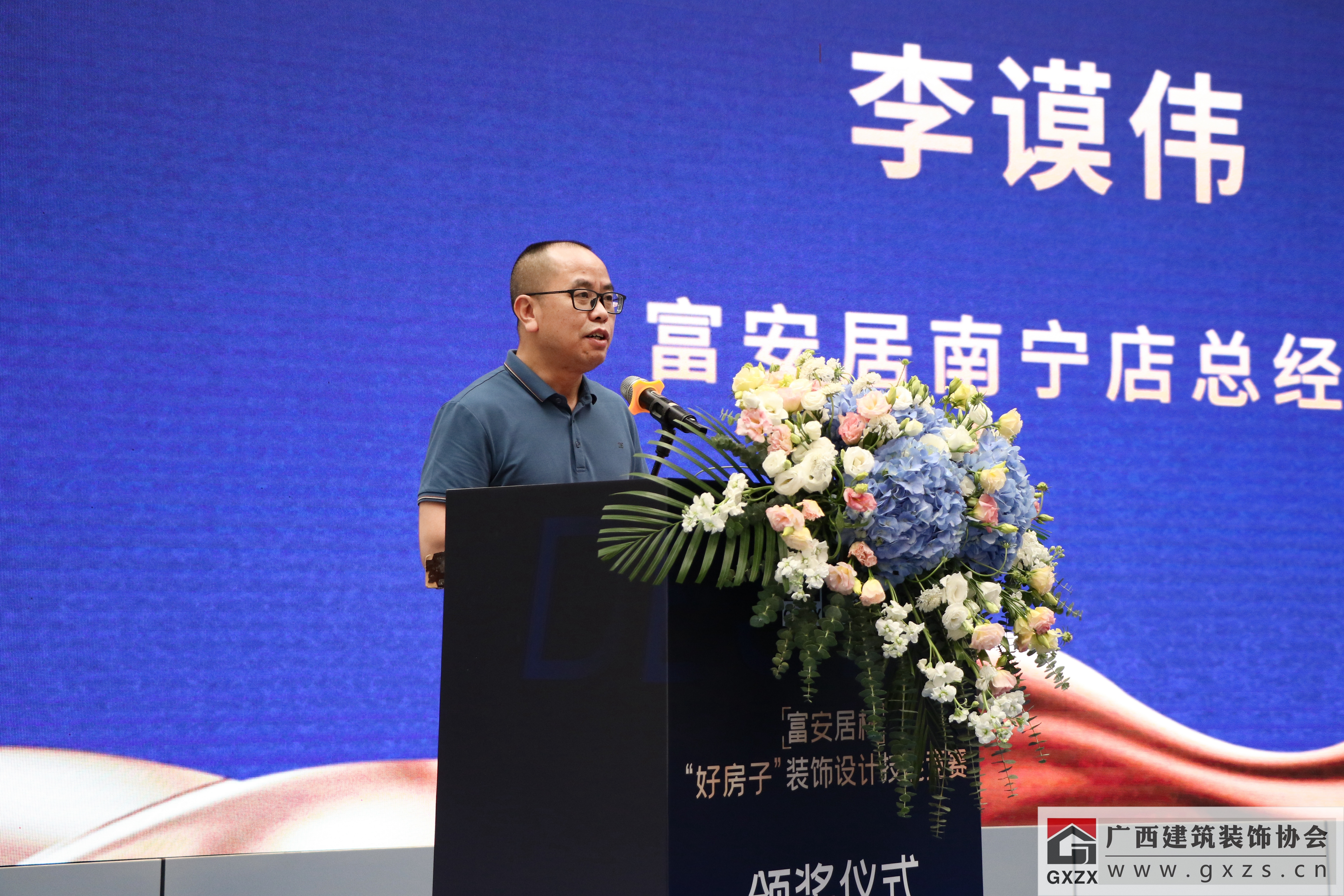 富安居南宁店总经理李谟伟为本次活动致欢迎辞。对获奖设计师表示热烈的祝贺,并对所有参与本次竞赛的设计师们表示感谢。他简要介绍了富安居作为广西地区家居建材龙头企业在推动家居装饰行业发展方面所做的努力和取得的成就。李谟伟表示,“好房子”首先需要好设计,这既离不开设计师们的创意汇聚,也离不开品质家居建材产品的完美呈现,富安居将继续支持并参与此类活动,助力广西家居装饰行业的蓬勃发展。