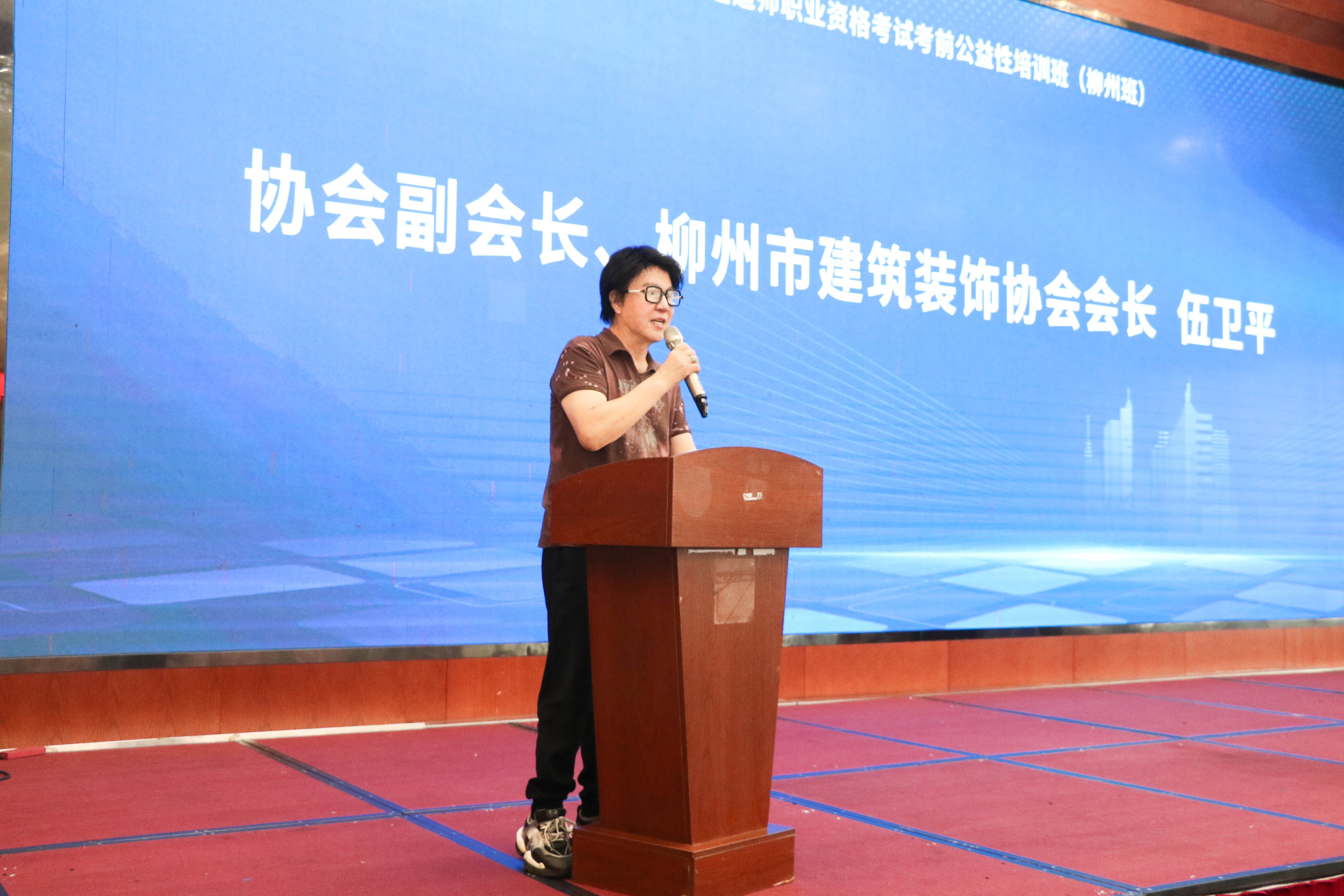 协会副会长、柳州市建筑装饰协会会长伍卫平作为柳州地区装饰行业的东道主,发表了热情洋溢的讲话。他说到,本次公益培训能在柳州市举办,是给柳州同行们带来实实在在的行业福利,相信通过广西建筑装饰协会的精心组织培训,大家能够学有所获,考有所用,不断提升自己的专业技能和素质。他勉励大家珍惜这次难得的学习机会,以饱满的热情和认真的态度投入到学习中去,紧跟老师思路上课及学习。此外,伍卫平指出,一级建造师是企业的主要技术力量代表,同时是建筑行业及时代中坚力量,具有重要的社会责任和使命感。希望大家在培训学习中提升,学以致用,更好地服务企业及行业,为广西和柳州建筑装饰行业的繁荣发展作出积极贡献。
