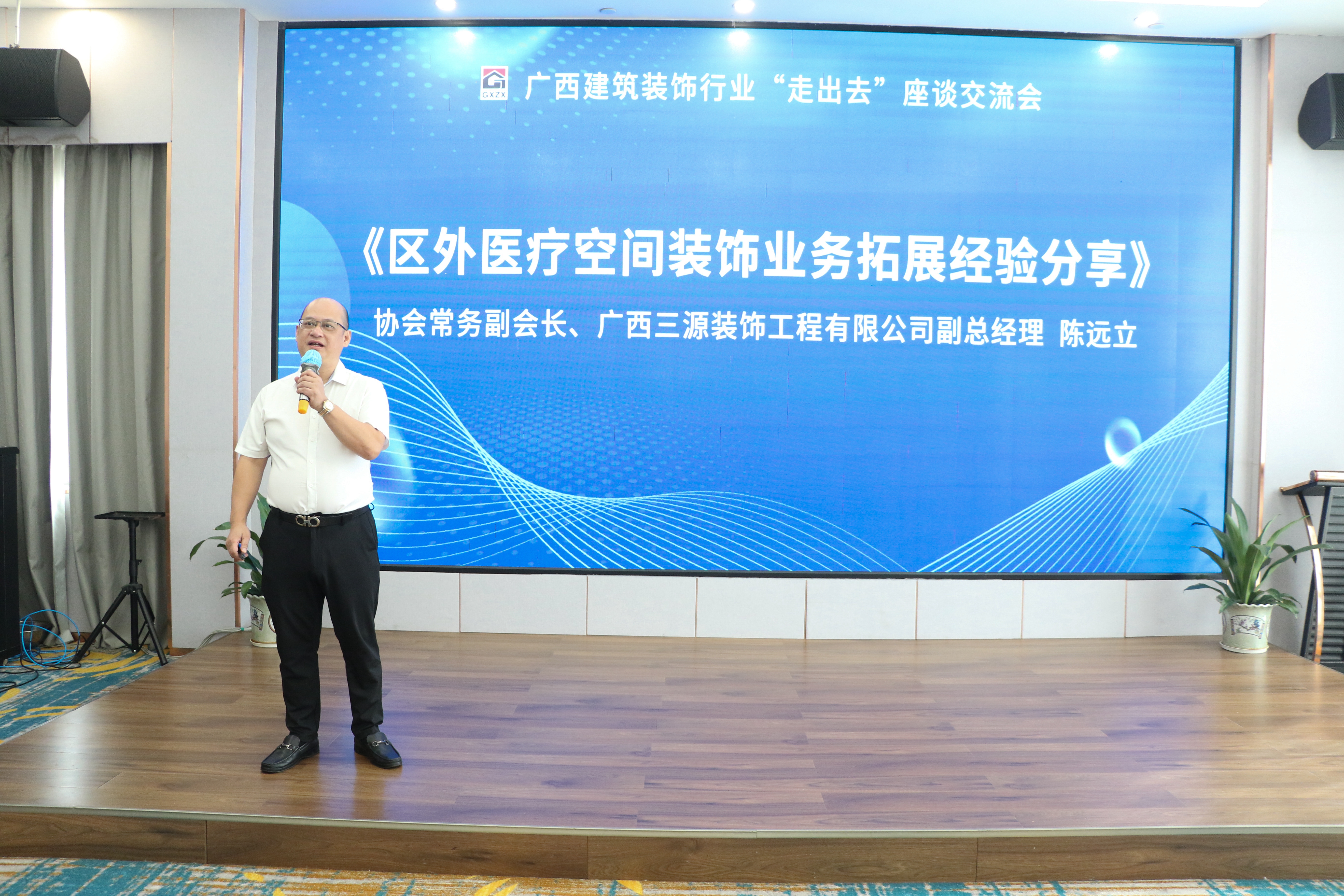 协会常务副会长、广西三源装饰工程有限公司副总经理陈远立主讲《区外医疗空间装饰业务拓展经验》,他重点分享了公司在区外医疗空间装饰业务中的实践,为同行企业提供了有价值的参考。