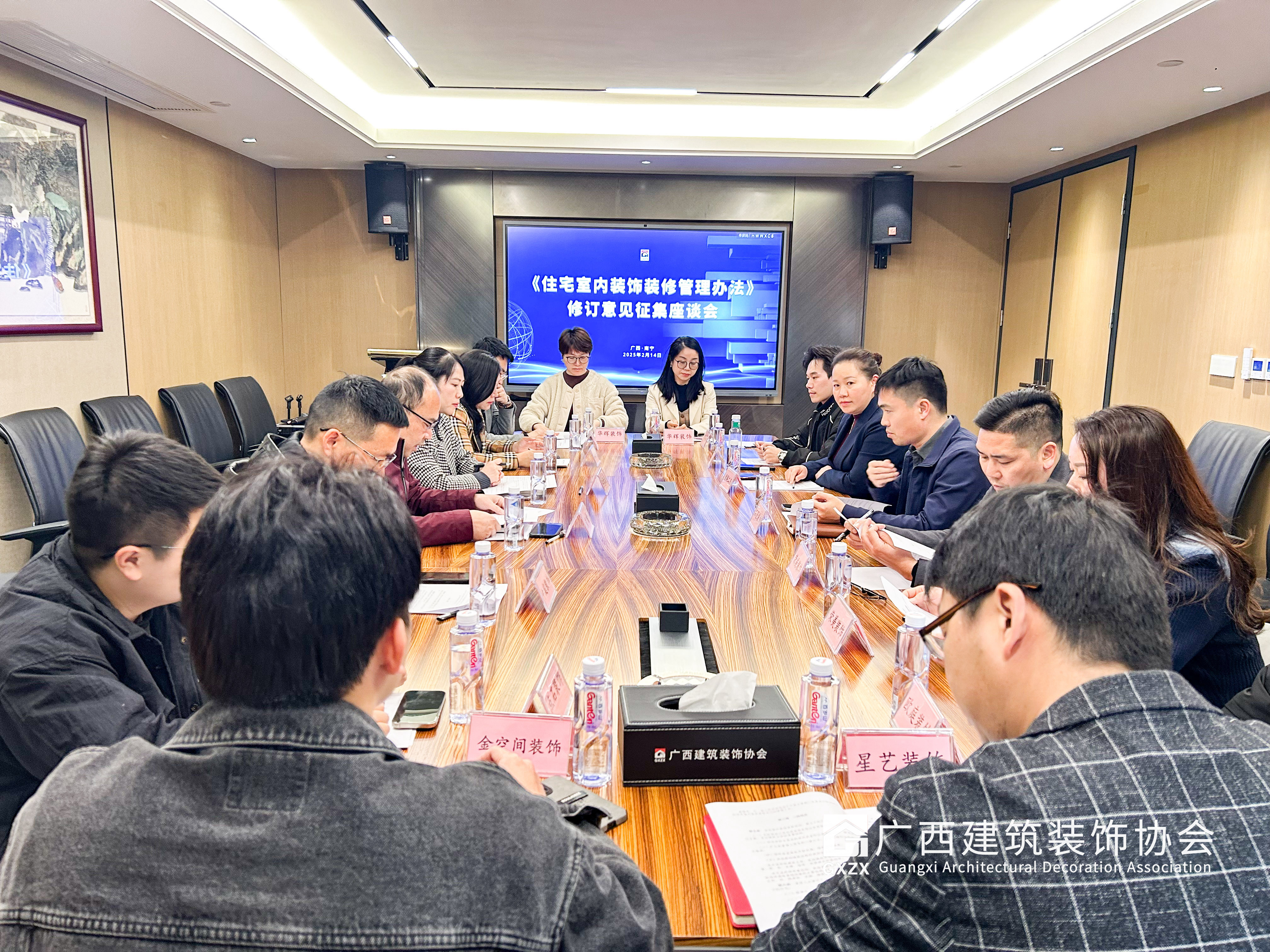 《住宅室内装饰装修管理办法》(建设部令第 110 号)自 2002 年颁布实施以来,一直是我国开展住宅室内装饰装修活动的主要依据,为规范家装行业市场秩序、明晰各方责权利关系,保障工程质量与安全、维护消费者权益、驱动行业升级等方面发挥了重要作用。但是,随着行业发展不断变革,诸多条款已难以契合当下行业发展态势,为此,住房和城乡建设部计划对《住宅室内装饰装修管理办法》进行修订并委托中国建筑装饰协会住宅产业分会广泛征集行业意见,为管理办法的修订建言献策。广西建筑装饰协会对此高度重视,积极征集广西区域内行业协会、家装企业的修订意见。2025年2月14日,在南宁召开《住宅室内装饰装修管理办法》修订意见征集座谈会,来自协会的头部家装企业代表15人参加本次座谈会。协会副会长、住宅产业分会会长黄榆主持会议,陈雪玲秘书长参加本次会议。会上围绕《住宅室内装饰装修管理办法》的实施实践展开讨论。与会代表结合行业实际,对管理办法的相关条款方面提出了专业性、建设性的意见和建议。大家一致认为,住宅室内装饰装修事关千家万户的居住质量,修订管理办法将对行业规范发展起到积极作用。黄榆在总结发言中表示,非常感谢参会企业对管理办法提出的修订意见。协会除了召开现场会议,也通过柳州市建筑装饰协会、钦州市建筑装饰行业协会征集了柳州、钦州等地家装企业的意见建议,协会将认真梳理和归纳收集到的修订意见,及时反馈至中国建筑装饰协会住宅产业分会,为《住宅室内装饰装修管理办法》修订贡献广西行业力量。协会也将持续关注行业发展动态,发挥桥梁纽带作用,推动广西区域住宅装饰装修行业的健康发展,切实保障广大居民的居住安全和生活品质。