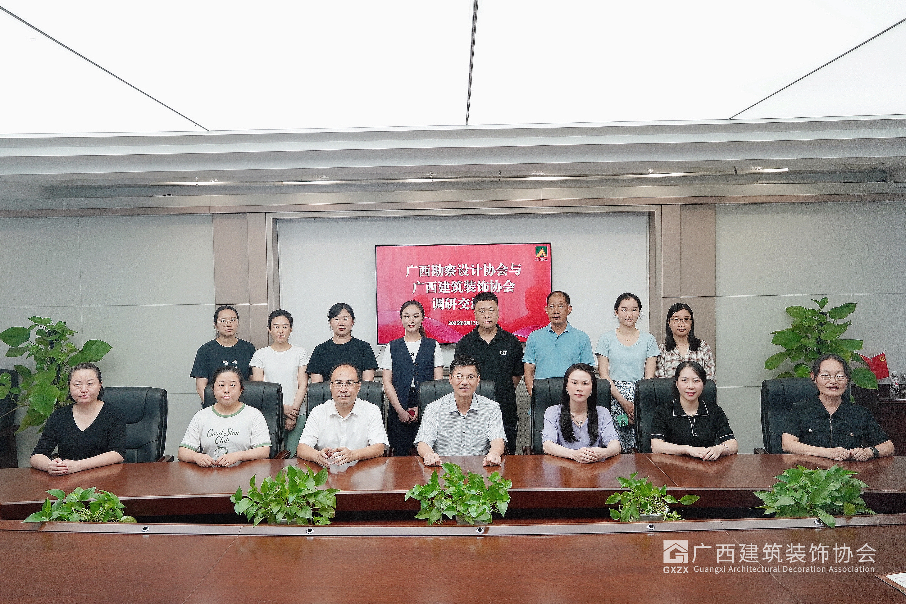 为加强协会间的交流合作,推动党建共建和行业发展,2025年6月13日,广西建筑装饰协会秘书处一行前往广西勘察设计协会开展调研交流。广西勘察设计协会党支部书记、理事长谢勇,副理事长兼秘书长覃燕娜,广西建筑装饰协会副会长黄榆、秘书长陈雪玲及双方协会秘书处相关人员约20人参加了本次活动。