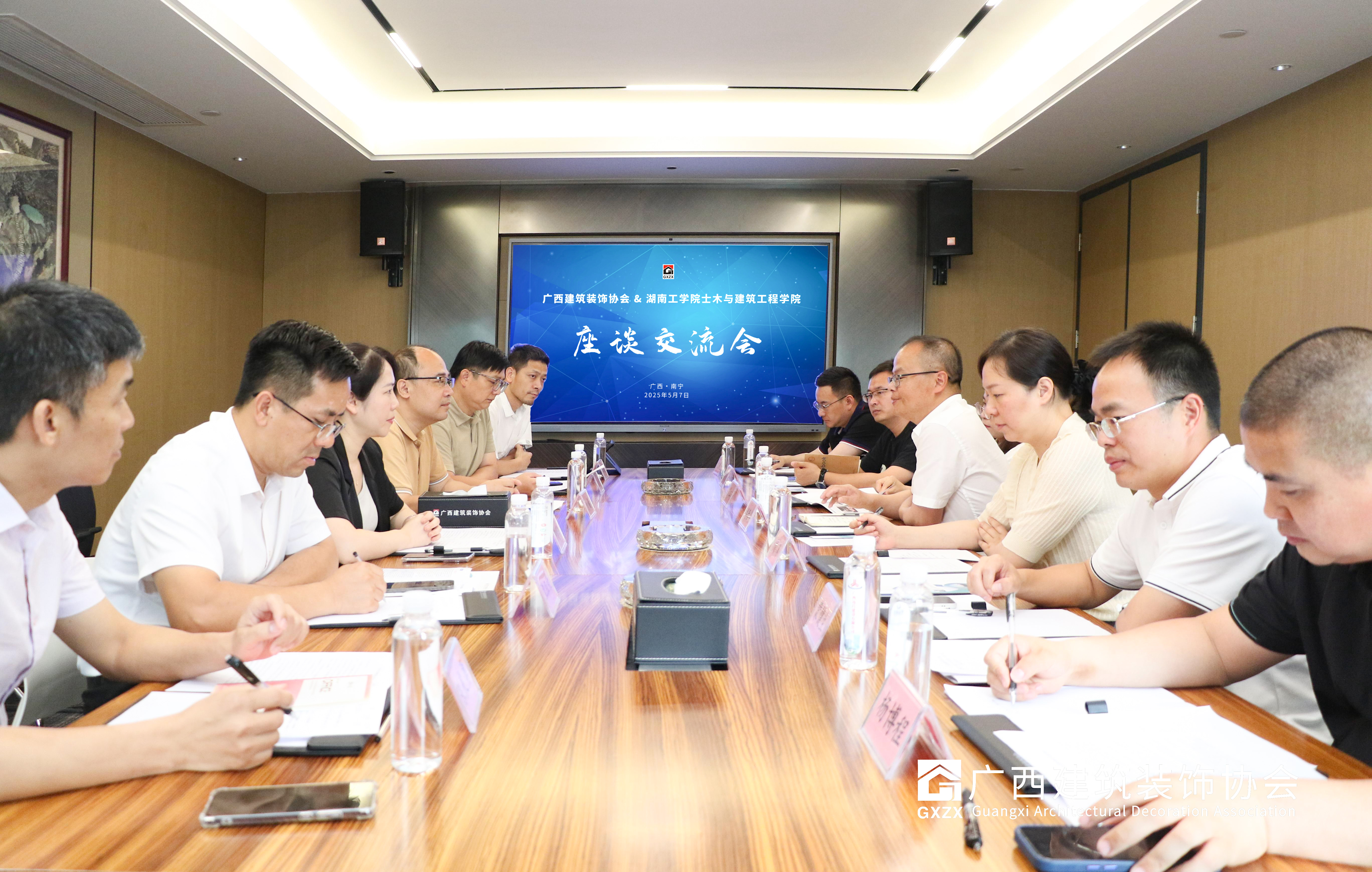 2025年5月7日,广西建筑装饰协会与湖南工学院土木与建筑工程学院举行座谈交流会。湖南工学院土木与建筑工程学院院长游春华、智能建造教研室副主任刘赛、工程实践教学中心副主任罗江花,湖南工学院校友代表、广西华辉装饰集团有限公司工程一分公司总经理蒙健生、广西宝联建筑劳务有限公司董事长李东龙、海南德裕工程有限公司南宁分公司总经理杨博程、广西恒鼎报废机动车回收有限公司董事长袁移龙,协会副会长黄榆、秘书长陈雪玲,协会专家、广西华辉装饰集团有限公司副总裁覃祖荣、广西华蓝建筑装饰工程有限公司副