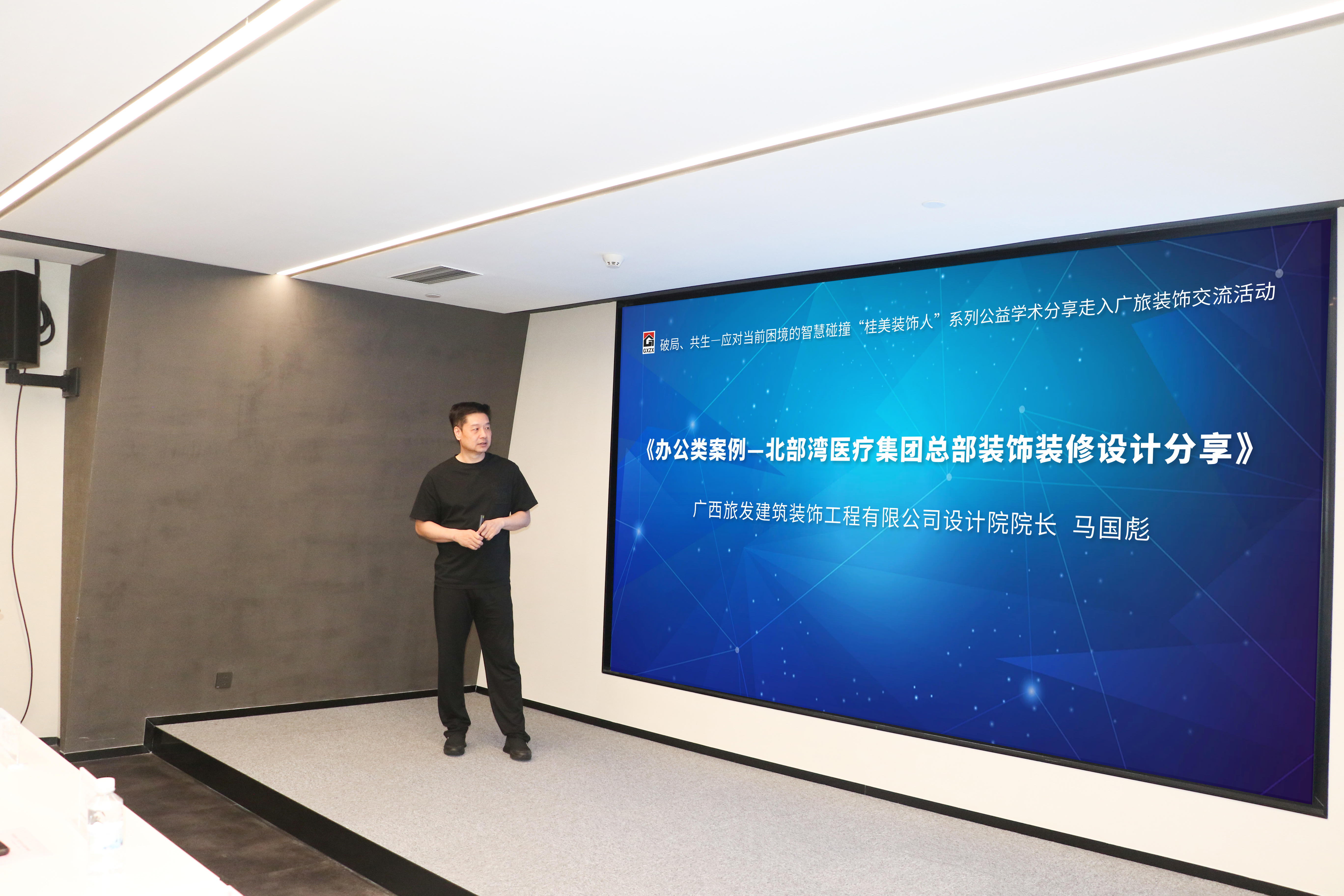 朱建宇在致辞中表示,“破局·共生”的主题,恰恰契合了当前建筑装饰行业由规模增长向高质量发展转型的关键阶段。设计已成为推动行业转型升级的核心力量,但设计不应只是图纸和美感的表达,更是项目成功落地与否、企业品牌高度、用户体验优劣的关键变量。希望协会“桂美装饰人”系列公益学术分享活动,能为优秀设计师提供了展示与交流的舞台,更能推动行业理念升级、实践经验沉淀和设计价值传导。此次广旅装饰专场活动涵盖办公案例、酒店案例、商业设计案例、奢装案例,内容专业、案例鲜活、思路开放,是一次真正落地的学术分享,也是一次面向未来的行业共振。未来协会及设计分会将继续加大对设计师群体的服务力度,汇聚更多有经验、有思想、有责任的“桂美装饰人”,打造一个更加有温度、有深度、有广度的交流平台,让广西装饰设计力量真正“走出来、亮起来、强起来”。