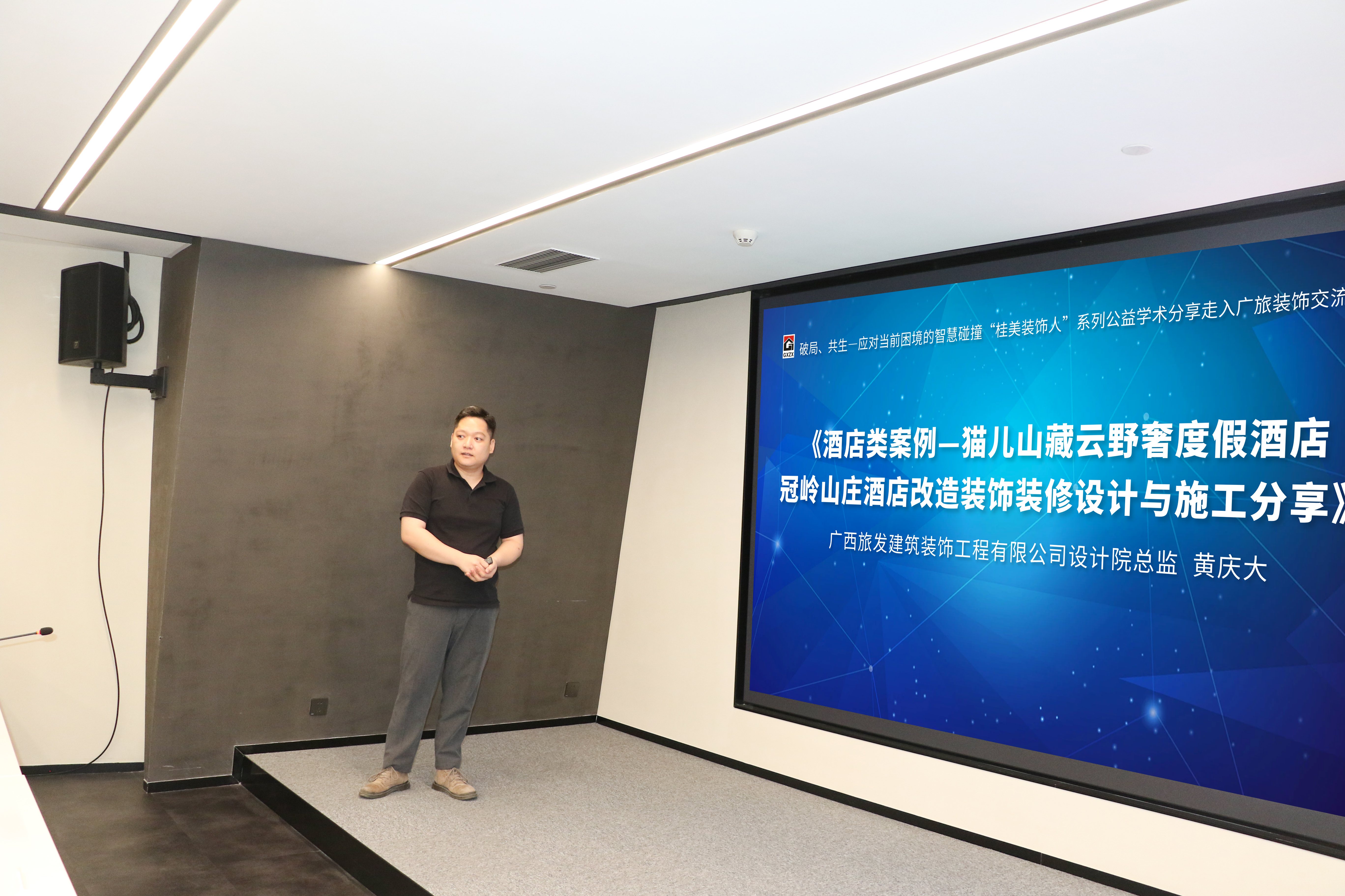 黄庆大分享了《酒店类案例——猫儿山藏云野奢度假酒店、冠岭山庄酒店改造装饰装修设计与施工》的精彩内容,展示了在自然风貌与空间艺术之间取得平衡的探索成果。