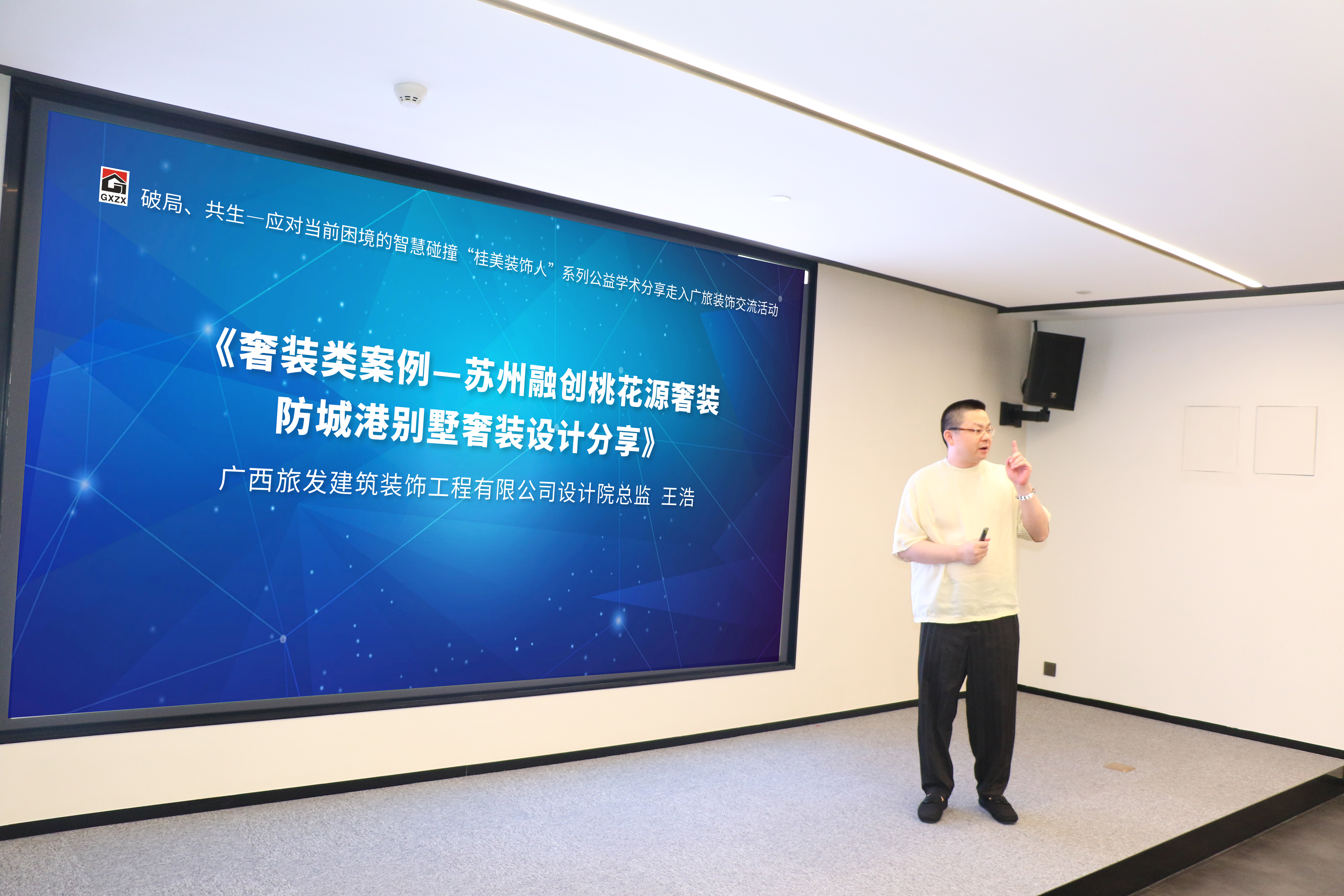 王浩以《奢装类案例——苏州融创桃花源奢装、防城港别墅奢装设计》为主题,展示了团队在高端定制、材质语言、审美表达等方面的深度思考,体现了广旅装饰在高端住宅领域的设计实力与艺术追求。
