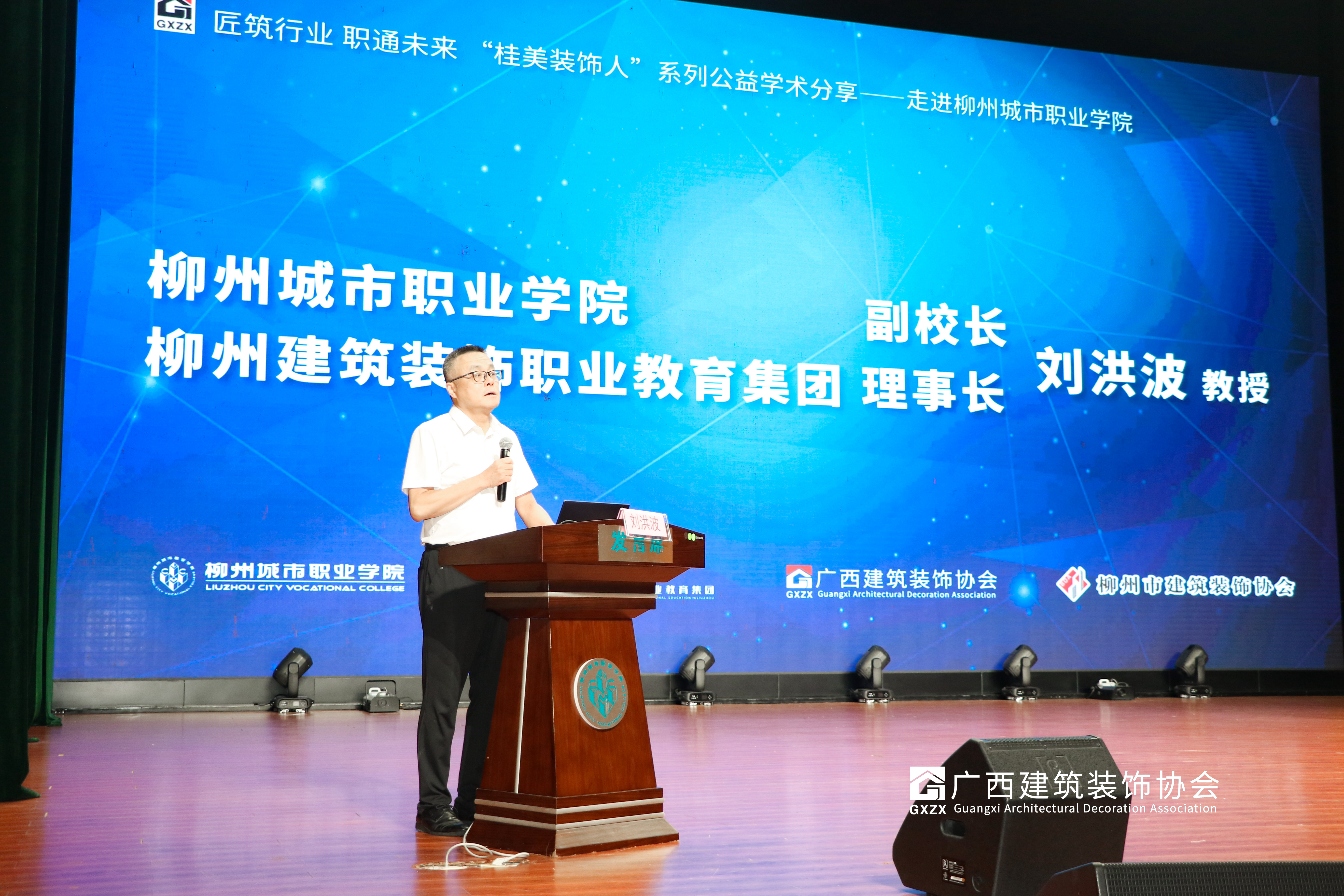 刘洪波教授代表学校对分享嘉宾、参会代表表示热烈欢迎。他谈到,学校建筑工程与艺术设计学院常年致力于建筑设计专业群高水平专业建设与特色发展,本次学校及柳州建筑装饰职业教育集团与广西建筑装饰协会联合,将“桂美装饰人”学术系列讲座引进柳州城市职业学院,走进柳州建筑装饰职业教育集团,走进柳州建筑装饰行业,是广西建筑装饰行业一次学术交流的盛会。本次分享交流,汇聚了广西建筑装饰行业的龙头精英、建装行业细分领域的代表、9所本科及职业院校师生大家将在这里认识行业现状与趋势,交流思想与理念、切磋新技术新工艺及新的技术解决方案,希望今天的分享会能够为大家带来启发和帮助,也希望大家能够在今后的学习和工作中不断探索和创新,为建筑装饰行业的发展贡献自己的力量。