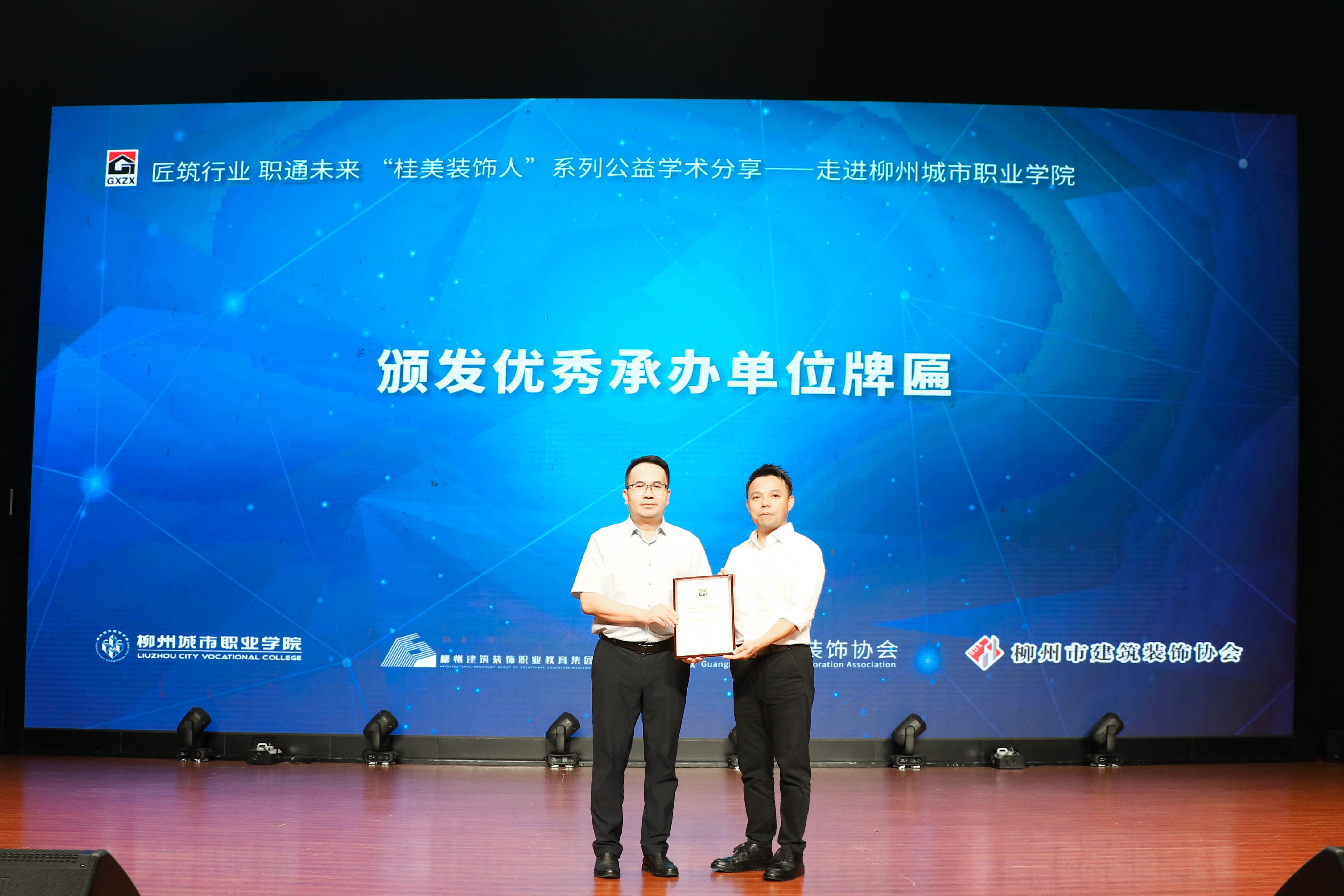 庞耀国对柳州城市职业学院、柳州建筑装饰职业教育集团精心配合,共同组织本次交流表示衷心感谢。他指出,“桂美装饰人”学术系列公益分享交流活动,是协会精心打造的“金字招牌”,对外交流的“响亮名片”;同时是自治区住房城乡建设行业党委认可的党建品牌,本次“桂美装饰人”走进高校分享首次走出南宁,来到柳州城市职业学院,协会对此高度重视,臻选各领域代表精心准备分享内容。