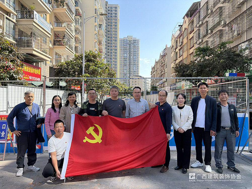 11月24日,协会一行到玉林市建筑业联合会开展建筑装饰产业调研,随后,双方到在建的城市更新项目开展“发挥行业力量 共促城市更新”主题党日活动。玉林市建筑业联合会秘书长陈坚、党支部党员代表以及秘书处相关部门负责人参加活动。交流期间,双方共同学习了中央城市工作会议相关精神,探讨了如何发挥双方行业协会资源及优势,推进广西建筑装饰产业以及玉林市城市更新工作可持续发展等议题。