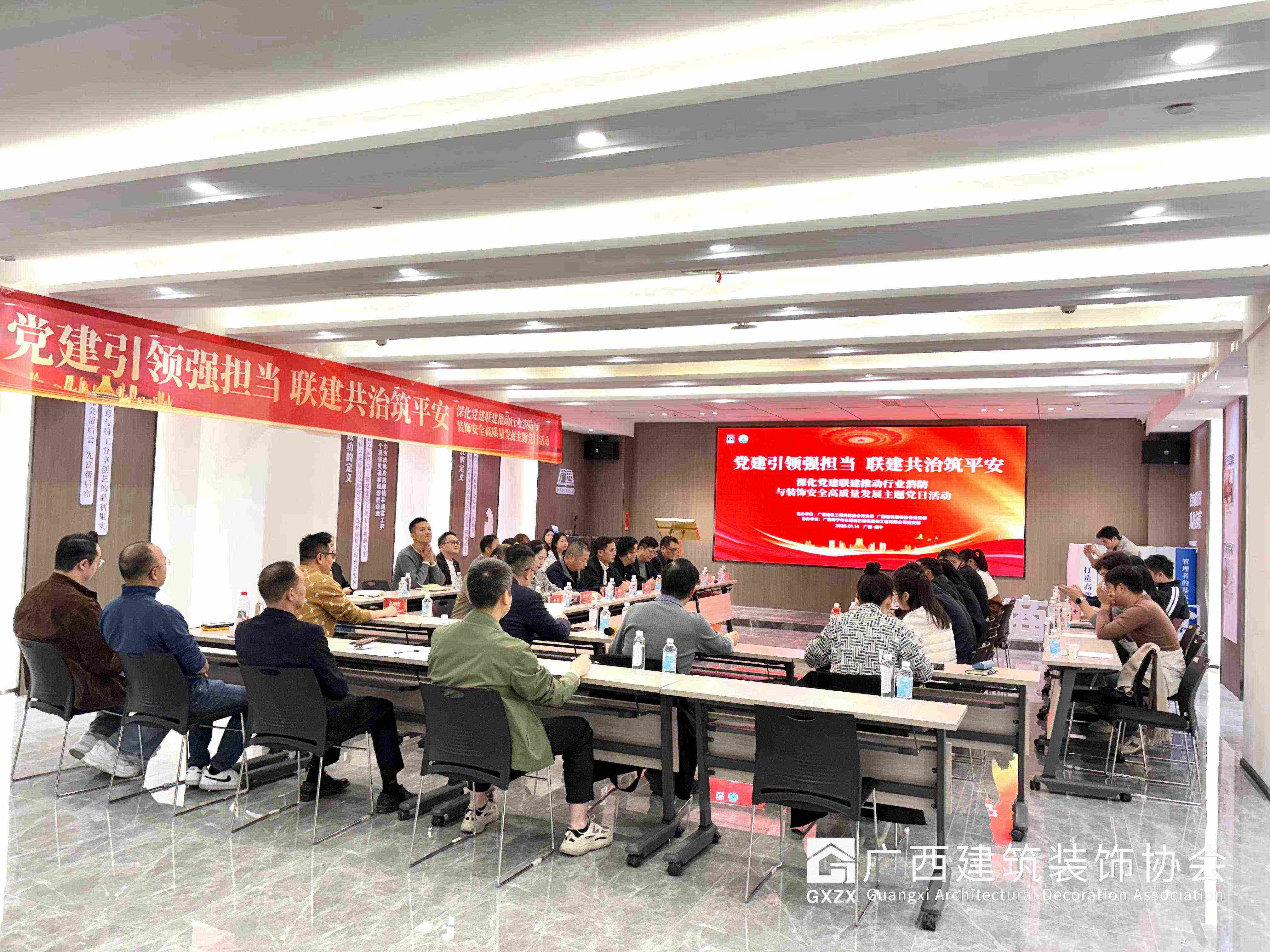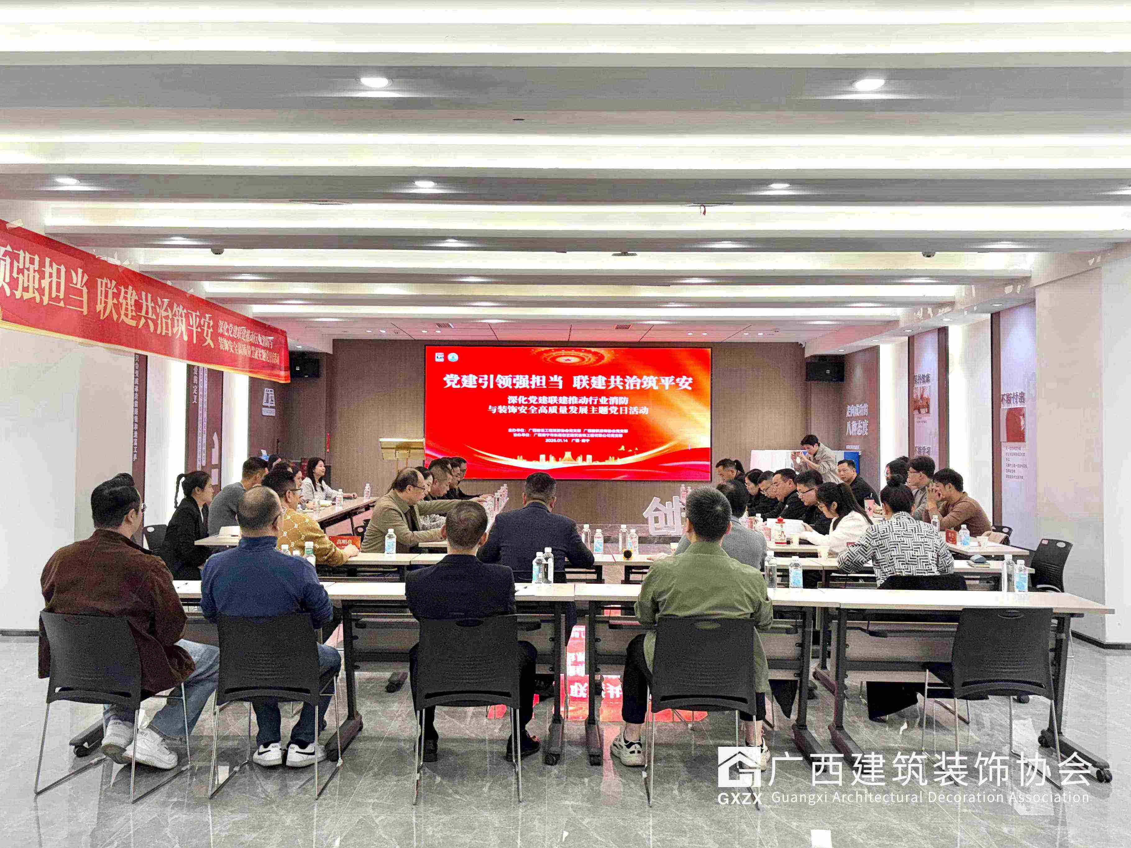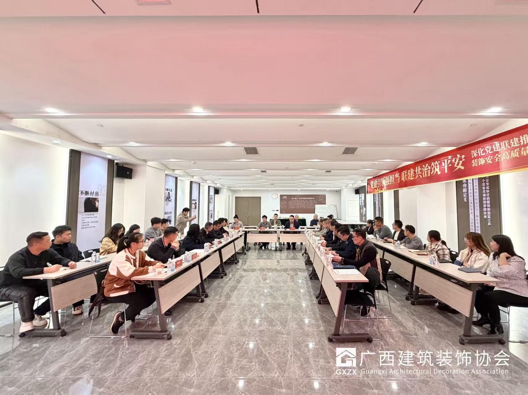 2026年1月14日,广西建筑装饰协会与广西建设工程消防协会在南宁市创艺装饰广西大区总部联合举办“党建引领强担当 联建共治筑平安-深化党建联建推动行业消防与装饰安全高质量发展”主题党日活动。本次活动旨在深入学习贯彻党的二十届四中全会精神,强化行业安全生产底线意识,推动党建与业务深度融合。广西建筑装饰协会党支部书记、会长庞耀国、支部支委黄榆、蒙德攀、秘书长陈雪玲,广西建设工程消防协会党支部书记、会长彭新唐、秘书长郭婷等两家协会党员代表、行业专家以及创艺装饰工程管理人员近50人参加活动。活动由广西建设工程消防协会秘书长郭婷主持。