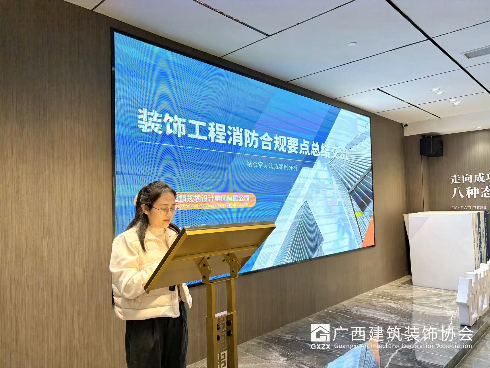 在学术交流环节,南宁建规集团总工程师李梓瑄作《装饰工程中消防案例分析》专题分享,通过典型案例深刻剖析装饰工程中的消防技术要点。广西建筑装饰协会专家委员会常务副主任兼总工程师、正高级工程师谭谦围绕《装饰装修工程中消防工程事项及常见问题探讨》作交流发言,针对消防验收与装饰工程衔接难点提出专业见解。