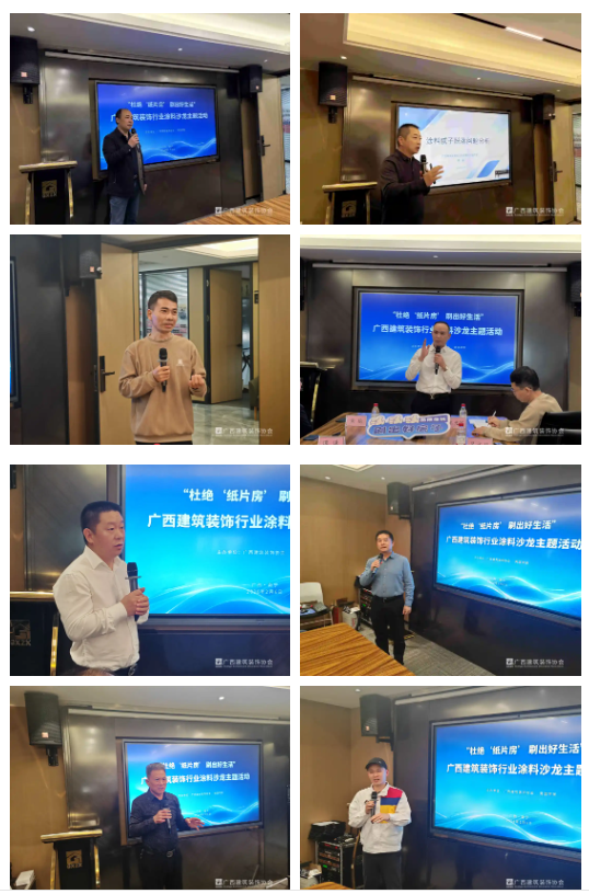 本次活动旨在探讨掉漆及其他涂料问题的解决方案,规范市场施工行为,并向消费者传导科普涂料施工相关知识。针对近期南宁市出现的多起严重掉漆事件(其中包括南国早报报道的全屋空间呈纸片状掉漆案例),谭谦和吴文战分别从施工规范和施工实操方面介绍了腻子涂料脱落的原因以及解决办法。商家代表则从产品角度对相关问题开展交流讨论,交流议题涵盖了涂料施工中的多个痛点,包括施工不规范现象、师傅技能更新培训、涂料开裂问题治理以及厂家与经销商的售后服务完善等,现场交流气氛热烈。