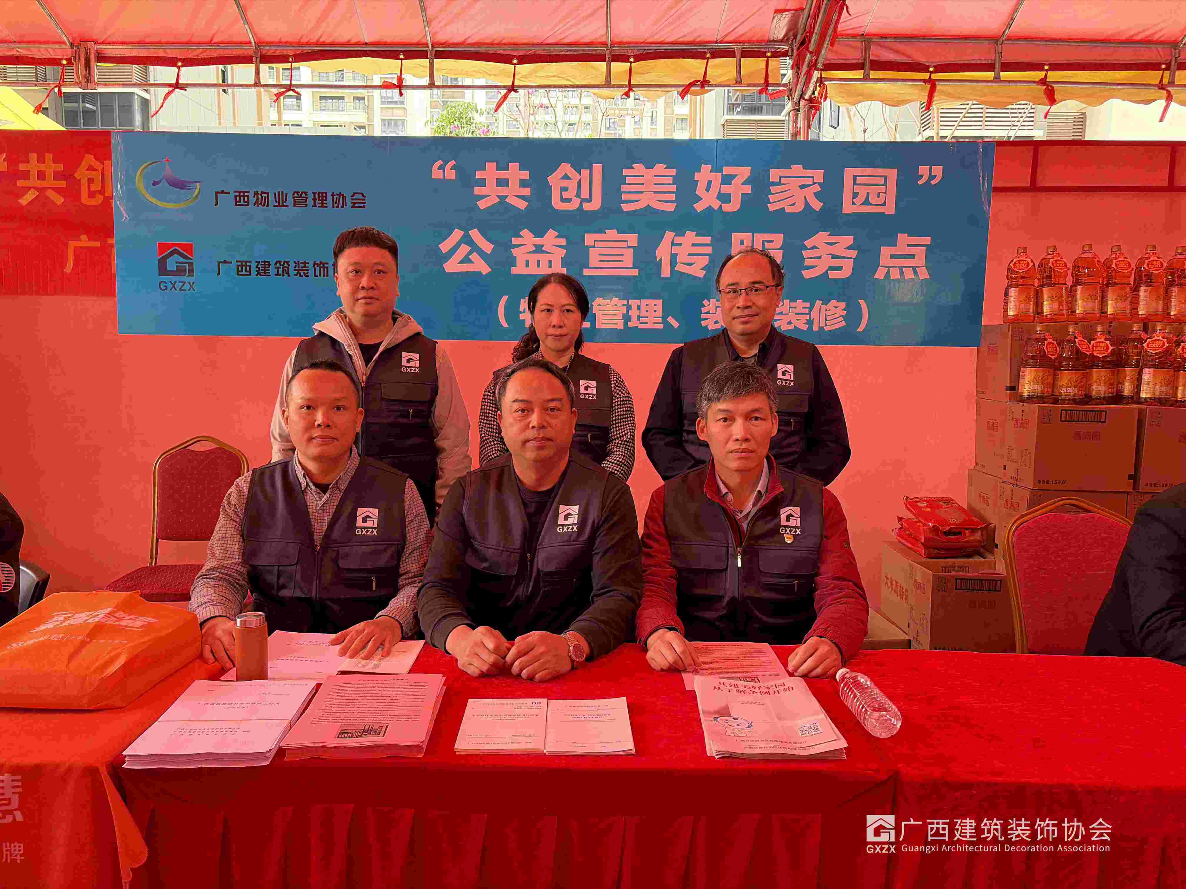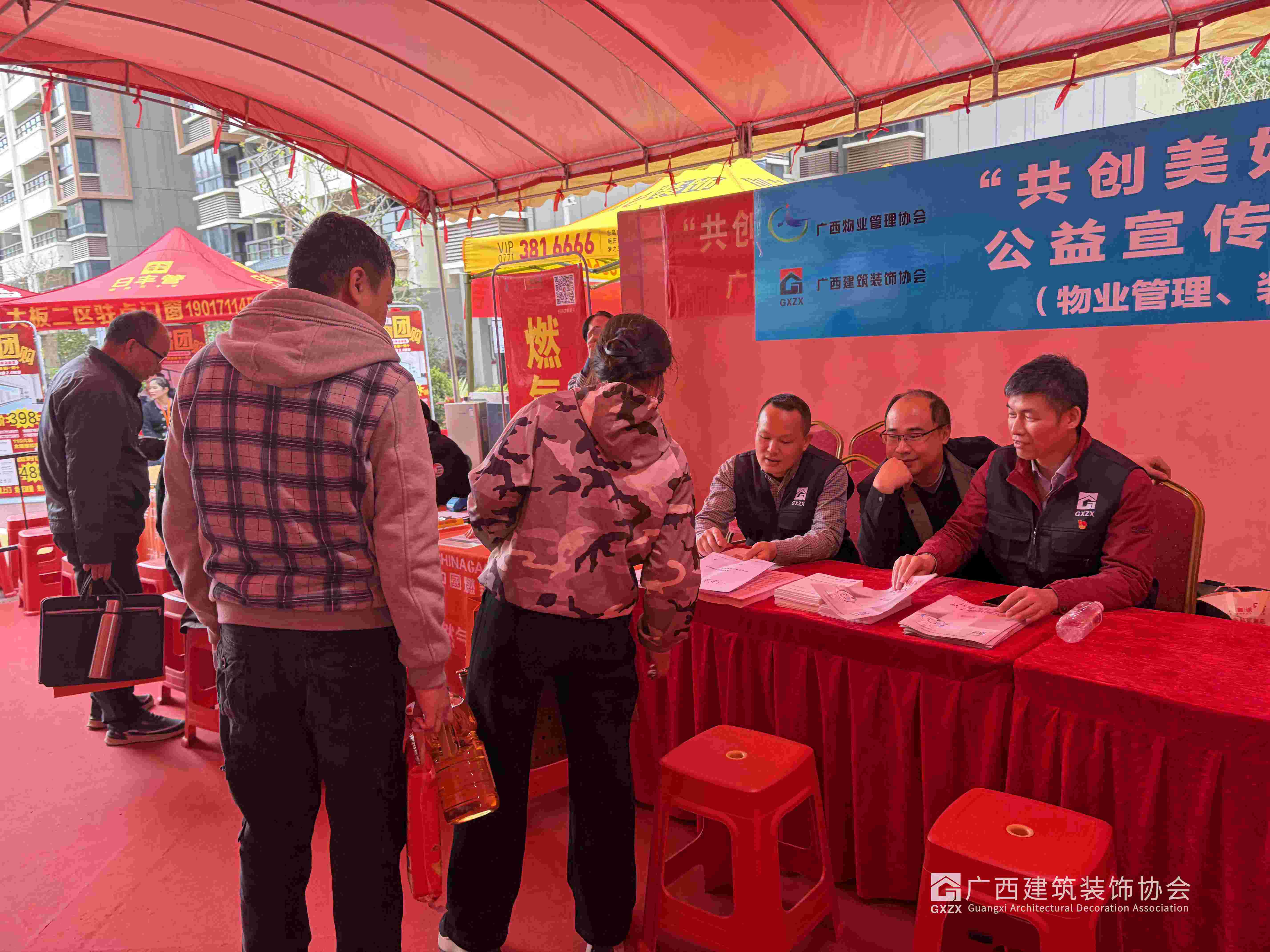 为进一步贯彻落实国家及自治区关于加强装饰装修行业和物业管理管理的相关政策要求,提升广大业主的法律意识和安全防范能力,广西建筑装饰协会与广西物业管理协会于2026年2月7日在南宁市大板二区中心广场联合举办“共创美好家园”装饰装修、物业管理的公益宣传服务活动。本次活动旨在通过专业、系统的公益宣传,向广大业主普及装饰装修与物业管理领域的核心知识。一是在装饰装修方面。将围绕装修施工安全、材料科学选购、白蚁防治措施、常见质量问题防治等业主关切的热点问题,提供专业指导和实用建议,并印制了相关的公益知识宣传单,助力业主树立科学消费观念,提升自我保护能力。二是在物业管理方面。将重点解读物业管理相关法律法规、业主权利与义务、物业服务费构成及使用、小区公共设施维护等内容,帮助业主明晰自身权益与责任。