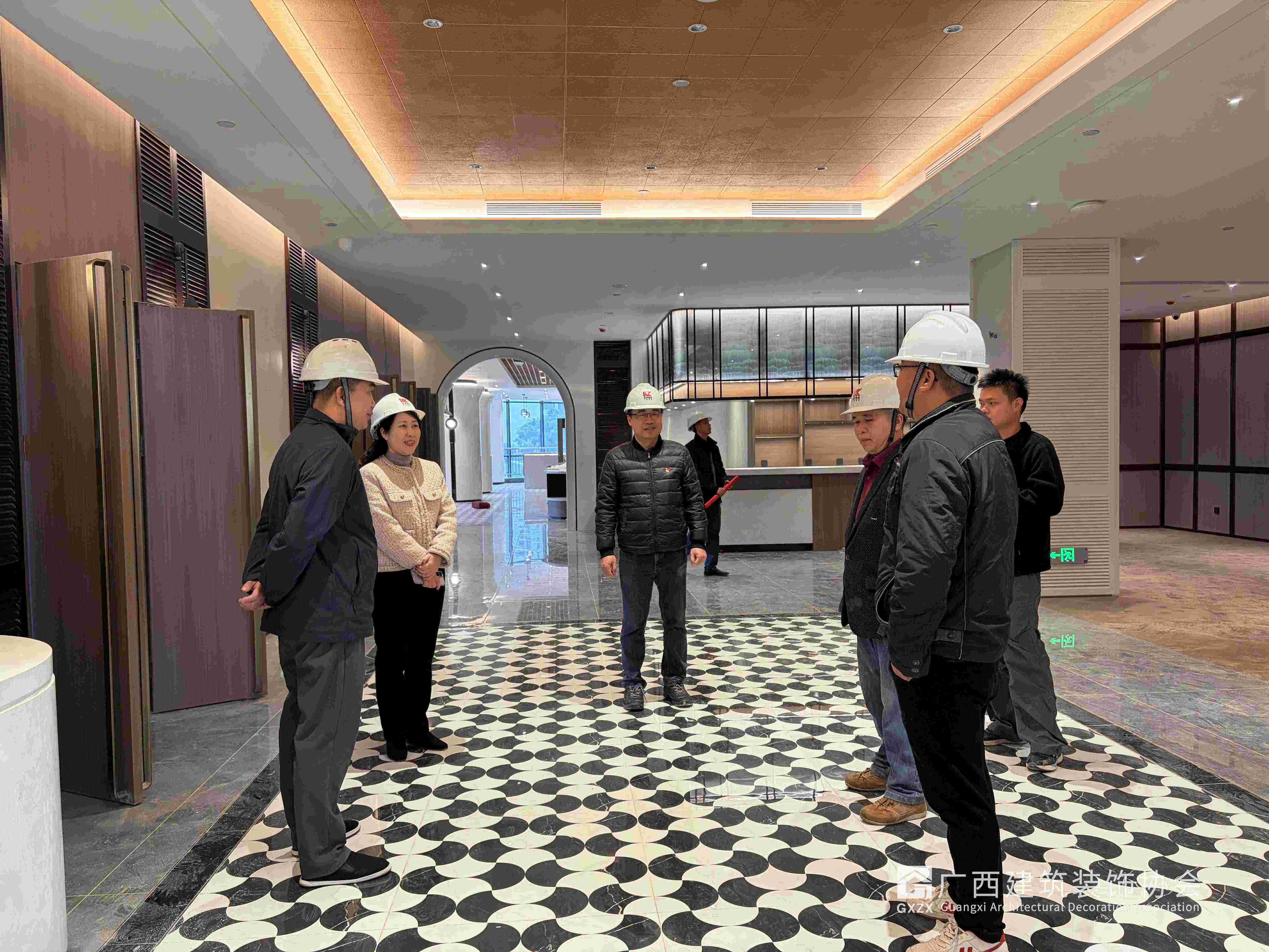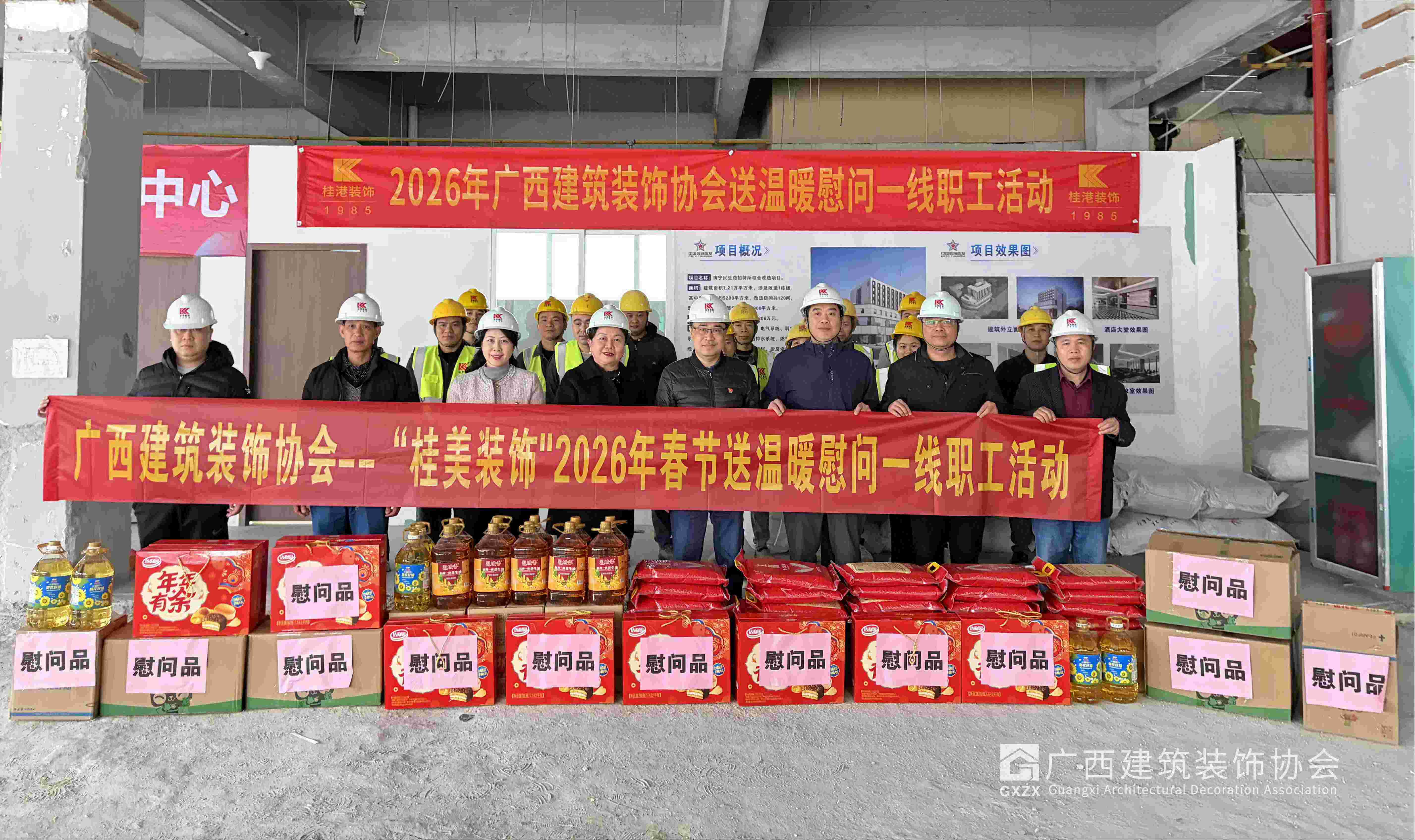 2026年2月10日,在新春佳节来临之际,协会黄榆副会长、陈雪玲秘书长一行来到副会长单位广西桂港装饰~南宁民生路招待所综合改造项目装修工地,看望慰问现在奋战在一线公司员工及产业工人,为他们送上慰问品和新春祝福,并考察了解项目施工进展情况。