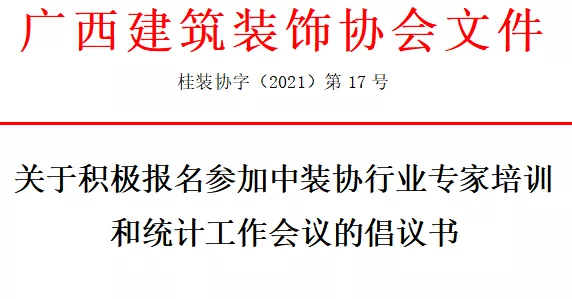 为贯彻落实“十四五”规划高质量发展要求,把科技自立自强作为国家发展的战略支撑,不断提高行业专家综合素质和业务水平,交流行业发展动态,更好地推动行业科技进步,完成好行业重大项目论证、质量检查、企业综合数据统计等业内重大活动,中国建筑装饰协会决定于2021年4月23日在北京举办行业专家交流培训会。参会人员包括:中装协领导、各省、自治区、直辖市装饰协会会长或秘书长、中装协专家、企业技术质量负责人、申报装饰奖负责人、统计负责人。