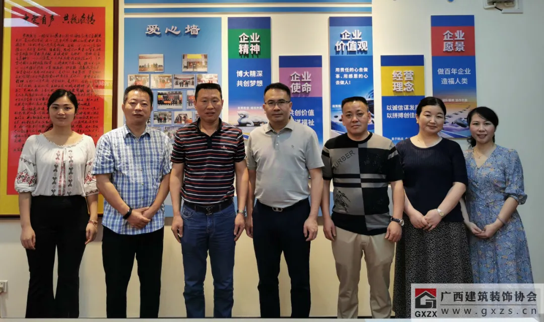 协会一行(副会长:左一杨景忠、左二朱建宇、右三黄闪、右二李震海)与广西渱钰川装饰工程有限公司总经理李灵(左三)合影