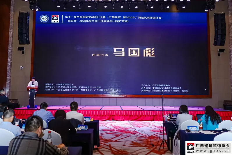第十一届中国国际空间设计大赛(广西赛区)公共建筑装饰设计类评审组组长、广西艺术学院副教授马国彪作为 评委代表发言,他详细介绍了本次赛事的组织情况和评审情况,本次广西赛区的评选活动分为公共建筑装饰设计类、居住空间设计类以及高校师生类三个组别进行评选,每个组别由3名业内知名专家组成评审组。经过9位评委细致、严谨、公正的评审,最终评选出三个组别的各级获奖作品。