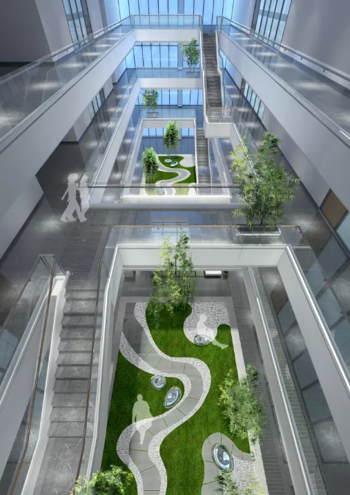 “将绿色生态环境融入智能化办公空间”是这次设计的核心理念,模糊室内外的空间界限,将景观设计与建筑室内相结合。打造出一种全新的办公空间模式——它是对人性化办公模式的探索,是办公、自然与空间三者的完美融合。设计在于关注人与人、自然和空间的关系,是一种氛围,而非空间本身的实体感。将生态环境的理念纳入到设计之中,并在环保的基础上完成对办公空间的设计。在美化空间的同时,满足人们对室内办公的各种条件,让人们犹如置身于宁静的自然花园中,在紧张的工作中身心得到放松。再搭以智能一体化的办公设施,能够合理的规划办公资源,成为一个集绿色生态环境和专业办公空间的综合空间。改变了传统的办公模式,达到便捷办公生活,丰富办公空间体验。