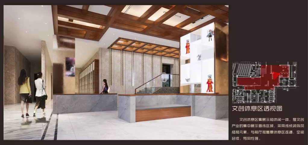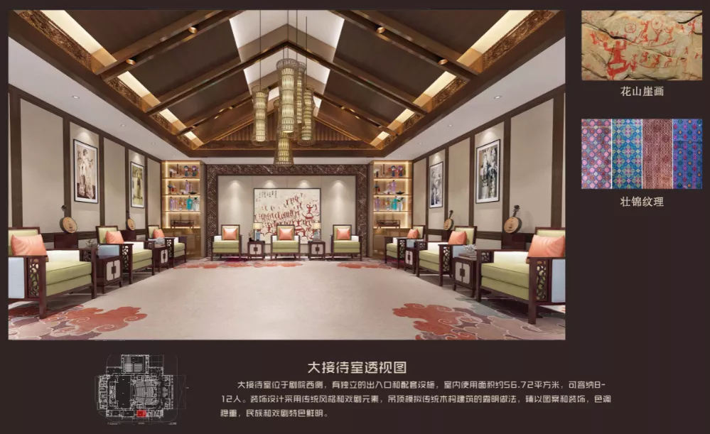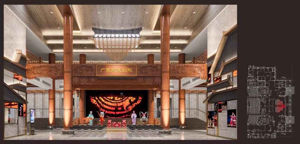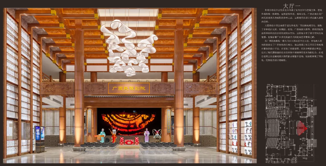 本项目的设计出发点充分考虑了室内空间与建筑主体、建筑外观的统一协调性,延续建筑外观、地域文化、广西古戏台及广西民族戏剧人物剪影的多种元素,运用现代的设计手法融入到室内空间。大堂的设计理念来源于建筑外观及广西民族地域文化,提取了多种设计元素,如铜鼓、壮锦、广西戏剧人物等,再利用装饰造型和材料的结合应用到室内空间,这样既丰富了整个空间的视觉感,也象征着广西多民族融合共同走向艺术繁荣之路。从广西民族剧院一楼大门步入到双层中空大堂,首先映入眼帘的是结合了广西特色的古戏台,戏台的设计却又不同于传统戏台繁杂的设计手法,而采取了高低错落,层次分明的设计理念,运用了现代感极强的仿古拉丝铜不锈钢和传统木饰的结合,在戏台屋顶上以金属戏剧人物剪影点缀整个空间,较好的体现了国际化、民族化的设计前瞻性。